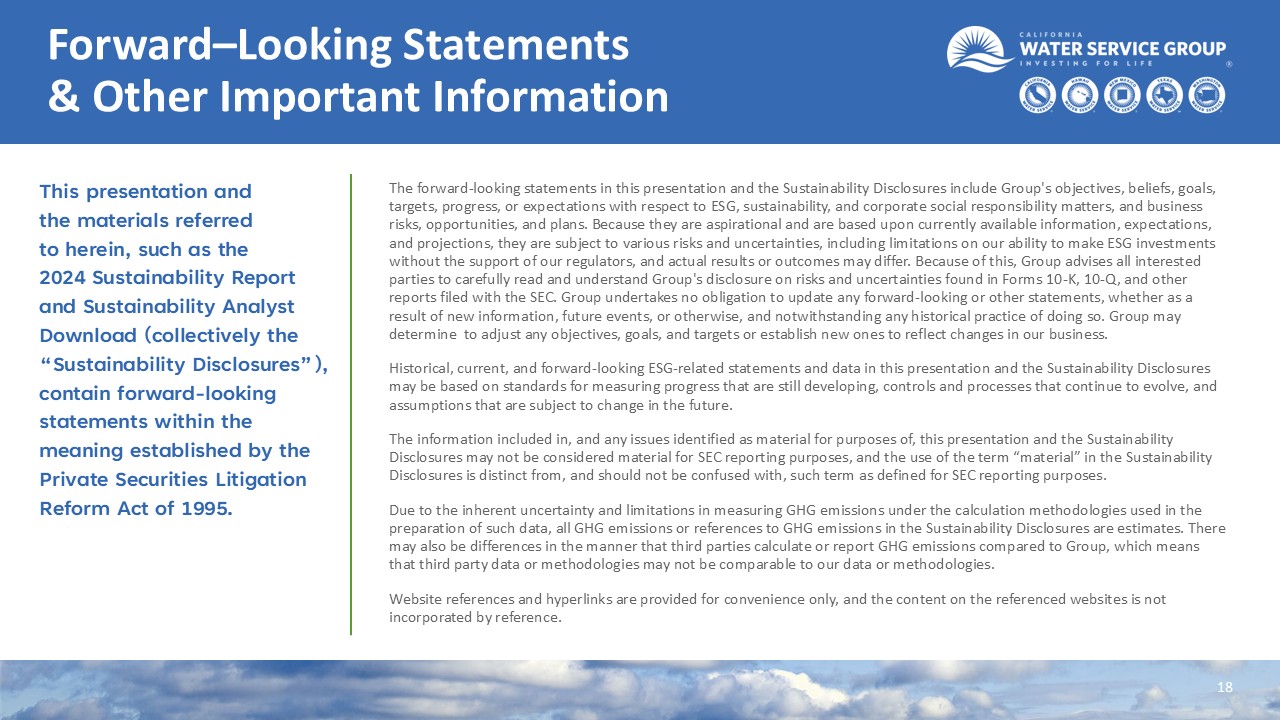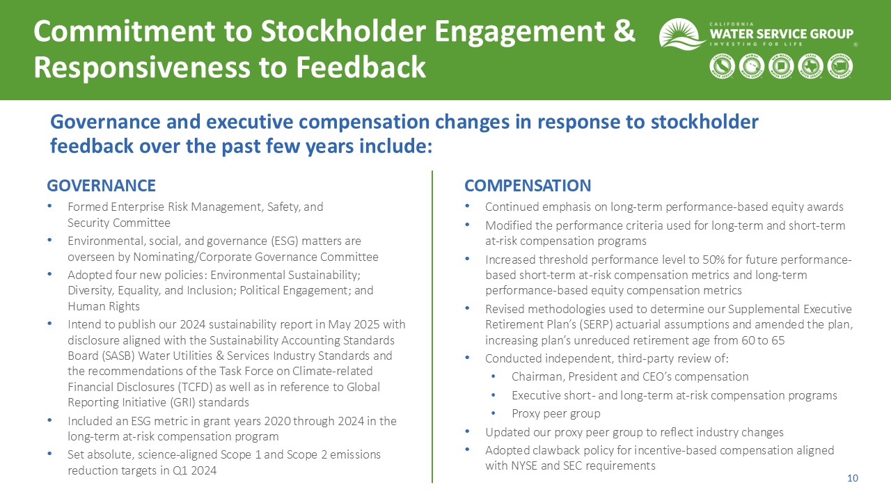 Sustainability Highlights ESG Program Highlights Annual framework - aligned reporting on sustainability topics most significant to the business* * Full Sustainability reports and data downloads may be accessed at https://www.calwatergroup.com . ESG - related metrics integrated into performance - based at - risk compensation programs Top - to - bottom ESG governance framework and policies Robust greenhouse gas disclosures and climate change strategy Short and long - term ESG goals integrated into strategic planning process • In 2024, we spent almost $3 million on emission - reducing energy solutions, such as LED lighting retrofits, EV charger installations, and new HVAC controls. We have almost $1 million in planned spending as we pursue projects like onsite solar contracts, with installation beginning in 2025 • In 2024, we established a fleet standard for management vehicles and a study to evaluate our infrastructure needs for vehicle charging. We also developed a roadmap to replace older vehicles with EVs and hybrids. • In 2024, 2.5% of water delivered to customers was recycled • We have completed a compliance assessment and are implementing our plan to meet California’s 2027 water - use targets 2024 Progress in Key Focus Areas 9 Annual Sustainability Report Our annual sustainability reports and other relevant documents, like our CDP Climate Change questionnaire response, are available at www.calwatergroup.com. Our annual sustainability reports align with the Sustainability Accounting Standards Board (SASB) Water Utilities and Services Industry Standard, leverage the guidance of the Task Force on Climate - related Financial Disclosures (TCFD), and reference the 2021 Global Reporting Initiative (GRI) Universal Standards. We expect to publish our 2024 Sustainability Report and 2024 Sustainability Analyst Download, covering our activities from January 1, 2024, to December 31, 2024, in May 2025.