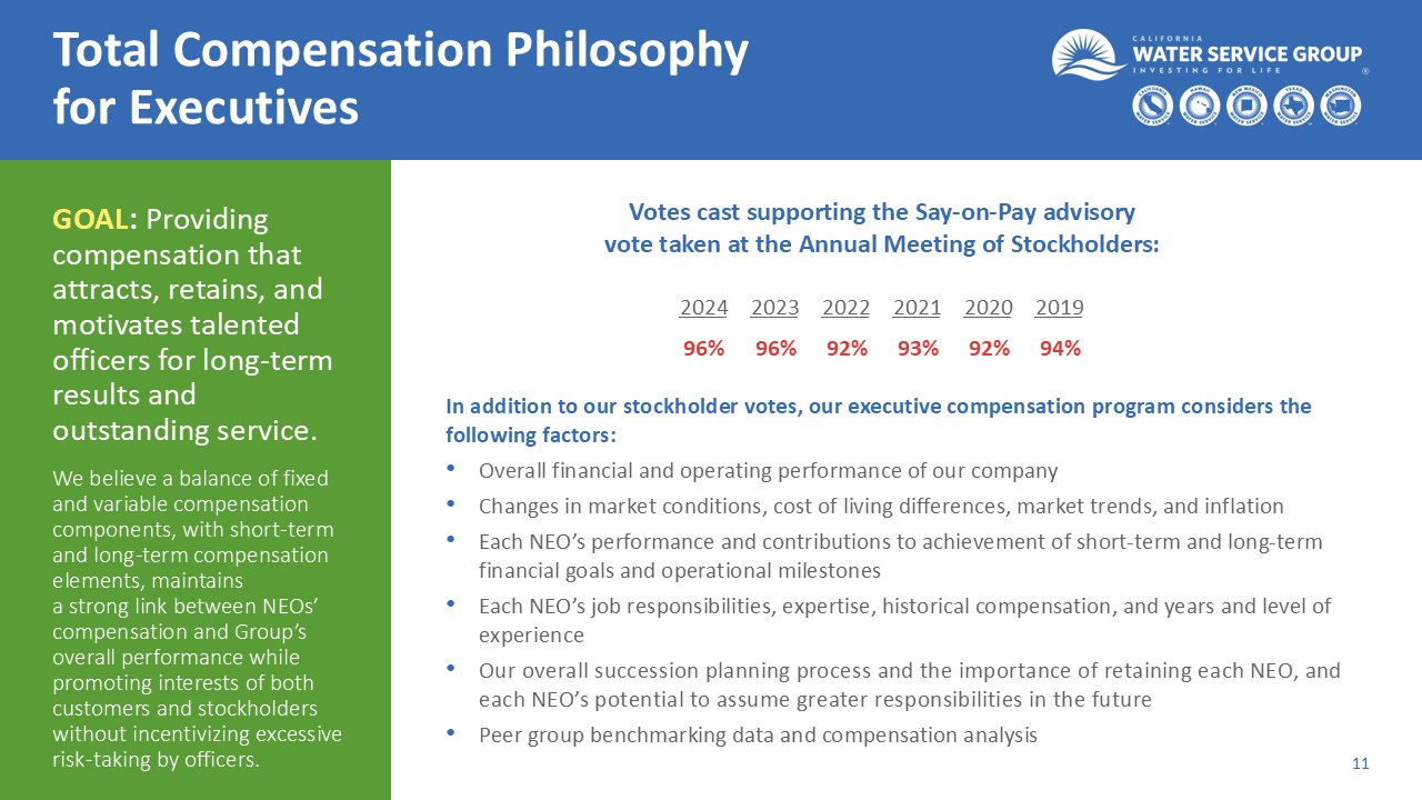COMPENSATION • Continued emphasis on long - term performance - based equity awards • Modified the performance criteria used for long - term and short - term at - risk compensation programs • Increased threshold performance level to 50% for future performance - based short - term at - risk compensation metrics and long - term performance - based equity compensation metrics • Revised methodologies used to determine our Supplemental Executive Retirement Plan’s (SERP) actuarial assumptions and amended the plan, increasing plan’s unreduced retirement age from 60 to 65 • Conducted independent, third - party review of: • Chairman, President and CEO’s compensation • Executive short - and long - term at - risk compensation programs • Proxy peer group • Updated our proxy peer group to reflect industry changes • Adopted clawback policy for incentive - based compensation aligned with NYSE and SEC requirements GOVERNANCE • Formed Enterprise Risk Management, Safety, and Security Committee • Environmental, social, and governance (ESG) matters are overseen by Nominating/Corporate Governance Committee • Adopted four new policies: Environmental Sustainability; Diversity, Equality, and Inclusion; Political Engagement; and Human Rights • Intend to publish our 2024 sustainability report in May 2025 with disclosure aligned with the Sustainability Accounting Standards Board (SASB) Water Utilities & Services Industry Standards and the recommendations of the Task Force on Climate - related Financial Disclosures (TCFD) as well as in reference to Global Reporting Initiative (GRI) standards • Included an ESG metric in grant years 2020 through 2024 in the long - term at - risk compensation program • Set absolute, science - aligned Scope 1 and Scope 2 emissions reduction targets in Q1 2024 10 Governance and executive compensation changes in response to stockholder feedback over the past few years include: Commitment to Stockholder Engagement & Responsiveness to Feedback 10