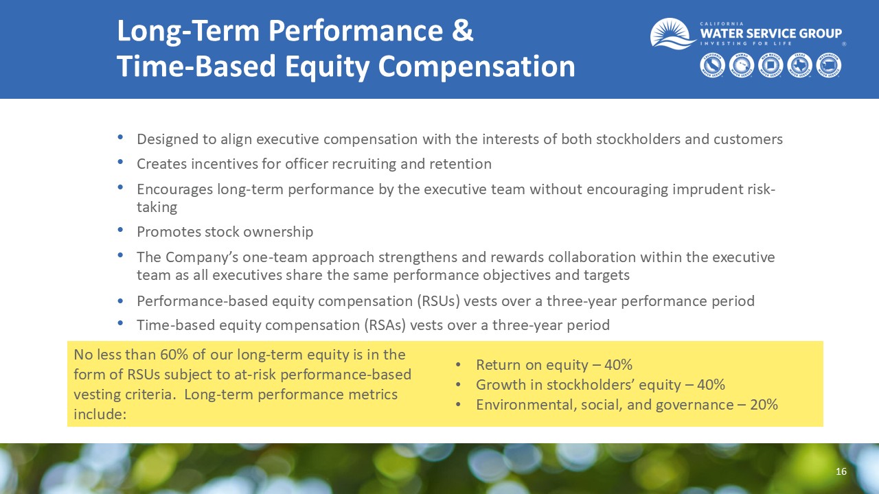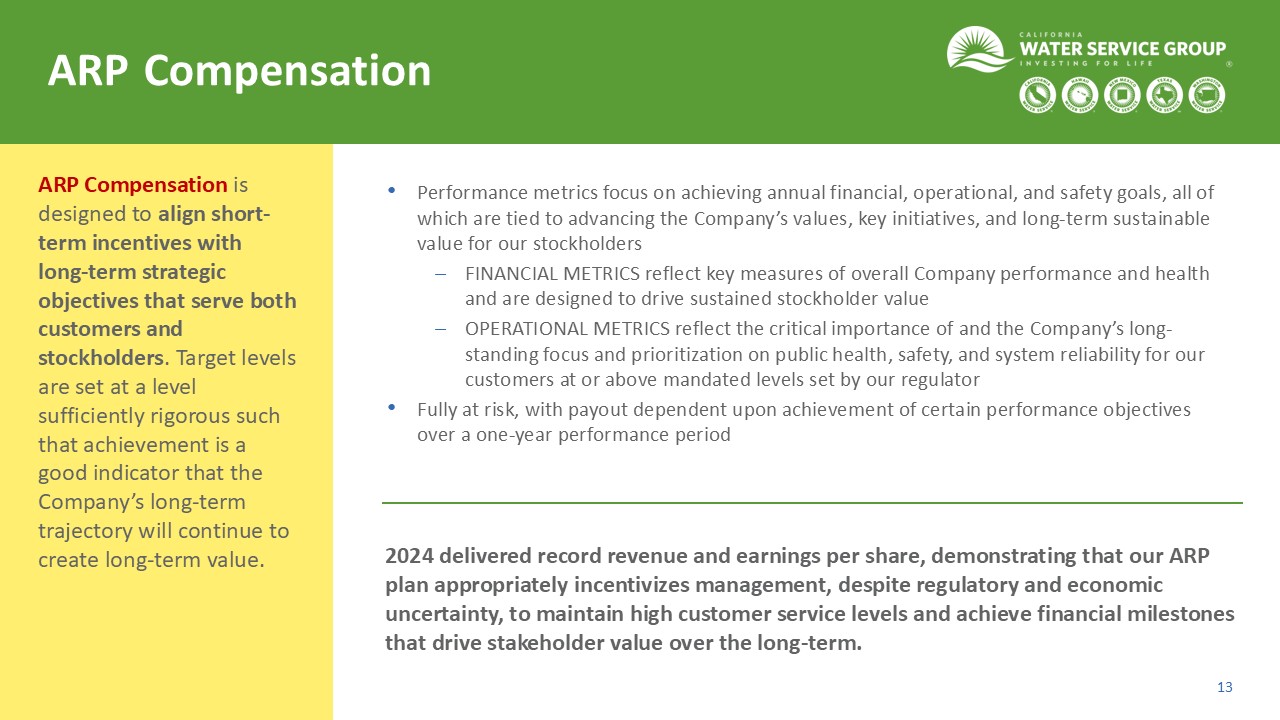 ARP Compensation is designed to align short - term incentives with long - term strategic objectives that serve both customers and stockholders . Target levels are set at a level sufficiently rigorous such that achievement is a good indicator that the Company’s long - term trajectory will continue to create long - term value. ARP Compensation • Performance metrics focus on achieving annual financial, operational, and safety goals, all of which are tied to advancing the Company’s values, key initiatives, and long - term sustainable value for our stockholders ꟷ FINANCIAL METRICS reflect key measures of overall Company performance and health and are designed to drive sustained stockholder value ꟷ OPERATIONAL METRICS reflect the critical importance of and the Company’s long - standing focus and prioritization on public health, safety, and system reliability for our customers at or above mandated levels set by our regulator • Fully at risk, with payout dependent upon achievement of certain performance objectives over a one - year performance period 13 2024 delivered record revenue and earnings per share, demonstrating that our ARP plan appropriately incentivizes management, despite regulatory and economic uncertainty, to maintain high customer service levels and achieve financial milestones that drive stakeholder value over the long - term.