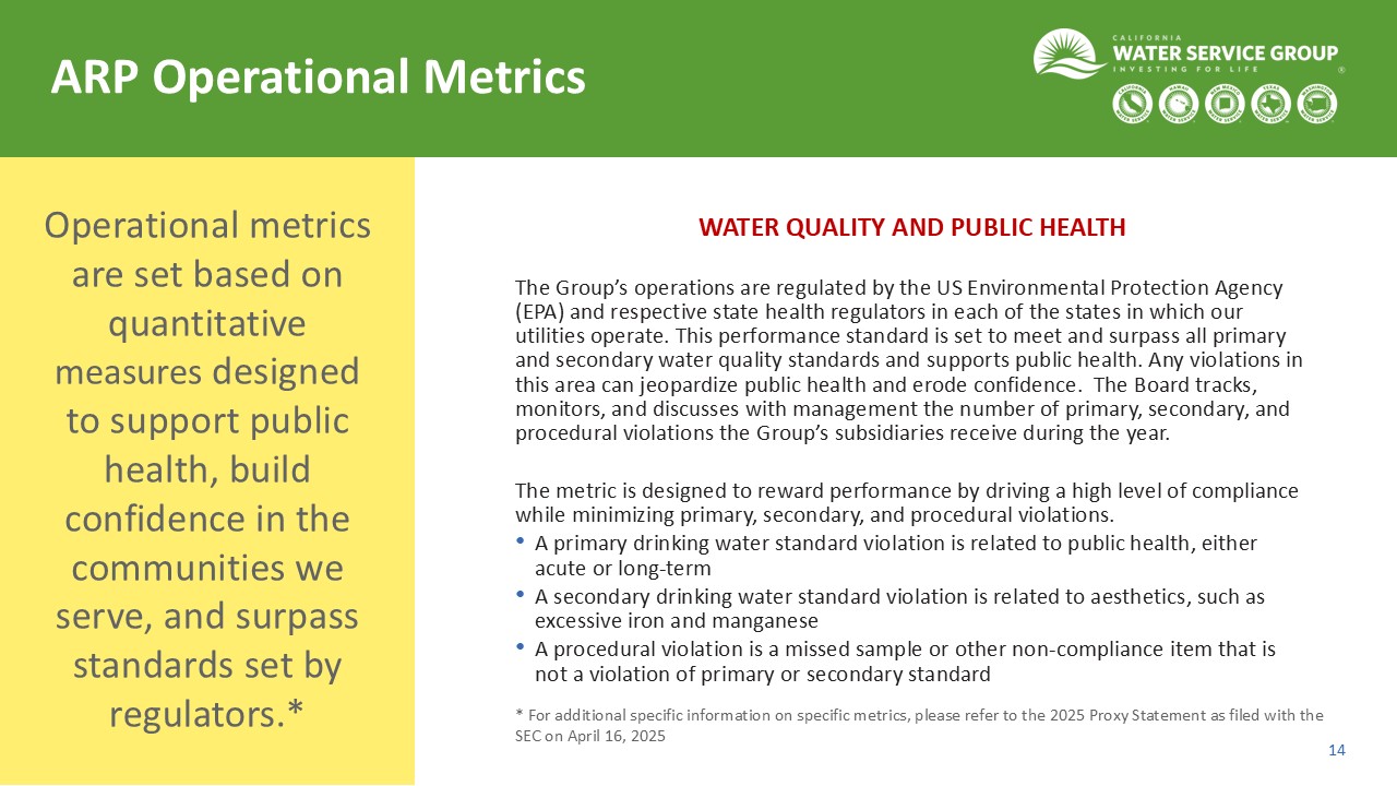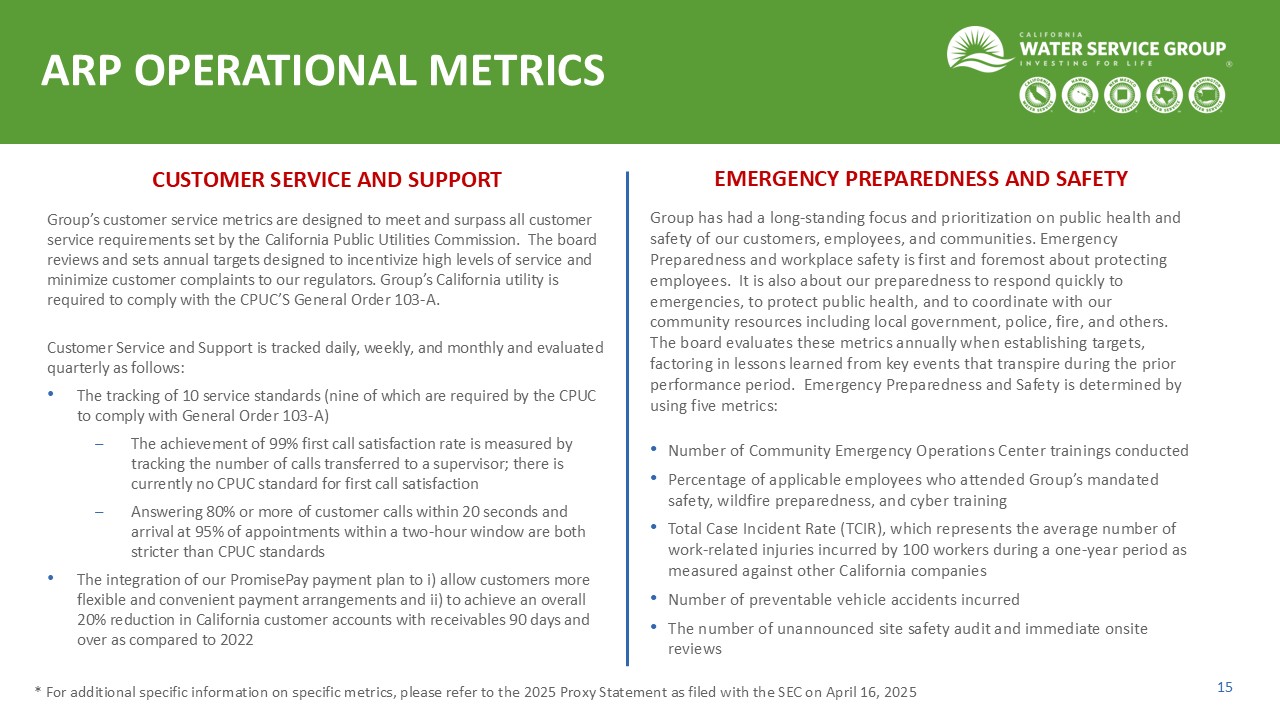 WATER QUALITY AND PUBLIC HEALTH The Group’s operations are regulated by the US Environmental Protection Agency (EPA) and respective state health regulators in each of the states in which our utilities operate. This performance standard is set to meet and surpass all primary and secondary water quality standards and supports public health. Any violations in this area can jeopardize public health and erode confidence. The Board tracks, monitors, and discusses with management the number of primary, secondary, and procedural violations the Group’s subsidiaries receive during the year. The metric is designed to reward performance by driving a high level of compliance while minimizing primary, secondary, and procedural violations. • A primary drinking water standard violation is related to public health, either acute or long - term • A secondary drinking water standard violation is related to aesthetics, such as excessive iron and manganese • A procedural violation is a missed sample or other non - compliance item that is not a violation of primary or secondary standard ARP Operational Metrics 14 * For additional specific information on specific metrics, please refer to the 2025 Proxy Statement as filed with the SEC on April 16, 2025 Operational metrics are set based on quantitative measures designed to support public health, build confidence in the communities we serve, and surpass standards set by regulators.* 14
