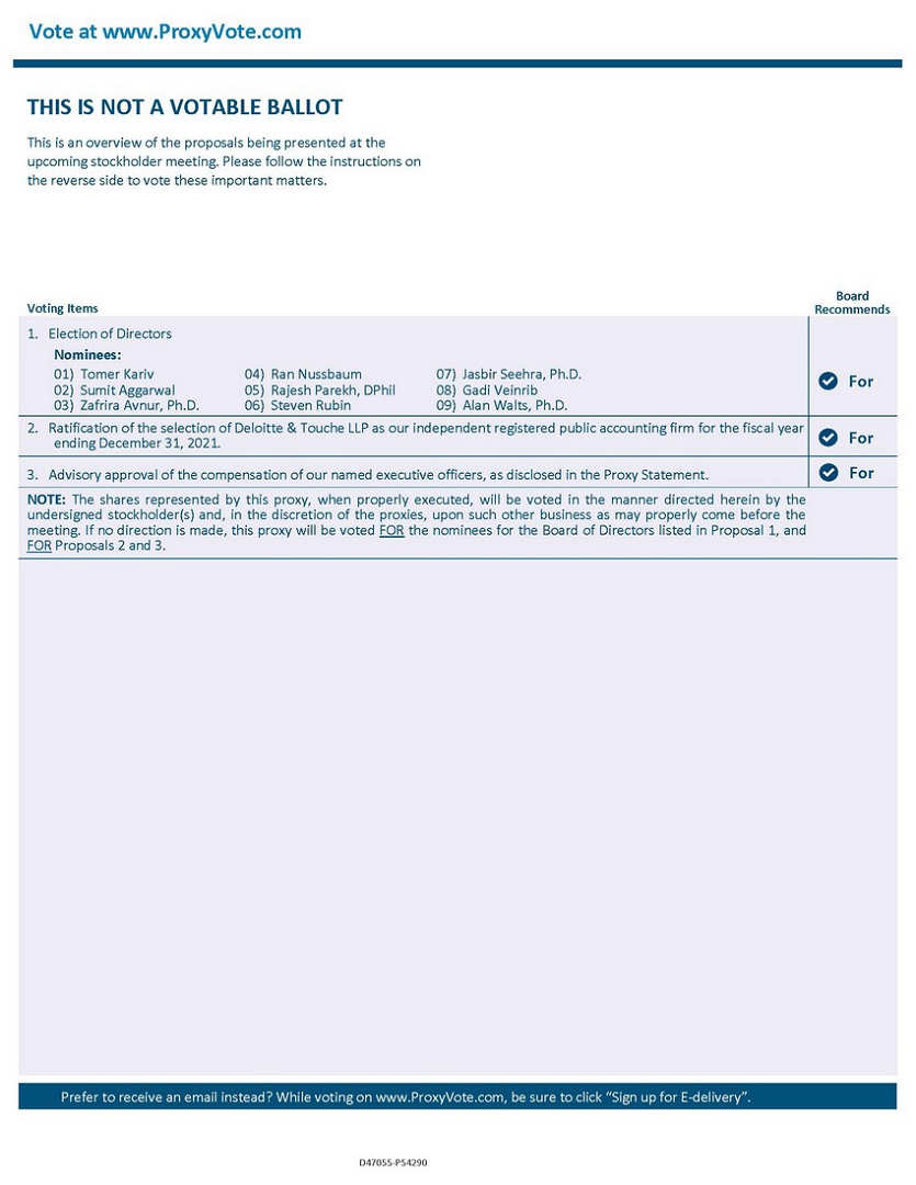 Vote at www.ProxyVote.com THIS IS NOT A VOTABLE BALLOT This is an overview of the proposals being presented at the upcoming stockholder meeting. Please follow the instructions on the reverse side to vote these important matters. Voting Items Board Recommends Prefer to receive an email instead? While voting on www.ProxyVote.com, be sure to click "Sign up for E-delivery". 1. Election of Directors Nominees: 01) Tomer Kariv 04) Ran Nussbaum 07) Jasbir Seehra, Ph.D. 02) Sumit Aggarwal 05) Rajesh Parekh, DPhil 08) Gadi Veinrib 03) Zafrira Avnur, Ph.D. 06) Steven Rubin 09) Alan Walts, Ph.D. 2. Ratification of the selection of Deloitte Touche LLP as our independent registered public accounting firm for the fiscal year ending December 31, 2021. 3. Advisory approval of the compensation of our named executive officers, as disclosed in the Proxy Statement. NOTE: The shares represented by this proxy, when properly executed, will be voted in the manner directed herein by the undersigned stockholder(s) and, in the discretion of the proxies, upon such other business as may properly come before the meeting. If no direction is made, this proxy will be voted FOR the nominees for the Board of Directors listed in Proposal 1, and FOR Proposals 2 and 3.