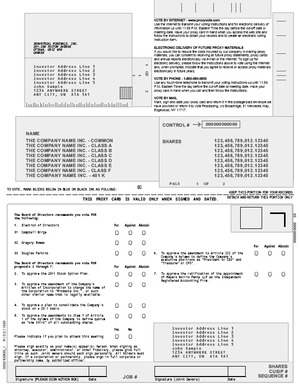 You are invited to attend the 2011 Annual and Special Meeting of Industrial Minerals, Inc. (“Industrial” or the “Company”), which will be held at the offices of the Company at Suite 201, 290 Picton Ave., Ottawa, Ontario, Canada K1Z 8P8 at 11 am Eastern Standard Time on June 29, 2011.
