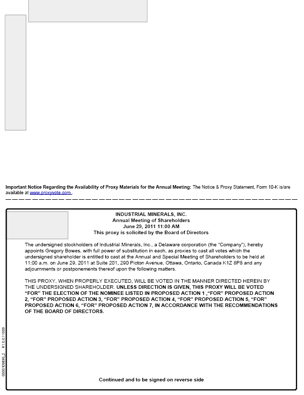 You are invited to attend the 2011 Annual and Special Meeting of Stockholders (the “Annual Meeting”) of Industrial Minerals, Inc. (the “Company”). The Annual Meeting will be held at offices of the Company at Suite 201, 290 Picton Ave., Ottawa, Ontario, Canada K1Z 8P8 at 11am Eastern Standard Time on June 29, 2011. The purposes of the meeting are: