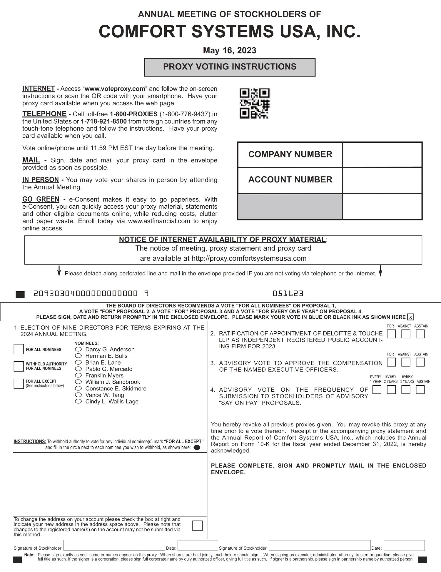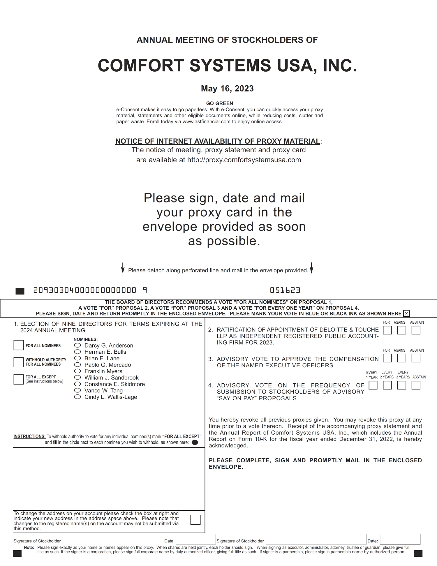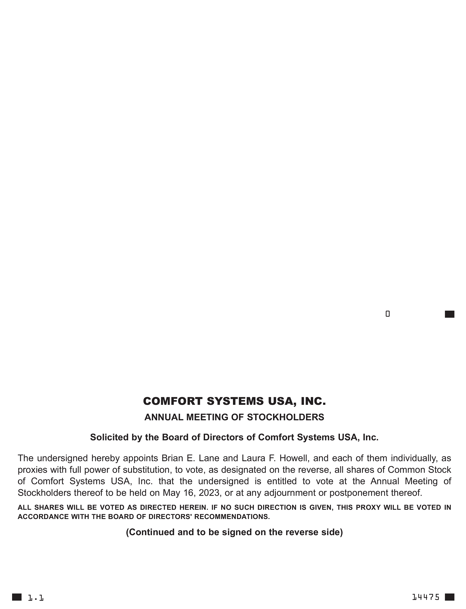 Important Notice Regarding the Availability of Proxy Materials for the Annual Meeting of Stockholders to Be Held on May 16, 2023. This proxy statement and the 2022 Annual Report are available at http://proxy.comfortsystemsusa.com. |