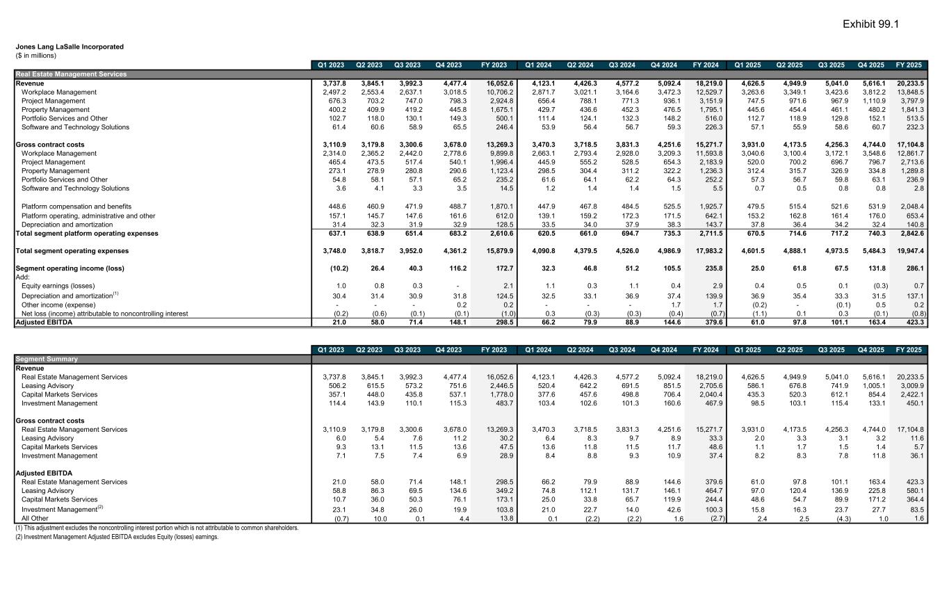Jones Lang LaSalle Incorporated ($ in millions) Q1 2023 Q2 2023 Q3 2023 Q4 2023 FY 2023 Q1 2024 Q2 2024 Q3 2024 Q4 2024 FY 2024 Q1 2025 Q2 2025 Q3 2025 Q4 2025 FY 2025 Real Estate Management Services Revenue 3,737.8 3,845.1 3,992.3 4,477.4 16,052.6 4,123.1 4,426.3 4,577.2 5,092.4 18,219.0 4,626.5 4,949.9 5,041.0 5,616.1 20,233.5 Workplace Management 2,497.2 2,553.4 2,637.1 3,018.5 10,706.2 2,871.7 3,021.1 3,164.6 3,472.3 12,529.7 3,263.6 3,349.1 3,423.6 3,812.2 13,848.5 Project Management 676.3 703.2 747.0 798.3 2,924.8 656.4 788.1 771.3 936.1 3,151.9 747.5 971.6 967.9 1,110.9 3,797.9 Property Management 400.2 409.9 419.2 445.8 1,675.1 429.7 436.6 452.3 476.5 1,795.1 445.6 454.4 461.1 480.2 1,841.3 Portfolio Services and Other 102.7 118.0 130.1 149.3 500.1 111.4 124.1 132.3 148.2 516.0 112.7 118.9 129.8 152.1 513.5 Software and Technology Solutions 61.4 60.6 58.9 65.5 246.4 53.9 56.4 56.7 59.3 226.3 57.1 55.9 58.6 60.7 232.3 Gross contract costs 3,110.9 3,179.8 3,300.6 3,678.0 13,269.3 3,470.3 3,718.5 3,831.3 4,251.6 15,271.7 3,931.0 4,173.5 4,256.3 4,744.0 17,104.8 Workplace Management 2,314.0 2,365.2 2,442.0 2,778.6 9,899.8 2,663.1 2,793.4 2,928.0 3,209.3 11,593.8 3,040.6 3,100.4 3,172.1 3,548.6 12,861.7 Project Management 465.4 473.5 517.4 540.1 1,996.4 445.9 555.2 528.5 654.3 2,183.9 520.0 700.2 696.7 796.7 2,713.6 Property Management 273.1 278.9 280.8 290.6 1,123.4 298.5 304.4 311.2 322.2 1,236.3 312.4 315.7 326.9 334.8 1,289.8 Portfolio Services and Other 54.8 58.1 57.1 65.2 235.2 61.6 64.1 62.2 64.3 252.2 57.3 56.7 59.8 63.1 236.9 Software and Technology Solutions 3.6 4.1 3.3 3.5 14.5 1.2 1.4 1.4 1.5 5.5 0.7 0.5 0.8 0.8 2.8 Platform compensation and benefits 448.6 460.9 471.9 488.7 1,870.1 447.9 467.8 484.5 525.5 1,925.7 479.5 515.4 521.6 531.9 2,048.4 Platform operating, administrative and other 157.1 145.7 147.6 161.6 612.0 139.1 159.2 172.3 171.5 642.1 153.2 162.8 161.4 176.0 653.4 Depreciation and amortization 31.4 32.3 31.9 32.9 128.5 33.5 34.0 37.9 38.3 143.7 37.8 36.4 34.2 32.4 140.8 Total segment platform operating expenses 637.1 638.9 651.4 683.2 2,610.6 620.5 661.0 694.7 735.3 2,711.5 670.5 714.6 717.2 740.3 2,842.6 Total segment operating expenses 3,748.0 3,818.7 3,952.0 4,361.2 15,879.9 4,090.8 4,379.5 4,526.0 4,986.9 17,983.2 4,601.5 4,888.1 4,973.5 5,484.3 19,947.4 Segment operating income (loss) (10.2) 26.4 40.3 116.2 172.7 32.3 46.8 51.2 105.5 235.8 25.0 61.8 67.5 131.8 286.1 Add: Equity earnings (losses) 1.0 0.8 0.3 - 2.1 1.1 0.3 1.1 0.4 2.9 0.4 0.5 0.1 (0.3) 0.7 Depreciation and amortization(1) 30.4 31.4 30.9 31.8 124.5 32.5 33.1 36.9 37.4 139.9 36.9 35.4 33.3 31.5 137.1 Other income (expense) - - - 0.2 0.2 - - - 1.7 1.7 (0.2) - (0.1) 0.5 0.2 Net loss (income) attributable to noncontrolling interest (0.2) (0.6) (0.1) (0.1) (1.0) 0.3 (0.3) (0.3) (0.4) (0.7) (1.1) 0.1 0.3 (0.1) (0.8) Adjusted EBITDA 21.0 58.0 71.4 148.1 298.5 66.2 79.9 88.9 144.6 379.6 61.0 97.8 101.1 163.4 423.3 Q1 2023 Q2 2023 Q3 2023 Q4 2023 FY 2023 Q1 2024 Q2 2024 Q3 2024 Q4 2024 FY 2024 Q1 2025 Q2 2025 Q3 2025 Q4 2025 FY 2025 Segment Summary Revenue Real Estate Management Services 3,737.8 3,845.1 3,992.3 4,477.4 16,052.6 4,123.1 4,426.3 4,577.2 5,092.4 18,219.0 4,626.5 4,949.9 5,041.0 5,616.1 20,233.5 Leasing Advisory 506.2 615.5 573.2 751.6 2,446.5 520.4 642.2 691.5 851.5 2,705.6 586.1 676.8 741.9 1,005.1 3,009.9 Capital Markets Services 357.1 448.0 435.8 537.1 1,778.0 377.6 457.6 498.8 706.4 2,040.4 435.3 520.3 612.1 854.4 2,422.1 Investment Management 114.4 143.9 110.1 115.3 483.7 103.4 102.6 101.3 160.6 467.9 98.5 103.1 115.4 133.1 450.1 Gross contract costs Real Estate Management Services 3,110.9 3,179.8 3,300.6 3,678.0 13,269.3 3,470.3 3,718.5 3,831.3 4,251.6 15,271.7 3,931.0 4,173.5 4,256.3 4,744.0 17,104.8 Leasing Advisory 6.0 5.4 7.6 11.2 30.2 6.4 8.3 9.7 8.9 33.3 2.0 3.3 3.1 3.2 11.6 Capital Markets Services 9.3 13.1 11.5 13.6 47.5 13.6 11.8 11.5 11.7 48.6 1.1 1.7 1.5 1.4 5.7 Investment Management 7.1 7.5 7.4 6.9 28.9 8.4 8.8 9.3 10.9 37.4 8.2 8.3 7.8 11.8 36.1 Adjusted EBITDA Real Estate Management Services 21.0 58.0 71.4 148.1 298.5 66.2 79.9 88.9 144.6 379.6 61.0 97.8 101.1 163.4 423.3 Leasing Advisory 58.8 86.3 69.5 134.6 349.2 74.8 112.1 131.7 146.1 464.7 97.0 120.4 136.9 225.8 580.1 Capital Markets Services 10.7 36.0 50.3 76.1 173.1 25.0 33.8 65.7 119.9 244.4 48.6 54.7 89.9 171.2 364.4 Investment Management(2) 23.1 34.8 26.0 19.9 103.8 21.0 22.7 14.0 42.6 100.3 15.8 16.3 23.7 27.7 83.5 All Other (0.7) 10.0 0.1 4.4 13.8 0.1 (2.2) (2.2) 1.6 (2.7) 2.4 2.5 (4.3) 1.0 1.6 (1) This adjustment excludes the noncontrolling interest portion which is not attributable to common shareholders. (2) Investment Management Adjusted EBITDA excludes Equity (losses) earnings.