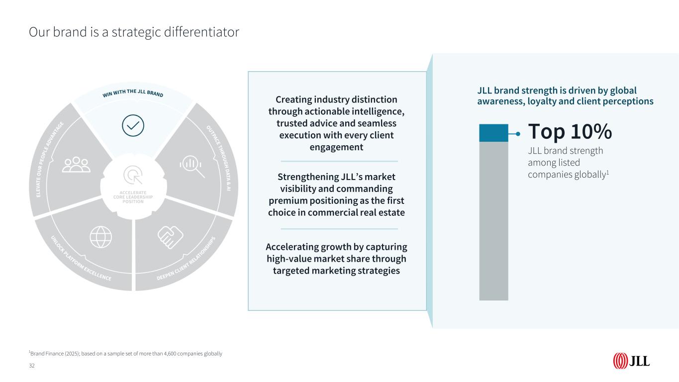 31 Highly-engaged workforce drives strong culture Top Quartile Employee engagement, last 3 years1 93% Producer retention, Leasing Advisory and Capital Markets Services2 90% Top talent retention, JLL globally2 113,000+ Employees worldwide 1 Relative to global Qualtrics benchmark 2 Reflects last 3 years, 2023 – 2025 Together, as One JLL, we strive to be exceptional and shape a better world. Our culture helps our people thrive, grow meaningful careers, find a place to belong, and celebrate wins. “Reshaping talent experiences through strategies to redefine performance and productivity Amplifying workforce intelligence to align jobs and skills with client needs for the future Preserving and evolving culture as competitive advantage Our people and distinctive culture are central to our success