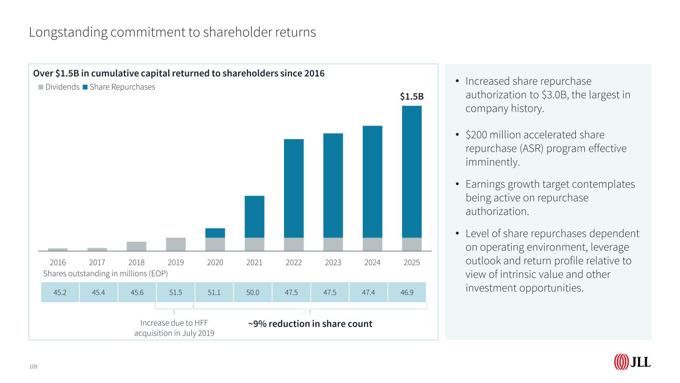 2016 2017 2018 2019 2020 2021 2022 2023 2024 2025 Dividends Share Repurchases Longstanding commitment to shareholder returns 109 Over $1.5B in cumulative capital returned to shareholders since 2016 • Increased share repurchase authorization to $3.0B, the largest in company history. • $200 million accelerated share repurchase (ASR) program effective imminently. • Earnings growth target contemplates being active on repurchase authorization. • Level of share repurchases dependent on operating environment, leverage outlook and return profile relative to view of intrinsic value and other investment opportunities.45.2 45.4 45.6 51.5 51.1 50.0 47.5 47.5 47.4 46.9 Shares outstanding in millions (EOP) Increase due to HFF acquisition in July 2019 ~9% reduction in share count $1.5B