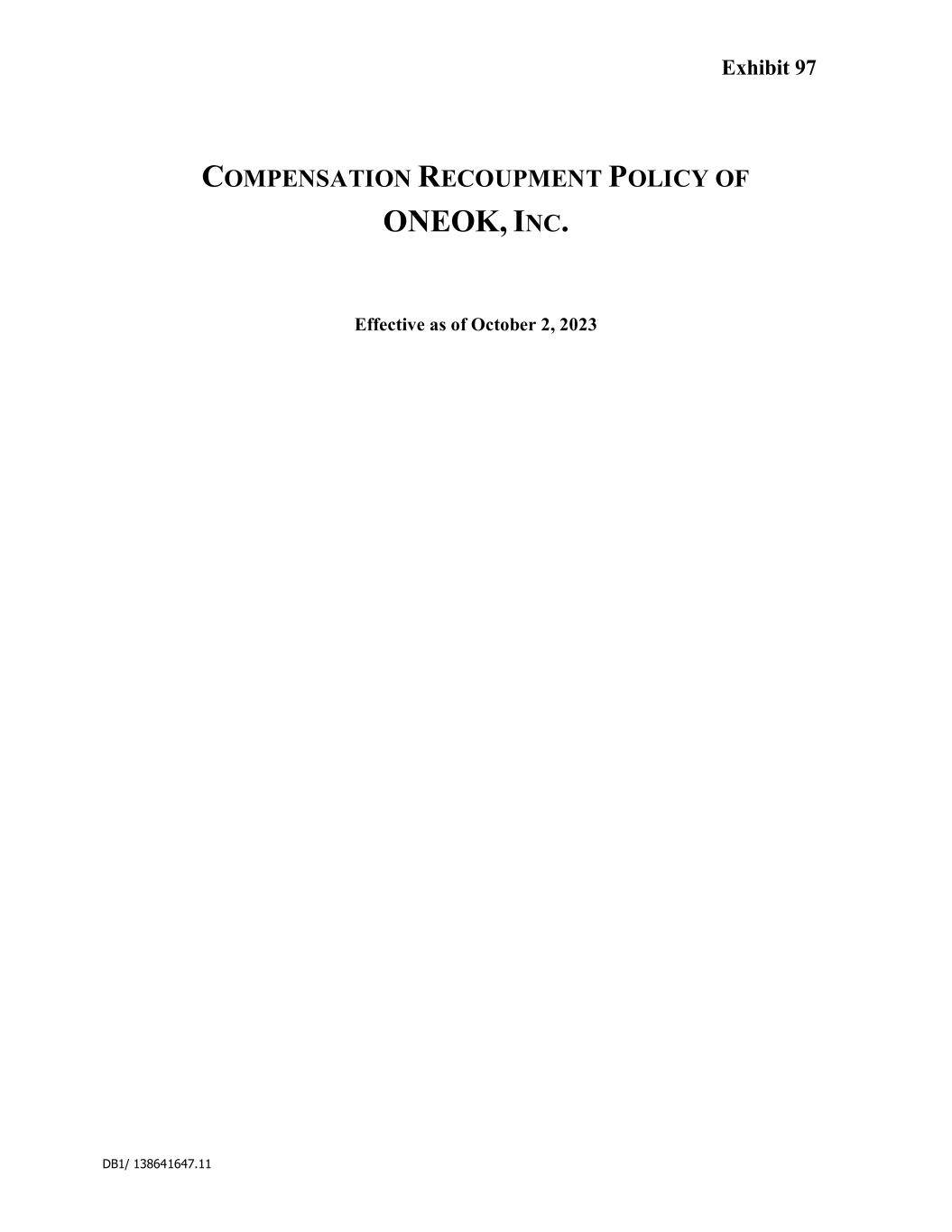 DB1/ 138641647.11 COMPENSATION RECOUPMENT POLICY OF ONEOK, INC. Effective as of October 2, 2023 Exhibit 97