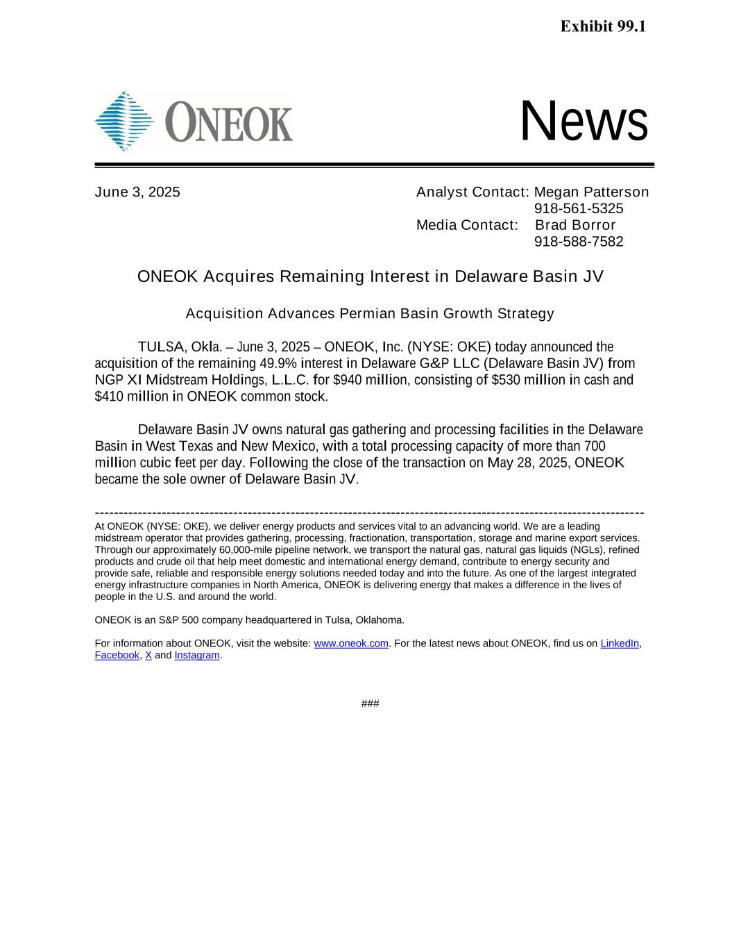 News ONEOK Acquires Remaining Interest in Delaware Basin JV Acquisition Advances Permian Basin Growth Strategy TULSA, Okla. – June 3, 2025 – ONEOK, Inc. (NYSE: OKE) today announced the acquisition of the remaining 49.9% interest in Delaware G&P LLC (Delaware Basin JV) from NGP XI Midstream Holdings, L.L.C. for $940 million, consisting of $530 million in cash and $410 million in ONEOK common stock. Delaware Basin JV owns natural gas gathering and processing facilities in the Delaware Basin in West Texas and New Mexico, with a total processing capacity of more than 700 million cubic feet per day. Following the close of the transaction on May 28, 2025, ONEOK became the sole owner of Delaware Basin JV. ------------------------------------------------------------------------------------------------------------------- At ONEOK (NYSE: OKE), we deliver energy products and services vital to an advancing world. We are a leading midstream operator that provides gathering, processing, fractionation, transportation, storage and marine export services. Through our approximately 60,000-mile pipeline network, we transport the natural gas, natural gas liquids (NGLs), refined products and crude oil that help meet domestic and international energy demand, contribute to energy security and provide safe, reliable and responsible energy solutions needed today and into the future. As one of the largest integrated energy infrastructure companies in North America, ONEOK is delivering energy that makes a difference in the lives of people in the U.S. and around the world. ONEOK is an S&P 500 company headquartered in Tulsa, Oklahoma. For information about ONEOK, visit the website: www.oneok.com. For the latest news about ONEOK, find us on LinkedIn, Facebook, X and Instagram. ### June 3, 2025 Analyst Contact: Megan Patterson 918-561-5325 Media Contact: Brad Borror 918-588-7582