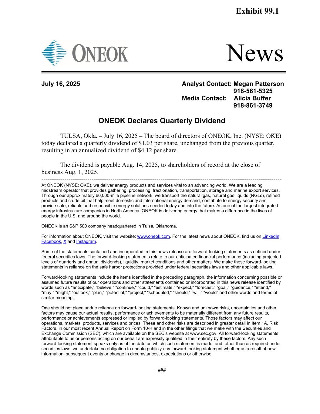 News ONEOK Declares Quarterly Dividend TULSA, Okla. – July 16, 2025 – The board of directors of ONEOK, Inc. (NYSE: OKE) today declared a quarterly dividend of $1.03 per share, unchanged from the previous quarter, resulting in an annualized dividend of $4.12 per share. The dividend is payable Aug. 14, 2025, to shareholders of record at the close of business Aug. 1, 2025. ------------------------------------------------------------------------------------------------------------------- At ONEOK (NYSE: OKE), we deliver energy products and services vital to an advancing world. We are a leading midstream operator that provides gathering, processing, fractionation, transportation, storage and marine export services. Through our approximately 60,000-mile pipeline network, we transport the natural gas, natural gas liquids (NGLs), refined products and crude oil that help meet domestic and international energy demand, contribute to energy security and provide safe, reliable and responsible energy solutions needed today and into the future. As one of the largest integrated energy infrastructure companies in North America, ONEOK is delivering energy that makes a difference in the lives of people in the U.S. and around the world. ONEOK is an S&P 500 company headquartered in Tulsa, Oklahoma. For information about ONEOK, visit the website: www.oneok.com. For the latest news about ONEOK, find us on LinkedIn, Facebook, X and Instagram. Some of the statements contained and incorporated in this news release are forward-looking statements as defined under federal securities laws. The forward-looking statements relate to our anticipated financial performance (including projected levels of quarterly and annual dividends), liquidity, market conditions and other matters. We make these forward-looking statements in reliance on the safe harbor protections provided under federal securities laws and other applicable laws. Forward-looking statements include the items identified in the preceding paragraph, the information concerning possible or assumed future results of our operations and other statements contained or incorporated in this news release identified by words such as "anticipate," "believe," "continue," "could," "estimate," "expect," "forecast," "goal," "guidance," "intend," "may," "might," “outlook,” "plan," "potential," "project," "scheduled," "should," "will," "would" and other words and terms of similar meaning. One should not place undue reliance on forward-looking statements. Known and unknown risks, uncertainties and other factors may cause our actual results, performance or achievements to be materially different from any future results, performance or achievements expressed or implied by forward-looking statements. Those factors may affect our operations, markets, products, services and prices. These and other risks are described in greater detail in Item 1A, Risk Factors, in our most recent Annual Report on Form 10-K and in the other filings that we make with the Securities and Exchange Commission (SEC), which are available on the SEC’s website at www.sec.gov. All forward-looking statements attributable to us or persons acting on our behalf are expressly qualified in their entirety by these factors. Any such forward-looking statement speaks only as of the date on which such statement is made, and, other than as required under securities laws, we undertake no obligation to update publicly any forward-looking statement whether as a result of new information, subsequent events or change in circumstances, expectations or otherwise. ### July 16, 2025 Analyst Contact: Megan Patterson 918-561-5325 Media Contact: Alicia Buffer 918-861-3749