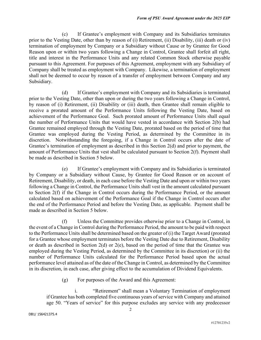 DB1/ 156421375.4 Form of PSU Award Agreement under the 2025 EIP 2 #12701235v2 (c) If Grantee’s employment with Company and its Subsidiaries terminates prior to the Vesting Date, other than by reason of (i) Retirement, (ii) Disability, (iii) death or (iv) termination of employment by Company or a Subsidiary without Cause or by Grantee for Good Reason upon or within two years following a Change in Control, Grantee shall forfeit all right, title and interest in the Performance Units and any related Common Stock otherwise payable pursuant to this Agreement. For purposes of this Agreement, employment with any Subsidiary of Company shall be treated as employment with Company. Likewise, a termination of employment shall not be deemed to occur by reason of a transfer of employment between Company and any Subsidiary. (d) If Grantee’s employment with Company and its Subsidiaries is terminated prior to the Vesting Date, other than upon or during the two years following a Change in Control, by reason of (i) Retirement, (ii) Disability or (iii) death, then Grantee shall remain eligible to receive a prorated amount of the Performance Units following the Vesting Date, based on achievement of the Performance Goal. Such prorated amount of Performance Units shall equal the number of Performance Units that would have vested in accordance with Section 2(b) had Grantee remained employed through the Vesting Date, prorated based on the period of time that Grantee was employed during the Vesting Period, as determined by the Committee in its discretion. Notwithstanding the foregoing, if a Change in Control occurs after the date of Grantee’s termination of employment as described in this Section 2(d) and prior to payment, the amount of Performance Units that vest shall be calculated pursuant to Section 2(f). Payment shall be made as described in Section 5 below. (e) If Grantee’s employment with Company and its Subsidiaries is terminated by Company or a Subsidiary without Cause, by Grantee for Good Reason or on account of Retirement, Disability, or death, in each case before the Vesting Date and upon or within two years following a Change in Control, the Performance Units shall vest in the amount calculated pursuant to Section 2(f) if the Change in Control occurs during the Performance Period, or the amount calculated based on achievement of the Performance Goal if the Change in Control occurs after the end of the Performance Period and before the Vesting Date, as applicable. Payment shall be made as described in Section 5 below. (f) Unless the Committee provides otherwise prior to a Change in Control, in the event of a Change in Control during the Performance Period, the amount to be paid with respect to the Performance Units shall be determined based on the greater of (i) the Target Award (prorated for a Grantee whose employment terminates before the Vesting Date due to Retirement, Disability or death as described in Section 2(d) or 2(e), based on the period of time that the Grantee was employed during the Vesting Period, as determined by the Committee in its discretion) or (ii) the number of Performance Units calculated for the Performance Period based upon the actual performance level attained as of the date of the Change in Control, as determined by the Committee in its discretion, in each case, after giving effect to the accumulation of Dividend Equivalents. (g) For purposes of the Award and this Agreement: i. “Retirement” shall mean a Voluntary Termination of employment if Grantee has both completed five continuous years of service with Company and attained age 50. “Years of service” for this purpose excludes any service with any predecessor