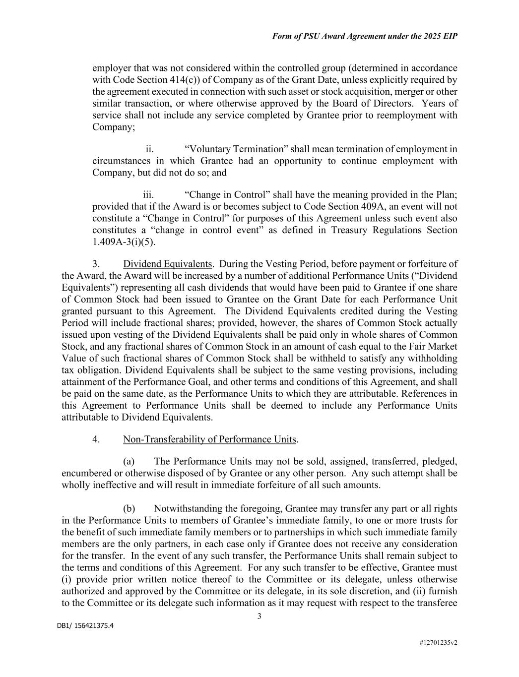 DB1/ 156421375.4 Form of PSU Award Agreement under the 2025 EIP 3 #12701235v2 employer that was not considered within the controlled group (determined in accordance with Code Section 414(c)) of Company as of the Grant Date, unless explicitly required by the agreement executed in connection with such asset or stock acquisition, merger or other similar transaction, or where otherwise approved by the Board of Directors. Years of service shall not include any service completed by Grantee prior to reemployment with Company; ii. “Voluntary Termination” shall mean termination of employment in circumstances in which Grantee had an opportunity to continue employment with Company, but did not do so; and iii. “Change in Control” shall have the meaning provided in the Plan; provided that if the Award is or becomes subject to Code Section 409A, an event will not constitute a “Change in Control” for purposes of this Agreement unless such event also constitutes a “change in control event” as defined in Treasury Regulations Section 1.409A-3(i)(5). 3. Dividend Equivalents. During the Vesting Period, before payment or forfeiture of the Award, the Award will be increased by a number of additional Performance Units (“Dividend Equivalents”) representing all cash dividends that would have been paid to Grantee if one share of Common Stock had been issued to Grantee on the Grant Date for each Performance Unit granted pursuant to this Agreement. The Dividend Equivalents credited during the Vesting Period will include fractional shares; provided, however, the shares of Common Stock actually issued upon vesting of the Dividend Equivalents shall be paid only in whole shares of Common Stock, and any fractional shares of Common Stock in an amount of cash equal to the Fair Market Value of such fractional shares of Common Stock shall be withheld to satisfy any withholding tax obligation. Dividend Equivalents shall be subject to the same vesting provisions, including attainment of the Performance Goal, and other terms and conditions of this Agreement, and shall be paid on the same date, as the Performance Units to which they are attributable. References in this Agreement to Performance Units shall be deemed to include any Performance Units attributable to Dividend Equivalents. 4. Non-Transferability of Performance Units. (a) The Performance Units may not be sold, assigned, transferred, pledged, encumbered or otherwise disposed of by Grantee or any other person. Any such attempt shall be wholly ineffective and will result in immediate forfeiture of all such amounts. (b) Notwithstanding the foregoing, Grantee may transfer any part or all rights in the Performance Units to members of Grantee’s immediate family, to one or more trusts for the benefit of such immediate family members or to partnerships in which such immediate family members are the only partners, in each case only if Grantee does not receive any consideration for the transfer. In the event of any such transfer, the Performance Units shall remain subject to the terms and conditions of this Agreement. For any such transfer to be effective, Grantee must (i) provide prior written notice thereof to the Committee or its delegate, unless otherwise authorized and approved by the Committee or its delegate, in its sole discretion, and (ii) furnish to the Committee or its delegate such information as it may request with respect to the transferee