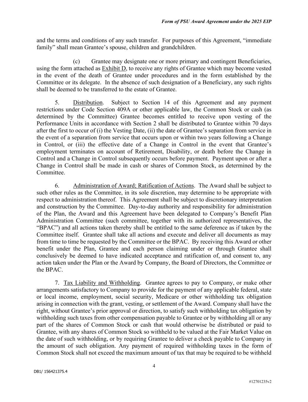 DB1/ 156421375.4 Form of PSU Award Agreement under the 2025 EIP 4 #12701235v2 and the terms and conditions of any such transfer. For purposes of this Agreement, “immediate family” shall mean Grantee’s spouse, children and grandchildren. (c) Grantee may designate one or more primary and contingent Beneficiaries, using the form attached as Exhibit D, to receive any rights of Grantee which may become vested in the event of the death of Grantee under procedures and in the form established by the Committee or its delegate. In the absence of such designation of a Beneficiary, any such rights shall be deemed to be transferred to the estate of Grantee. 5. Distribution. Subject to Section 14 of this Agreement and any payment restrictions under Code Section 409A or other applicable law, the Common Stock or cash (as determined by the Committee) Grantee becomes entitled to receive upon vesting of the Performance Units in accordance with Section 2 shall be distributed to Grantee within 70 days after the first to occur of (i) the Vesting Date, (ii) the date of Grantee’s separation from service in the event of a separation from service that occurs upon or within two years following a Change in Control, or (iii) the effective date of a Change in Control in the event that Grantee’s employment terminates on account of Retirement, Disability, or death before the Change in Control and a Change in Control subsequently occurs before payment. Payment upon or after a Change in Control shall be made in cash or shares of Common Stock, as determined by the Committee. 6. Administration of Award; Ratification of Actions. The Award shall be subject to such other rules as the Committee, in its sole discretion, may determine to be appropriate with respect to administration thereof. This Agreement shall be subject to discretionary interpretation and construction by the Committee. Day-to-day authority and responsibility for administration of the Plan, the Award and this Agreement have been delegated to Company’s Benefit Plan Administration Committee (such committee, together with its authorized representatives, the “BPAC”) and all actions taken thereby shall be entitled to the same deference as if taken by the Committee itself. Grantee shall take all actions and execute and deliver all documents as may from time to time be requested by the Committee or the BPAC. By receiving this Award or other benefit under the Plan, Grantee and each person claiming under or through Grantee shall conclusively be deemed to have indicated acceptance and ratification of, and consent to, any action taken under the Plan or the Award by Company, the Board of Directors, the Committee or the BPAC. 7. Tax Liability and Withholding. Grantee agrees to pay to Company, or make other arrangements satisfactory to Company to provide for the payment of any applicable federal, state or local income, employment, social security, Medicare or other withholding tax obligation arising in connection with the grant, vesting, or settlement of the Award. Company shall have the right, without Grantee’s prior approval or direction, to satisfy such withholding tax obligation by withholding such taxes from other compensation payable to Grantee or by withholding all or any part of the shares of Common Stock or cash that would otherwise be distributed or paid to Grantee, with any shares of Common Stock so withheld to be valued at the Fair Market Value on the date of such withholding, or by requiring Grantee to deliver a check payable to Company in the amount of such obligation. Any payment of required withholding taxes in the form of Common Stock shall not exceed the maximum amount of tax that may be required to be withheld