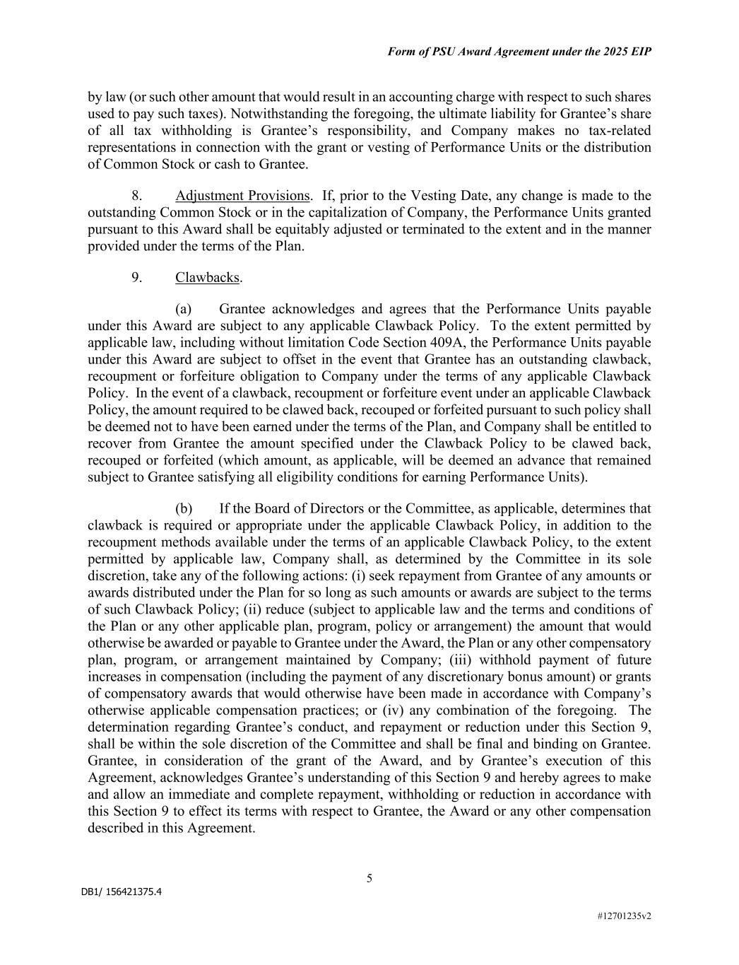DB1/ 156421375.4 Form of PSU Award Agreement under the 2025 EIP 5 #12701235v2 by law (or such other amount that would result in an accounting charge with respect to such shares used to pay such taxes). Notwithstanding the foregoing, the ultimate liability for Grantee’s share of all tax withholding is Grantee’s responsibility, and Company makes no tax-related representations in connection with the grant or vesting of Performance Units or the distribution of Common Stock or cash to Grantee. 8. Adjustment Provisions. If, prior to the Vesting Date, any change is made to the outstanding Common Stock or in the capitalization of Company, the Performance Units granted pursuant to this Award shall be equitably adjusted or terminated to the extent and in the manner provided under the terms of the Plan. 9. Clawbacks. (a) Grantee acknowledges and agrees that the Performance Units payable under this Award are subject to any applicable Clawback Policy. To the extent permitted by applicable law, including without limitation Code Section 409A, the Performance Units payable under this Award are subject to offset in the event that Grantee has an outstanding clawback, recoupment or forfeiture obligation to Company under the terms of any applicable Clawback Policy. In the event of a clawback, recoupment or forfeiture event under an applicable Clawback Policy, the amount required to be clawed back, recouped or forfeited pursuant to such policy shall be deemed not to have been earned under the terms of the Plan, and Company shall be entitled to recover from Grantee the amount specified under the Clawback Policy to be clawed back, recouped or forfeited (which amount, as applicable, will be deemed an advance that remained subject to Grantee satisfying all eligibility conditions for earning Performance Units). (b) If the Board of Directors or the Committee, as applicable, determines that clawback is required or appropriate under the applicable Clawback Policy, in addition to the recoupment methods available under the terms of an applicable Clawback Policy, to the extent permitted by applicable law, Company shall, as determined by the Committee in its sole discretion, take any of the following actions: (i) seek repayment from Grantee of any amounts or awards distributed under the Plan for so long as such amounts or awards are subject to the terms of such Clawback Policy; (ii) reduce (subject to applicable law and the terms and conditions of the Plan or any other applicable plan, program, policy or arrangement) the amount that would otherwise be awarded or payable to Grantee under the Award, the Plan or any other compensatory plan, program, or arrangement maintained by Company; (iii) withhold payment of future increases in compensation (including the payment of any discretionary bonus amount) or grants of compensatory awards that would otherwise have been made in accordance with Company’s otherwise applicable compensation practices; or (iv) any combination of the foregoing. The determination regarding Grantee’s conduct, and repayment or reduction under this Section 9, shall be within the sole discretion of the Committee and shall be final and binding on Grantee. Grantee, in consideration of the grant of the Award, and by Grantee’s execution of this Agreement, acknowledges Grantee’s understanding of this Section 9 and hereby agrees to make and allow an immediate and complete repayment, withholding or reduction in accordance with this Section 9 to effect its terms with respect to Grantee, the Award or any other compensation described in this Agreement.