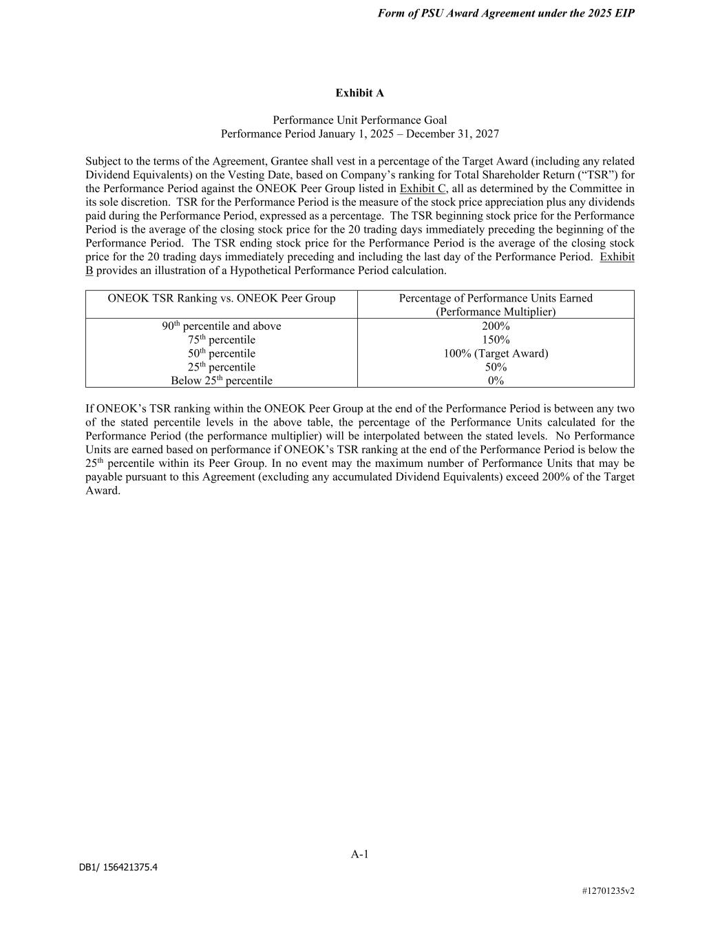 DB1/ 156421375.4 Form of PSU Award Agreement under the 2025 EIP A-1 #12701235v2 Exhibit A Performance Unit Performance Goal Performance Period January 1, 2025 – December 31, 2027 Subject to the terms of the Agreement, Grantee shall vest in a percentage of the Target Award (including any related Dividend Equivalents) on the Vesting Date, based on Company’s ranking for Total Shareholder Return (“TSR”) for the Performance Period against the ONEOK Peer Group listed in Exhibit C, all as determined by the Committee in its sole discretion. TSR for the Performance Period is the measure of the stock price appreciation plus any dividends paid during the Performance Period, expressed as a percentage. The TSR beginning stock price for the Performance Period is the average of the closing stock price for the 20 trading days immediately preceding the beginning of the Performance Period. The TSR ending stock price for the Performance Period is the average of the closing stock price for the 20 trading days immediately preceding and including the last day of the Performance Period. Exhibit B provides an illustration of a Hypothetical Performance Period calculation. ONEOK TSR Ranking vs. ONEOK Peer Group Percentage of Performance Units Earned (Performance Multiplier) 90th percentile and above 75th percentile 50th percentile 25th percentile Below 25th percentile 200% 150% 100% (Target Award) 50% 0% If ONEOK’s TSR ranking within the ONEOK Peer Group at the end of the Performance Period is between any two of the stated percentile levels in the above table, the percentage of the Performance Units calculated for the Performance Period (the performance multiplier) will be interpolated between the stated levels. No Performance Units are earned based on performance if ONEOK’s TSR ranking at the end of the Performance Period is below the 25th percentile within its Peer Group. In no event may the maximum number of Performance Units that may be payable pursuant to this Agreement (excluding any accumulated Dividend Equivalents) exceed 200% of the Target Award.
