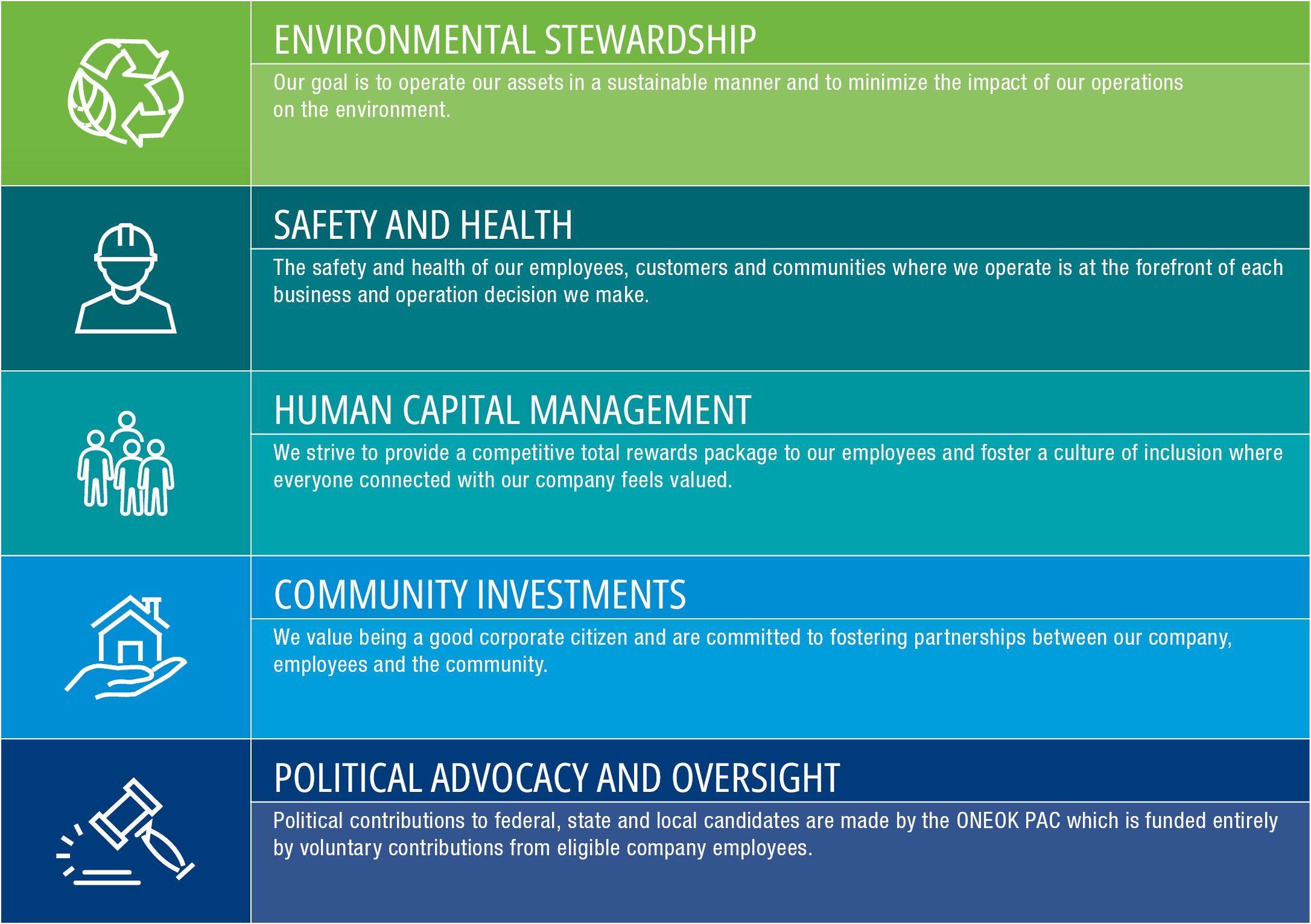 At ONEOK, our commitment to responsible operations, meaningful engagements with our stakeholders and a willingness to adapt have remained paramount throughout our long history. We continue to embrace our philosophy of continuous improvement by working to enhance our operations and disclosures in these areas.