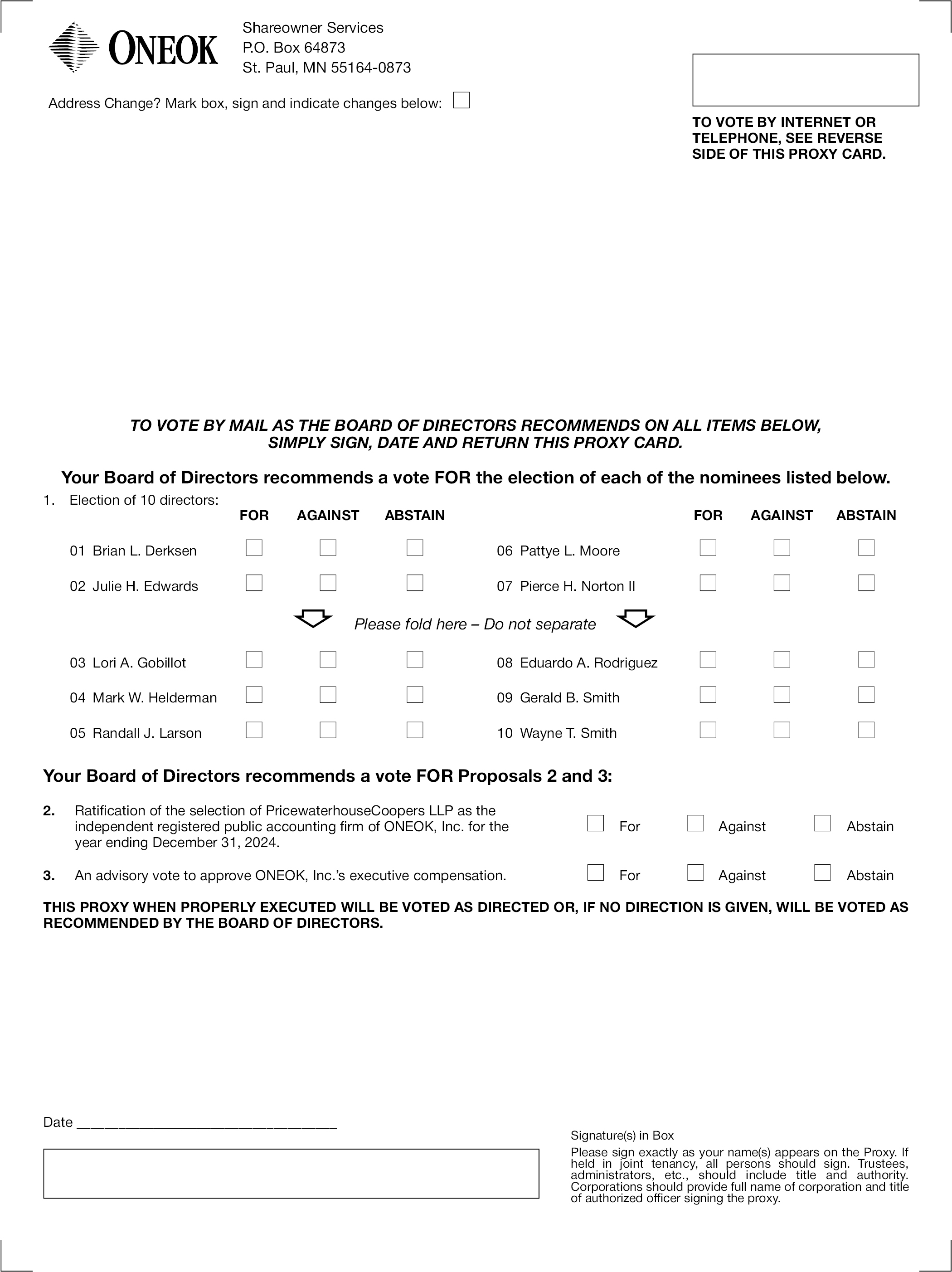 Shareowner Services P.O. Box 64873 St. Paul, MN 55164-0873 Address Change? Mark box, sign and indicate changes below: TO VOTE BY INTERNET OR TELEPHONE, SEE REVERSE SIDE OF THIS PROXY CARD. TO VOTE BY MAIL AS THE BOARD OF DIRECTORS RECOMMENDS ON ALL ITEMS BELOW, SIMPLY SIGN, DATE AND RETURN THIS PROXY CARD. Your Board of Directors recommends a vote FOR the election of each of the nominees listed below. 1. Election of 10 directors: FOR AGAINST ABSTAIN FOR AGAINST ABSTAIN 01 Brian L. Derksen 06 Pattye L. Moore 02 Julie H. Edwards 07 Pierce H. Norton II 03 Lori A. Gobillot 08 Eduardo A. Rodriguez 04 Mark W. Helderman 09 Gerald B. Smith 05 Randall J. Larson 10 Wayne T. Smith Please fold here – Do not separate Your Board of Directors recommends a vote FOR Proposals 2 and 3: 2. Ratification of the selection of PricewaterhouseCoopers LLP as the independent registered public accounting firm of ONEOK, Inc. for the year ending December 31, 2024. For Against Abstain 3. An advisory vote to approve ONEOK, Inc.’s executive compensation. For Against Abstain THIS PROXY WHEN PROPERLY EXECUTED WILL BE VOTED AS DIRECTED OR, IF NO DIRECTION IS GIVEN, WILL BE VOTED AS RECOMMENDED BY THE BOARD OF DIRECTORS. Date Signature(s) in Box Please sign exactly as your name(s) appears on the Proxy. If held in joint tenancy, all persons should sign. Trustees, administrators, etc., should include title and authority. Corporations should provide full name of corporation and title of authorized officer signing the proxy.