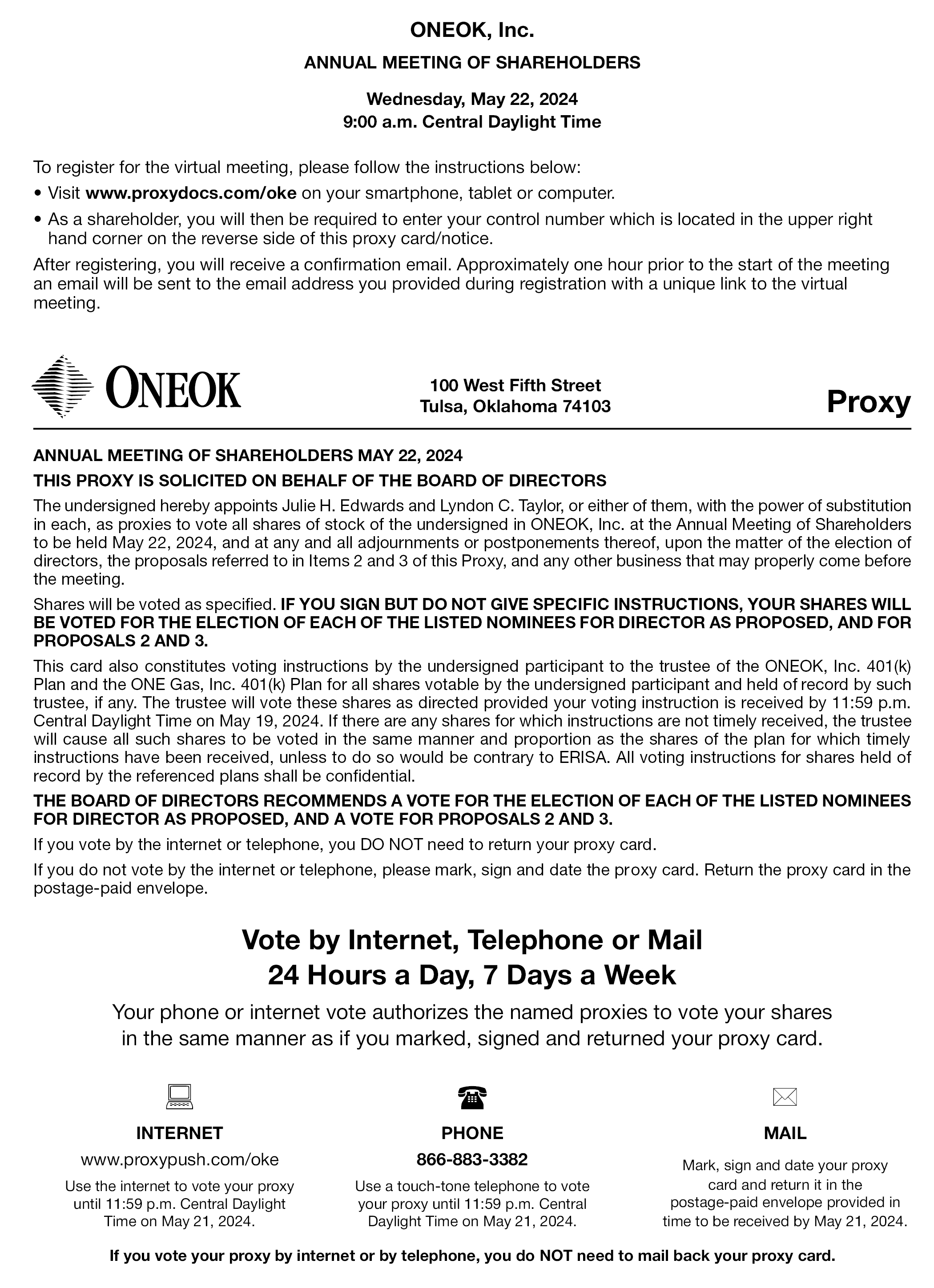 ONEOK, Inc. ANNUAL MEETING OF SHAREHOLDERS Wednesday, May 22, 2024 9:00 a.m. Central Daylight Time To register for the virtual meeting, please follow the instructions below: Visit www.proxydocs.com/oke on your smartphone, tablet or computer. As a shareholder, you will then be required to enter your control number which is located in the upper right hand corner on the reverse side of this proxy card/notice. After registering, you will receive a confirmation email. Approximately one hour prior to the start of the meeting an email will be sent to the email address you provided during registration with a unique link to the virtual meeting. 100 West Fifth Street Tulsa, Oklahoma 74103 Proxy ANNUAL MEETING OF SHAREHOLDERS MAY 22, 2024 THIS PROXY IS SOLICITED ON BEHALF OF THE BOARD OF DIRECTORS The undersigned hereby appoints Julie H. Edwards and Lyndon C. Taylor, or either of them, with the power of substitution in each, as proxies to vote all shares of stock of the undersigned in ONEOK, Inc. at the Annual Meeting of Shareholders to be held May 22, 2024, and at any and all adjournments or postponements thereof, upon the matter of the election of directors, the proposals referred to in Items 2 and 3 of this Proxy, and any other business that may properly come before the meeting. Shares will be voted as specified. IF YOU SIGN BUT DO NOT GIVE SPECIFIC INSTRUCTIONS, YOUR SHARES WILL BE VOTED FOR THE ELECTION OF EACH OF THE LISTED NOMINEES FOR DIRECTOR AS PROPOSED, AND FOR PROPOSALS 2 AND 3. This card also constitutes voting instructions by the undersigned participant to the trustee of the ONEOK, Inc. 401(k) Plan and the ONE Gas, Inc. 401(k) Plan for all shares votable by the undersigned participant and held of record by such trustee, if any. The trustee will vote these shares as directed provided your voting instruction is received by 11:59 p.m. Central Daylight Time on May 19, 2024. If there are any shares for which instructions are not timely received, the trustee will cause all such shares to be voted in the same manner and proportion as the shares of the plan for which timely instructions have been received, unless to do so would be contrary to ERISA. All voting instructions for shares held of record by the referenced plans shall be confidential. THE BOARD OF DIRECTORS RECOMMENDS A VOTE FOR THE ELECTION OF EACH OF THE LISTED NOMINEES FOR DIRECTOR AS PROPOSED, AND A VOTE FOR PROPOSALS 2 AND 3. If you vote by the internet or telephone, you DO NOT need to return your proxy card. If you do not vote by the internet or telephone, please mark, sign and date the proxy card. Return the proxy card in the postage-paid envelope. Vote by Internet, Telephone or Mail 24 Hours a Day, 7 Days a Week Your phone or internet vote authorizes the named proxies to vote your shares in the same manner as if you marked, signed and returned your proxy card. INTERNET PHONE MAIL www.proxypush.com/oke 866-883-3382 Mark, sign and date your proxy Use the internet to vote your proxy Use a touch-tone telephone to vote card and return it in the until 11:59 p.m. Central Daylight your proxy until 11:59 p.m. Central postage-paid envelope provided in Time on May 21, 2024. Daylight Time on May 21, 2024. time to be received by May 21, 2024. If you vote your proxy by internet or by telephone, you do NOT need to mail back your proxy card.
