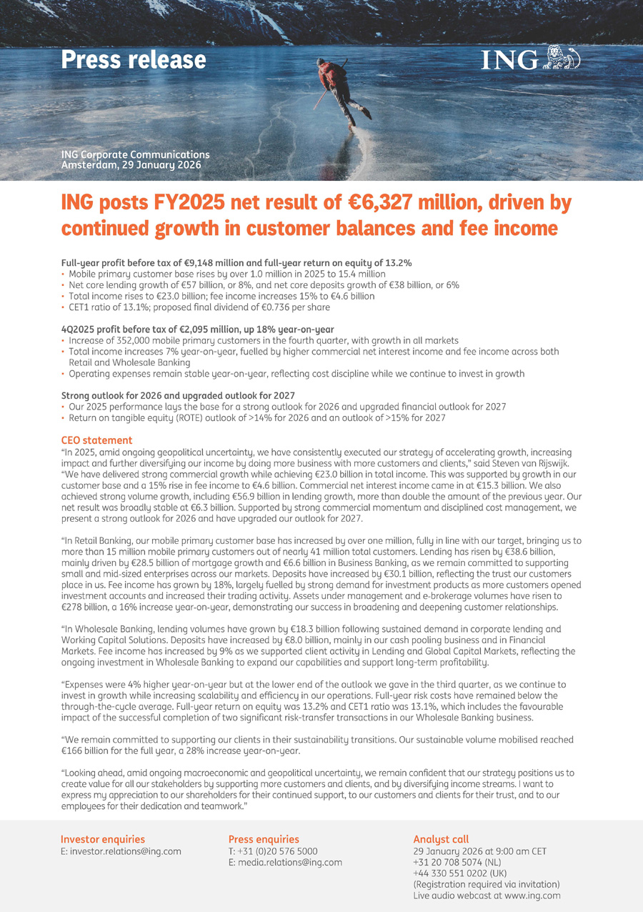 Press release ING Corporate Communications Amsterdam, 29 January 2026 ING posts FY2025 net result of €6,327 million, driven by continued growth in customer balances and fee income Full - year profit before tax of €9,148 million and full - year return on equity of 13.2% • Mobile primary customer base rises by over 1.0 million in 2025 to 15.4 million • Net core lending growth of €57 billion, or 8%, and net core deposits growth of €38 billion, or 6% • Total income rises to €23.0 billion; fee income increases 15% to €4.6 billion • CET1 ratio of 13.1%; proposed final dividend of €0.736 per share 4Q2025 profit before tax of €2,095 million, up 18% year - on - year • Increase of 352,000 mobile primary customers in the fourth quarter, with growth in all markets • Total income increases 7% year - on - year, fuelled by higher commercial net interest income and fee income across both Retail and Wholesale Banking • Operating expenses remain stable year - on - year, reflecting cost discipline while we continue to invest in growth Strong outlook for 2026 and upgraded outlook for 2027 • Our 2025 performance lays the base for a strong outlook for 2026 and upgraded financial outlook for 2027 • Return on tangible equity (ROTE) outlook of >14% for 2026 and an outlook of >15% for 2027 CEO statement “In 2025, amid ongoing geopolitical uncertainty, we have consistently executed our strategy of accelerating growth, increasing impact and further diversifying our income by doing more business with more customers and clients,” said Steven van Rijswijk. “We have delivered strong commercial growth while achieving €23.0 billion in total income. This was supported by growth in our customer base and a 15% rise in fee income to €4.6 billion. Commercial net interest income came in at €15.3 billion. We also achieved strong volume growth, including €56.9 billion in lending growth, more than double the amount of the previous year. Our net result was broadly stable at €6.3 billion. Supported by strong commercial momentum and disciplined cost management, we present a strong outlook for 2026 and have upgraded our outlook for 2027. “In Retail Banking, our mobile primary customer base has increased by over one million, fully in line with our target, bringing us to more than 15 million mobile primary customers out of nearly 41 million total customers. Lending has risen by €38.6 billion, mainly driven by €28.5 billion of mortgage growth and €6.6 billion in Business Banking, as we remain committed to supporting small and mid - sized enterprises across our markets. Deposits have increased by €30.1 billion, reflecting the trust our customers place in us. Fee income has grown by 18%, largely fuelled by strong demand for investment products as more customers opened investment accounts and increased their trading activity. Assets under management and e - brokerage volumes have risen to €278 billion, a 16% increase year - on - year, demonstrating our success in broadening and deepening customer relationships. “In Wholesale Banking, lending volumes have grown by €18.3 billion following sustained demand in corporate lending and Working Capital Solutions. Deposits have increased by €8.0 billion, mainly in our cash pooling business and in Financial Markets. Fee income has increased by 9% as we supported client activity in Lending and Global Capital Markets, reflecting the ongoing investment in Wholesale Banking to expand our capabilities and support long - term profitability. “Expenses were 4% higher year - on - year but at the lower end of the outlook we gave in the third quarter, as we continue to invest in growth while increasing scalability and efficiency in our operations. Full - year risk costs have remained below the through - the - cycle average. Full - year return on equity was 13.2% and CET1 ratio was 13.1%, which includes the favourable impact of the successful completion of two significant risk - transfer transactions in our Wholesale Banking business. “We remain committed to supporting our clients in their sustainability transitions. Our sustainable volume mobilised reached €166 billion for the full year, a 28% increase year - on - year. “Looking ahead, amid ongoing macroeconomic and geopolitical uncertainty, we remain confident that our strategy positions us to create value for all our stakeholders by supporting more customers and clients, and by diversifying income streams. I want to express my appreciation to our shareholders for their continued support, to our customers and clients for their trust, and to our employees for their dedication and teamwork.” Investor enquiries E: investor.relations@ing.com Press enquiries T: +31 (0)20 576 5000 E: media.relations@ing.com Analyst call 29 January 2026 at 9:00 am CET +31 20 708 5074 (NL) +44 330 551 0202 (UK) (Registration required via invitation) Live audio webcast at www.ing.com
