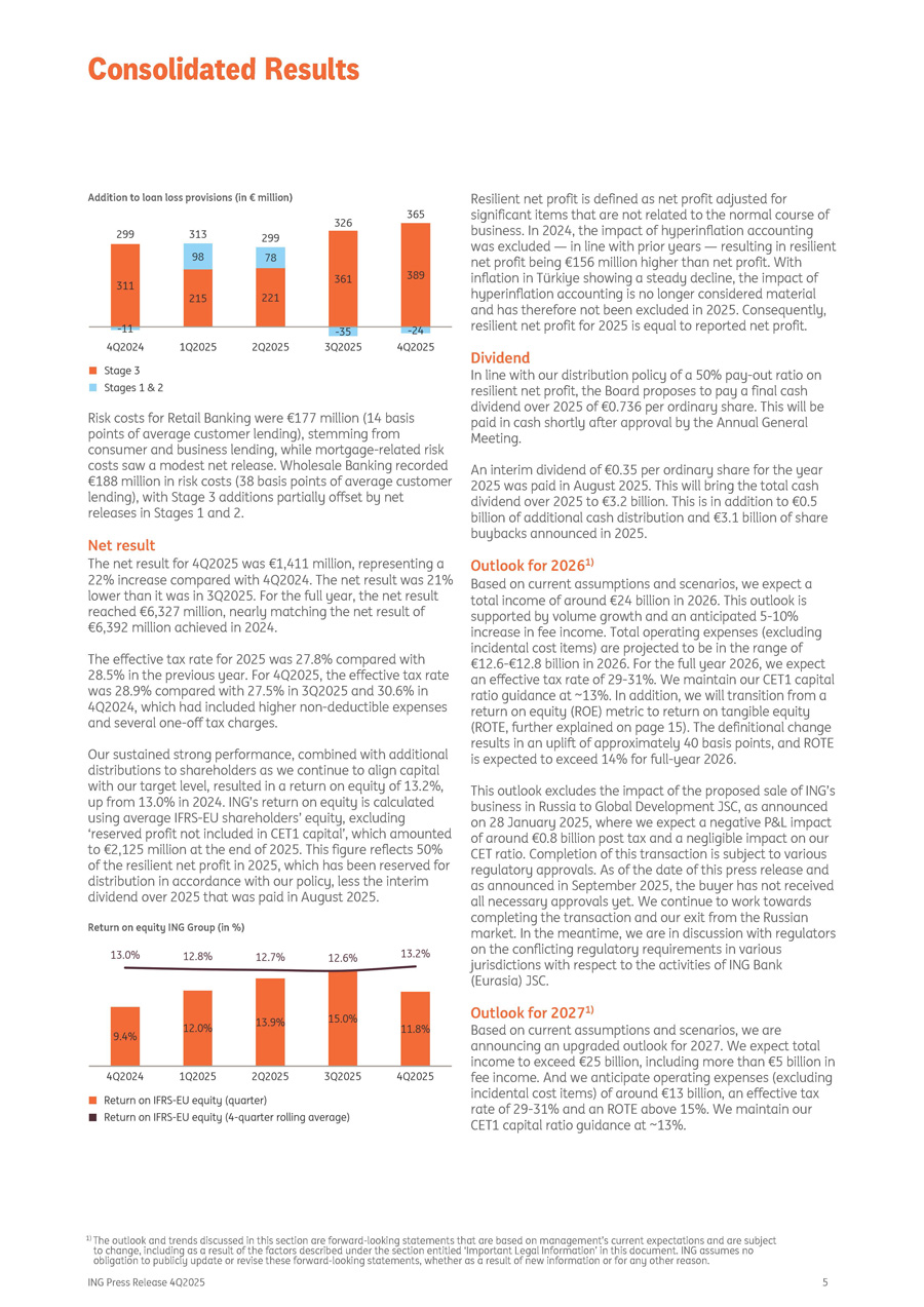 Addition to loan loss provisions (in € million) Risk costs for Retail Banking were €177 million (14 basis points of average customer lending), stemming from consumer and business lending, while mortgage - related risk costs saw a modest net release. Wholesale Banking recorded €188 million in risk costs (38 basis points of average customer lending), with Stage 3 additions partially offset by net releases in Stages 1 and 2. Net result The net result for 4Q2025 was €1,411 million, representing a 22% increase compared with 4Q2024. The net result was 21% lower than it was in 3Q2025. For the full year, the net result reached €6,327 million, nearly matching the net result of €6,392 million achieved in 2024. The effective tax rate for 2025 was 27.8% compared with 28.5% in the previous year. For 4Q2025, the effective tax rate was 28.9% compared with 27.5% in 3Q2025 and 30.6% in 4Q2024, which had included higher non - deductible expenses and several one - off tax charges. Our sustained strong performance, combined with additional distributions to shareholders as we continue to align capital with our target level, resulted in a return on equity of 13.2%, up from 13.0% in 2024. ING’s return on equity is calculated using average IFRS - EU shareholders’ equity, excluding ‘reserved profit not included in CET1 capital’, which amounted to €2,125 million at the end of 2025. This figure reflects 50% of the resilient net profit in 2025, which has been reserved for distribution in accordance with our policy, less the interim dividend over 2025 that was paid in August 2025. Return on equity ING Group (in %) Resilient net profit is defined as net profit adjusted for significant items that are not related to the normal course of business. In 2024, the impact of hyperinflation accounting was excluded — in line with prior years — resulting in resilient net profit being €156 million higher than net profit. With inflation in Türkiye showing a steady decline, the impact of hyperinflation accounting is no longer considered material and has therefore not been excluded in 2025. Consequently, resilient net profit for 2025 is equal to reported net profit. Dividend In line with our distribution policy of a 50% pay - out ratio on resilient net profit, the Board proposes to pay a final cash dividend over 2025 of €0.736 per ordinary share. This will be paid in cash shortly after approval by the Annual General Meeting. An interim dividend of €0.35 per ordinary share for the year 2025 was paid in August 2025. This will bring the total cash dividend over 2025 to €3.2 billion. This is in addition to €0.5 billion of additional cash distribution and €3.1 billion of share buybacks announced in 2025. Outlook for 2026 1) Based on current assumptions and scenarios, we expect a total income of around €24 billion in 2026. This outlook is supported by volume growth and an anticipated 5 - 10% increase in fee income. Total operating expenses (excluding incidental cost items) are projected to be in the range of €12.6 - €12.8 billion in 2026. For the full year 2026, we expect an effective tax rate of 29 - 31%. We maintain our CET1 capital ratio guidance at ~13%. In addition, we will transition from a return on equity (ROE) metric to return on tangible equity (ROTE, further explained on page 15). The definitional change results in an uplift of approximately 40 basis points, and ROTE is expected to exceed 14% for full - year 2026. ING Press Release 4Q2025 5 This outlook excludes the impact of the proposed sale of ING’s business in Russia to Global Development JSC, as announced on 28 January 2025, where we expect a negative P&L impact of around €0.8 billion post tax and a negligible impact on our CET ratio. Completion of this transaction is subject to various regulatory approvals. As of the date of this press release and as announced in September 2025, the buyer has not received all necessary approvals yet. We continue to work towards completing the transaction and our exit from the Russian market. In the meantime, we are in discussion with regulators on the conflicting regulatory requirements in various jurisdictions with respect to the activities of ING Bank (Eurasia) JSC. Outlook for 2027 1) Based on current assumptions and scenarios, we are announcing an upgraded outlook for 2027. We expect total income to exceed €25 billion, including more than €5 billion in fee income. And we anticipate operating expenses (excluding incidental cost items) of around €13 billion, an effective tax rate of 29 - 31% and an ROTE above 15%. We maintain our CET1 capital ratio guidance at ~13%. Consolidated Results 1) The outlook and trends discussed in this section are forward - looking statements that are based on management’s current expectations and are subject to change, including as a result of the factors described under the section entitled ‘Important Legal Information’ in this document. ING assumes no obligation to publicly update or revise these forward - looking statements, whether as a result of new information or for any other reason.