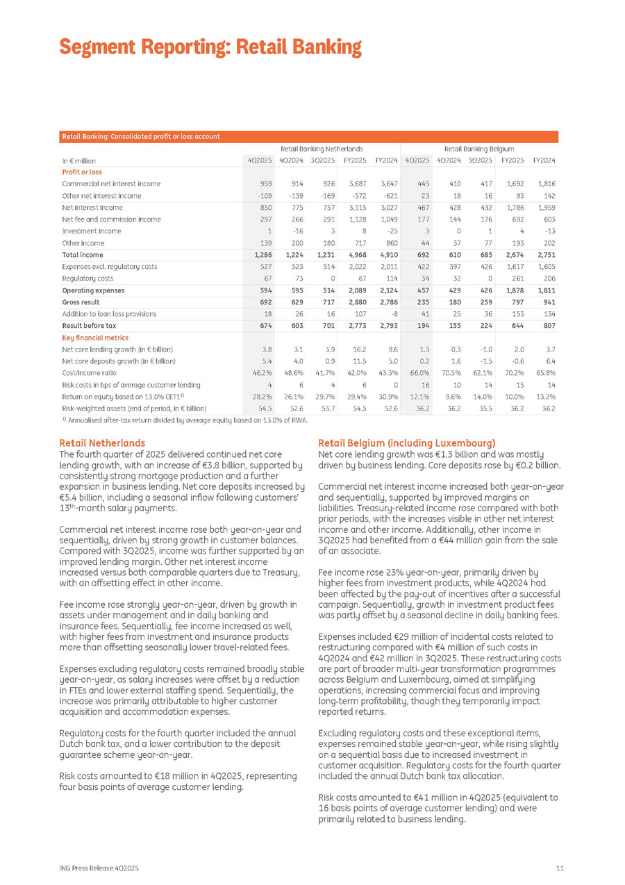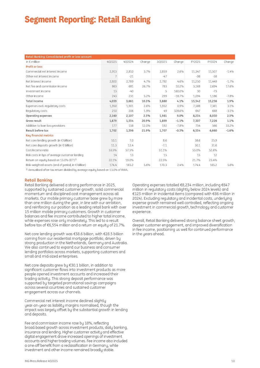 ING Press Release 4Q2025 10 Retail Banking: Consolidated profit or loss account Change FY2024 FY2025 Change 3Q2025 Change 4Q2024 4Q2025 In € million - 1.4% 11,507 - 58 11,347 - 98 2.6% 2,839 - 47 3.7% 2,810 - 21 2,913 7 Profit or loss Commercial net interest income Other net interest income - 1.7% 11,449 11,250 4.6% 2,792 4.7% 2,789 2,920 Net interest income 17.6% 2,694 3,168 10.2% 783 26.7% 681 863 Net fee and commission income - 73 30 160.0% 5 - 40 13 Investment income - 7.8% 1,186 1,094 - 18.7% 299 5.2% 231 243 Other income 1.9% 15,256 15,542 4.1% 3,880 10.3% 3,661 4,039 Total income 3.1% 7,361 7,588 0.9% 1,932 2.6% 1,901 1,950 Expenses excl. regulatory costs - 3.1% 668 647 328.6% 49 1.9% 206 210 Regulatory costs 2.5% 8,030 8,234 9.0% 1,981 2.5% 2,107 2,160 Operating expenses 1.1% 7,226 7,307 - 1.1% 1,899 20.9% 1,554 1,879 Gross result 33.2% 566 754 - 7.8% 192 12.0% 158 177 Addition to loan loss provisions - 1.6% 6,660 6,554 - 0.3% 1,707 21.9% 1,396 1,702 Result before tax Key financial metrics 25.9 38.6 8.6 7.0 10.1 Net core lending growth (in € billion) 31.6 30.1 - 7.1 12.4 11.3 Net core deposits growth (in € billion) 52.6% 53.0% 51.1% 57.5% 53.5% Cost/income ratio 12 15 15 13 14 Risk costs in bps of average customer lending 23.4% 21.7% 22.5% 19.0% 22.1% Return on equity based on 13.0% CET1 1) 5.6% 165.2 174.4 2.4% 170.3 5.6% 165.2 174.4 Risk - weighted assets (end of period, in € billion) 1) Annualised after - tax return divided by average equity based on 13.0% of RWA. Retail Banking Retail Banking delivered a strong performance in 2025, supported by sustained customer growth, solid commercial momentum and disciplined cost management across all markets. Our mobile primary customer base grew by more than one million during the year, in line with our ambition, and reinforcing our position as a leading retail bank with over 15 million mobile primary customers. Growth in customer balances and fee income contributed to higher total income, while expenses rose only moderately. This led to a result before tax of €6,554 million and a return on equity of 21.7%. Net core lending growth was €38.6 billion, with €28.5 billion coming from our residential mortgage portfolio, driven by strong production in the Netherlands, Germany and Australia. We also continued to expand our business and consumer lending portfolios across markets, supporting customers and small and mid - sized enterprises. Net core deposits grew by €30.1 billion, in addition to significant customer flows into investment products as more people opened investment accounts and increased their trading activity. This strong deposit performance was supported by targeted promotional savings campaigns across several countries and sustained customer engagement across our channels. Commercial net interest income declined slightly year - on - year as liability margins normalised, though the impact was largely offset by the substantial growth in lending and deposits. Fee and commission income rose by 18%, reflecting broad - based growth across investment products, daily banking, insurance and lending. Higher customer activity and effective digital engagement drove increased openings of investment accounts and higher trading volumes. Fee income also included a one - off benefit from a reclassification in Germany, while investment and other income remained broadly stable. Operating expenses totalled €8,234 million, including €647 million in regulatory costs (slightly below 2024 levels) and €123 million in incidental items (compared with €86 million in 2024). Excluding regulatory and incidental costs, underlying expense growth remained well controlled, reflecting ongoing investment in commercial growth, technology and customer experience. Overall, Retail Banking delivered strong balance sheet growth, deeper customer engagement, and improved diversification in fee income, positioning us well for continued performance in the years ahead. Segment Reporting: Retail Banking