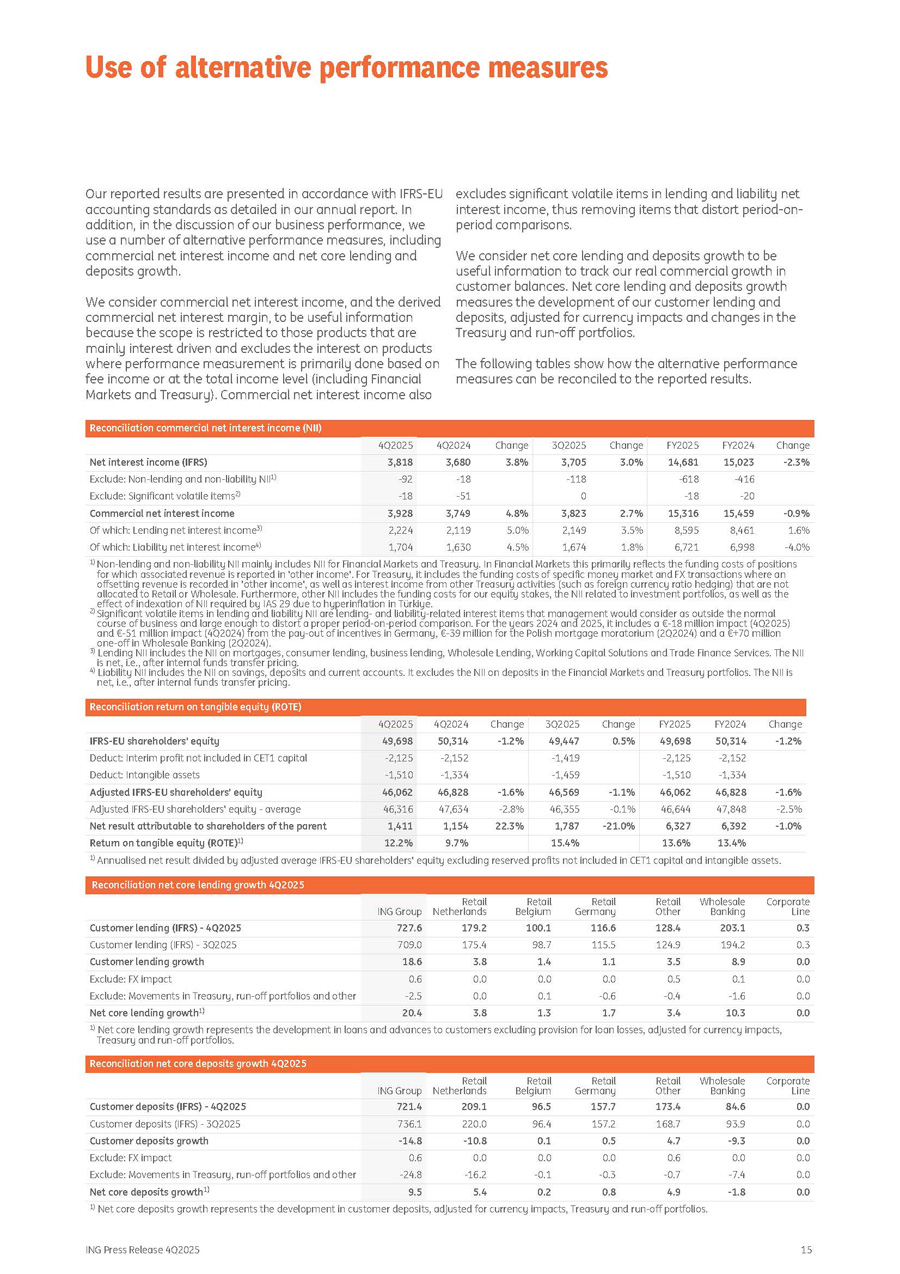 ING Press Release 4Q2025 15 Our reported results are presented in accordance with IFRS - EU accounting standards as detailed in our annual report. In addition, in the discussion of our business performance, we use a number of alternative performance measures, including commercial net interest income and net core lending and deposits growth. We consider commercial net interest income, and the derived commercial net interest margin, to be useful information because the scope is restricted to those products that are mainly interest driven and excludes the interest on products where performance measurement is primarily done based on fee income or at the total income level (including Financial Markets and Treasury). Commercial net interest income also excludes significant volatile items in lending and liability net interest income, thus removing items that distort period - on - period comparisons . We consider net core lending and deposits growth to be useful information to track our real commercial growth in customer balances. Net core lending and deposits growth measures the development of our customer lending and deposits, adjusted for currency impacts and changes in the Treasury and run - off portfolios. The following tables show how the alternative performance measures can be reconciled to the reported results. Reconciliation commercial net interest income (NII) Change FY2024 FY2025 Change 3Q2025 Change 4Q2024 4Q2025 - 2.3% 15,023 14,681 3.0% 3,705 3.8% 3,680 3,818 Net interest income (IFRS) - 416 - 618 - 118 - 18 - 92 Exclude: Non - lending and non - liability NII 1) - 20 - 18 0 - 51 - 18 Exclude: Significant volatile items 2) - 0.9% 15,459 15,316 2.7% 3,823 4.8% 3,749 3,928 Commercial net interest income 1.6% 8,461 8,595 3.5% 2,149 5.0% 2,119 2,224 Of which: Lending net interest income 3) - 4.0% 6,998 6,721 1.8% 1,674 4.5% 1,630 1,704 Of which: Liability net interest income 4) 1) Non - lending and non - liability NII mainly includes NII for Financial Markets and Treasury. In Financial Markets this primarily reflects the funding costs of positions for which associated revenue is reported in 'other income'. For Treasury, it includes the funding costs of specific money market and FX transactions where an offsetting revenue is recorded in 'other income', as well as interest income from other Treasury activities (such as foreign currency ratio hedging) that are not allocated to Retail or Wholesale. Furthermore, other NII includes the funding costs for our equity stakes, the NII related to investment portfolios, as well as the effect of indexation of NII required by IAS 29 due to hyperinflation in Türkiye. 2) Significant volatile items in lending and liability NII are lending - and liability - related interest items that management would consider as outside the normal course of business and large enough to distort a proper period - on - period comparison. For the years 2024 and 2025, it includes a € - 18 million impact (4Q2025) and € - 51 million impact (4Q2024) from the pay - out of incentives in Germany, € - 39 million for the Polish mortgage moratorium (2Q2024) and a €+70 million one - off in Wholesale Banking (2Q2024). 3) Lending NII includes the NII on mortgages, consumer lending, business lending, Wholesale Lending, Working Capital Solutions and Trade Finance Services. The NII is net, i.e., after internal funds transfer pricing. 4) Liability NII includes the NII on savings, deposits and current accounts. It excludes the NII on deposits in the Financial Markets and Treasury portfolios. The NII is net, i.e., after internal funds transfer pricing. Reconciliation return on tangible equity (ROTE) Change FY2024 FY2025 Change 3Q2025 Change 4Q2024 4Q2025 - 1.2% 50,314 49,698 0.5% 49,447 - 1.2% 50,314 49,698 IFRS - EU shareholders' equity - 2,152 - 2,125 - 1,419 - 2,152 - 2,125 Deduct: Interim profit not included in CET1 capital - 1,334 - 1,510 - 1,459 - 1,334 - 1,510 Deduct: Intangible assets - 1.6% 46,828 46,062 - 1.1% 46,569 - 1.6% 46,828 46,062 Adjusted IFRS - EU shareholders' equity - 2.5% 47,848 46,644 - 0.1% 46,355 - 2.8% 47,634 46,316 Adjusted IFRS - EU shareholders' equity - average - 1.0% 6,392 6,327 - 21.0% 1,787 22.3% 1,154 1,411 Net result attributable to shareholders of the parent 13.4% 13.6% 15.4% 9.7% 12.2% Return on tangible equity (ROTE) 1) 1) Annualised net result divided by adjusted average IFRS - EU shareholders' equity excluding reserved profits not included in CET1 capital and intangible assets. Reconciliation net core lending growth 4Q2025 Corporate Line Wholesale Banking Retail Other Retail Germany Retail Belgium Retail Netherlands ING Group 0.3 203.1 128.4 116.6 100.1 179.2 727.6 Customer lending (IFRS) - 4Q2025 0.3 194.2 124.9 115.5 98.7 175.4 709.0 Customer lending (IFRS) - 3Q2025 0.0 8.9 3.5 1.1 1.4 3.8 18.6 Customer lending growth 0.0 0.1 0.5 0.0 0.0 0.0 0.6 Exclude: FX impact 0.0 - 1.6 - 0.4 - 0.6 0.1 0.0 - 2.5 Exclude: Movements in Treasury, run - off portfolios and other 0.0 10.3 3.4 1.7 1.3 3.8 20.4 Net core lending growth 1) 1) Net core lending growth represents the development in loans and advances to customers excluding provision for loan losses, adjusted for currency impacts, Treasury and run - off portfolios. Reconciliation net core deposits growth 4Q2025 Corporate Line Wholesale Banking Retail Other Retail Germany Retail Belgium Retail Netherlands ING Group 0.0 84.6 173.4 157.7 96.5 209.1 721.4 Customer deposits (IFRS) - 4Q2025 0.0 93.9 168.7 157.2 96.4 220.0 736.1 Customer deposits (IFRS) - 3Q2025 0.0 - 9.3 4.7 0.5 0.1 - 10.8 - 14.8 Customer deposits growth 0.0 0.0 0.6 0.0 0.0 0.0 0.6 Exclude: FX impact 0.0 - 7.4 - 0.7 - 0.3 - 0.1 - 16.2 - 24.8 Exclude: Movements in Treasury, run - off portfolios and other 0.0 - 1.8 4.9 0.8 0.2 5.4 9.5 Net core deposits growth 1) 1) Net core deposits growth represents the development in customer deposits, adjusted for currency impacts, Treasury and run - off portfolios. Use of alternative performance measures