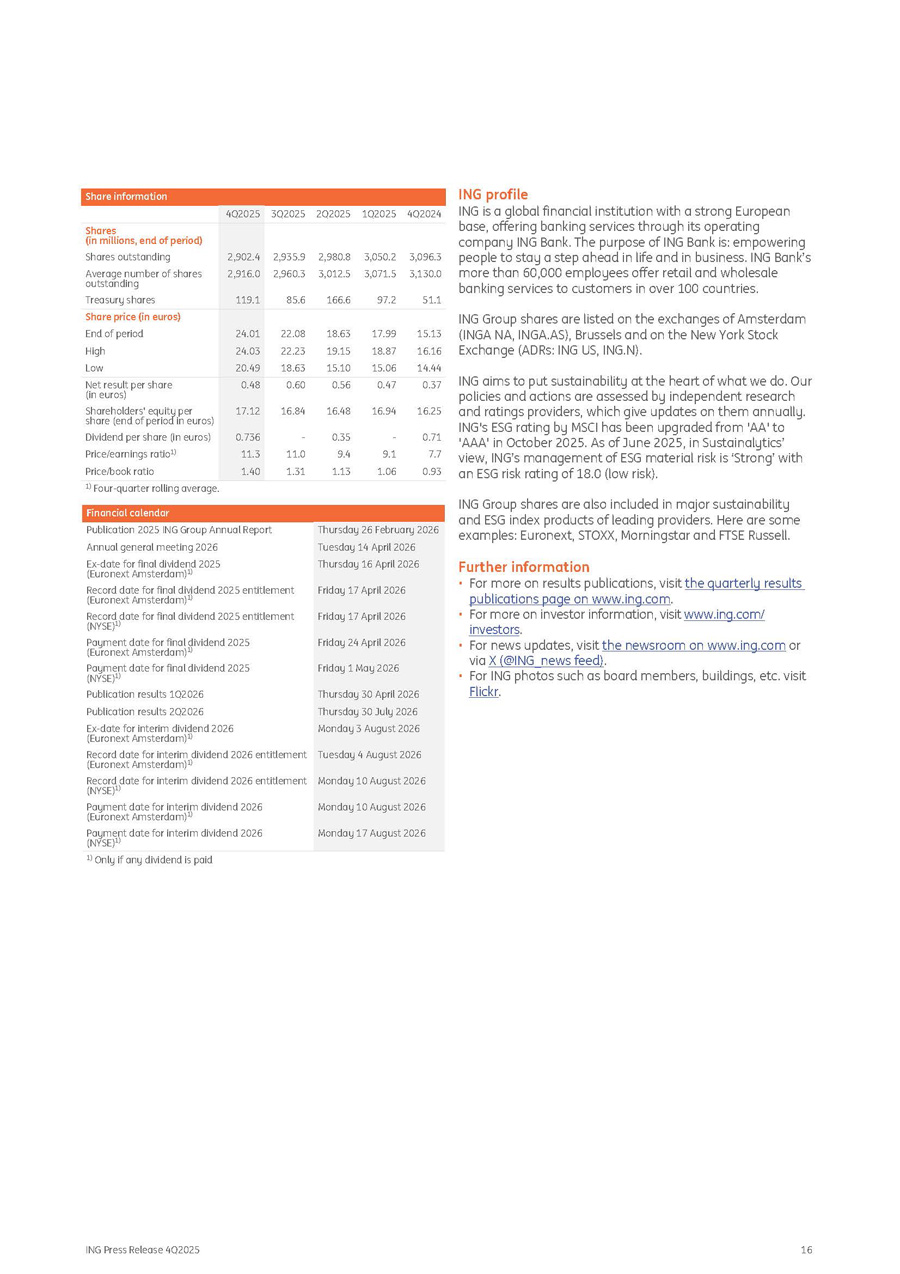 Share information 4Q2024 1Q2025 2Q2025 3Q2025 4Q2025 3,096.3 3,130.0 51.1 3,050.2 3,071.5 97.2 2,980.8 3,012.5 166.6 2,935.9 2,960.3 85.6 2,902.4 2,916.0 119.1 Shares (in millions, end of period) Shares outstanding Average number of shares outstanding Treasury shares Share price (in euros) 15.13 17.99 18.63 22.08 24.01 End of period 16.16 18.87 19.15 22.23 24.03 High 14.44 15.06 15.10 18.63 20.49 Low 0.37 0.47 0.56 0.60 0.48 Net result per share (in euros) 16.25 16.94 16.48 16.84 17.12 Shareholders' equity per share (end of period in euros) 0.71 - 0.35 - 0.736 Dividend per share (in euros) 7.7 9.1 9.4 11.0 11.3 Price/earnings ratio 1) 0.93 1.06 1.13 1.31 1.40 Price/book ratio 1) Four - quarter rolling average. Financial calendar Publication 2025 ING Group Annual Report Annual general meeting 2026 Ex - date for final dividend 2025 (Euronext Amsterdam) 1) Record date for final dividend 2025 entitlement (Euronext Amsterdam) 1) Record date for final dividend 2025 entitlement (NYSE) 1) Payment date for final dividend 2025 (Euronext Amsterdam) 1) Payment date for final dividend 2025 (NYSE) 1) Publication results 1Q2026 Publication results 2Q2026 Ex - date for interim dividend 2026 (Euronext Amsterdam) 1) Record date for interim dividend 2026 entitlement (Euronext Amsterdam) 1) Record date for interim dividend 2026 entitlement (NYSE) 1) Payment date for interim dividend 2026 (Euronext Amsterdam) 1) Payment date for interim dividend 2026 (NYSE) 1) Thursday 26 February 2026 Tuesday 14 April 2026 Thursday 16 April 2026 Friday 17 April 2026 Friday 17 April 2026 Friday 24 April 2026 Friday 1 May 2026 Thursday 30 April 2026 Thursday 30 July 2026 Monday 3 August 2026 Tuesday 4 August 2026 Monday 10 August 2026 Monday 10 August 2026 Monday 17 August 2026 1) Only if any dividend is paid ING profile ING is a global financial institution with a strong European base, offering banking services through its operating company ING Bank. The purpose of ING Bank is: empowering people to stay a step ahead in life and in business. ING Bank’s more than 60,000 employees offer retail and wholesale banking services to customers in over 100 countries. ING Group shares are listed on the exchanges of Amsterdam (INGA NA, INGA.AS), Brussels and on the New York Stock Exchange (ADRs: ING US, ING.N). ING aims to put sustainability at the heart of what we do. Our policies and actions are assessed by independent research and ratings providers, which give updates on them annually. ING's ESG rating by MSCI has been upgraded from 'AA' to 'AAA' in October 2025. As of June 2025, in Sustainalytics’ view, ING’s management of ESG material risk is ‘Strong’ with an ESG risk rating of 18.0 (low risk). ING Press Release 4Q2025 16 ING Group shares are also included in major sustainability and ESG index products of leading providers. Here are some examples: Euronext, STOXX, Morningstar and FTSE Russell. Further information • For more on results publications, visit the quarterly results publications page on www.ing.com . • For more on investor information, visit www.ing.com/ investors . • For news updates, visit the newsroom on www.ing.com or via X (@ING_news feed) . • For ING photos such as board members, buildings, etc. visit Flickr .
