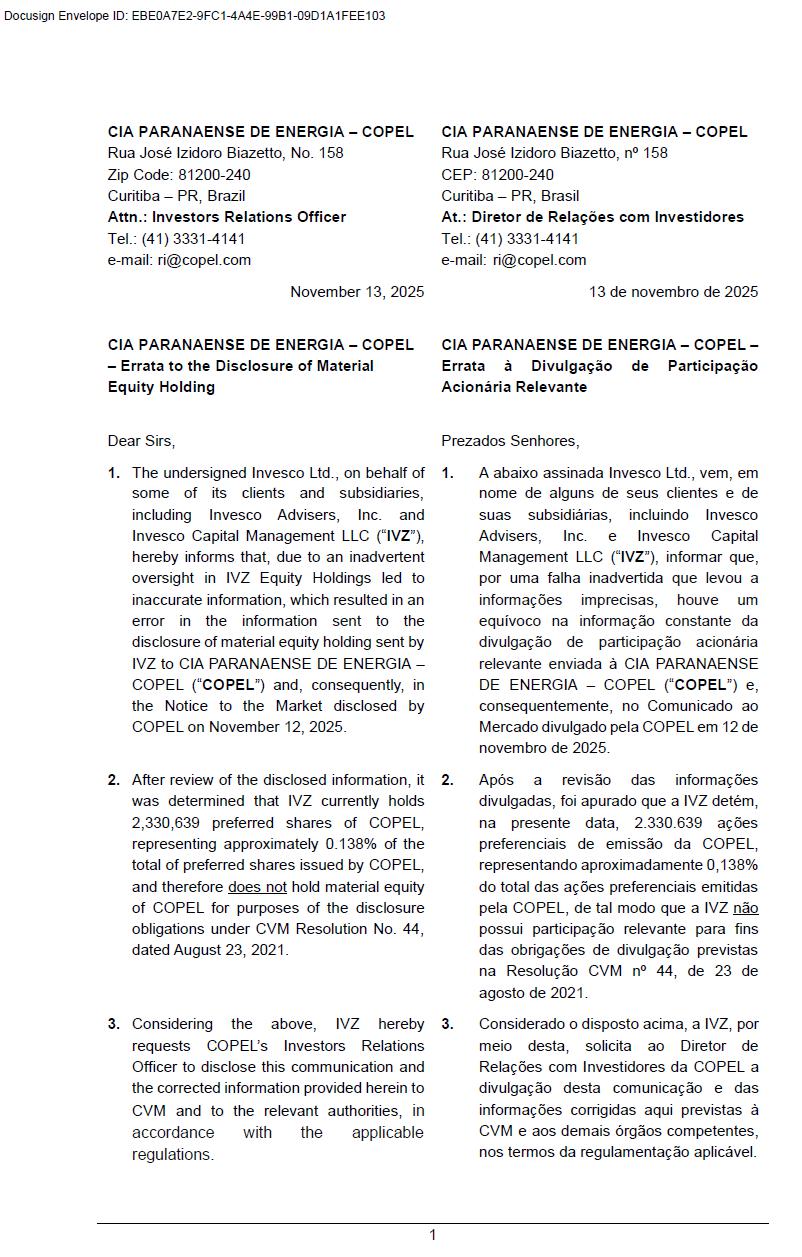 COPEL (“Company”) hereby informs its shareholders and the market in general that, in compliance with CVM Resolution No. 44/2021, amended by CVM Resolution No. 60/2022, on November 13, 2025, the Company received from shareholder Invesco Ltd. (“IVZ”) a correction regarding a material shareholding position, which had previously been reported to the Company on November 12, 2025 and disclosed in Market Announcement 19/25.