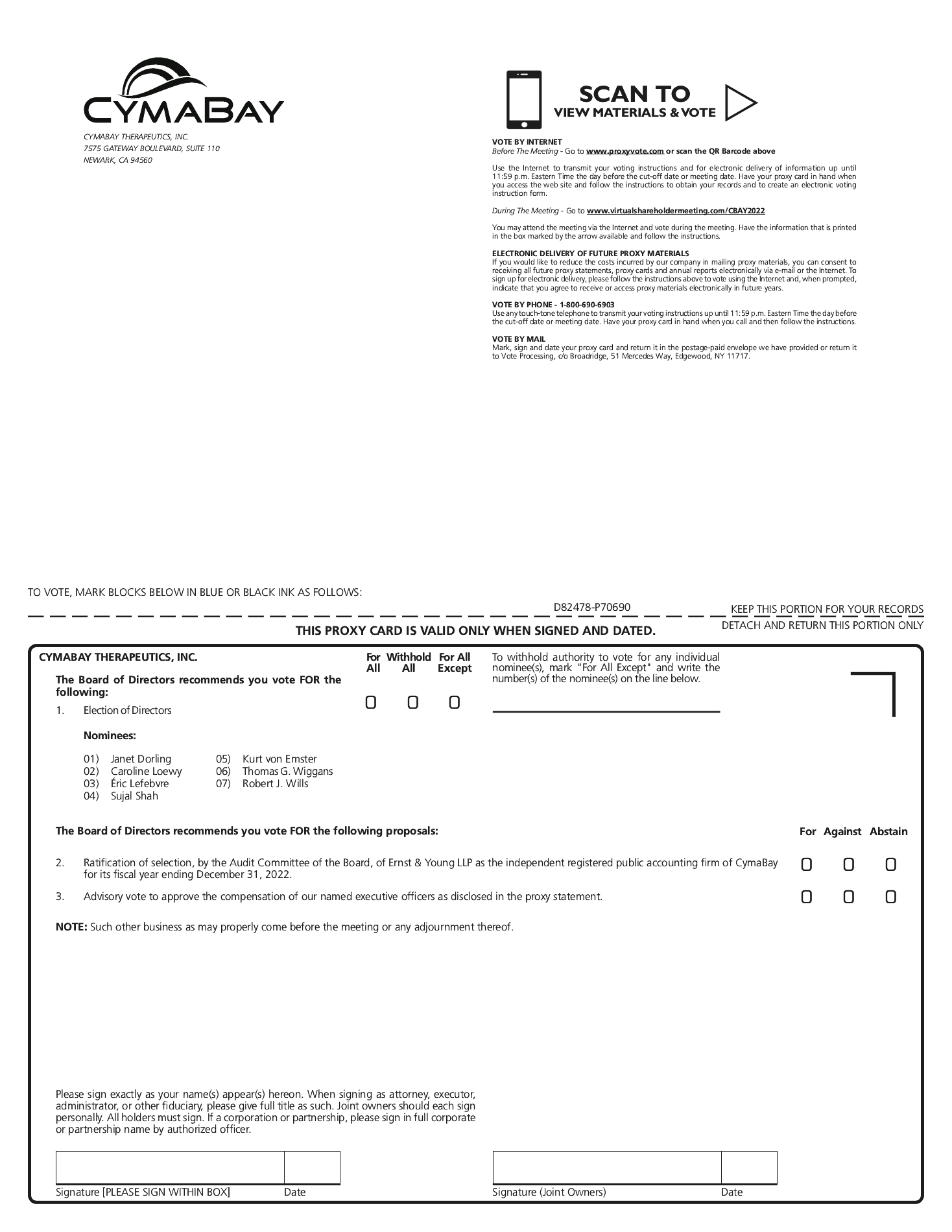 We sent you the proxy notice because our Board of Directors (the “CymaBay Board” or the “Board”) is soliciting your proxy to vote at our 2022 Annual Meeting of Stockholders (the “Annual Meeting”), including at any adjournments or postponements of the meeting. We have elected to provide access to the full proxy materials over the Internet and have provided our stockholders with instructions on how to access the proxy materials in the Notice of Internet Availability of Proxy Materials (the “Notice”) that you received.