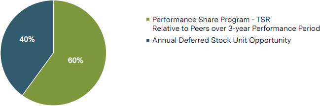 DO deliver a substantial portion of the value of equity awards in multi-year performance shares. For 2024, 60% of all executive officers equity award opportunity was tied to our company’s 3-year total stockholder return relative to our peer group. | ||