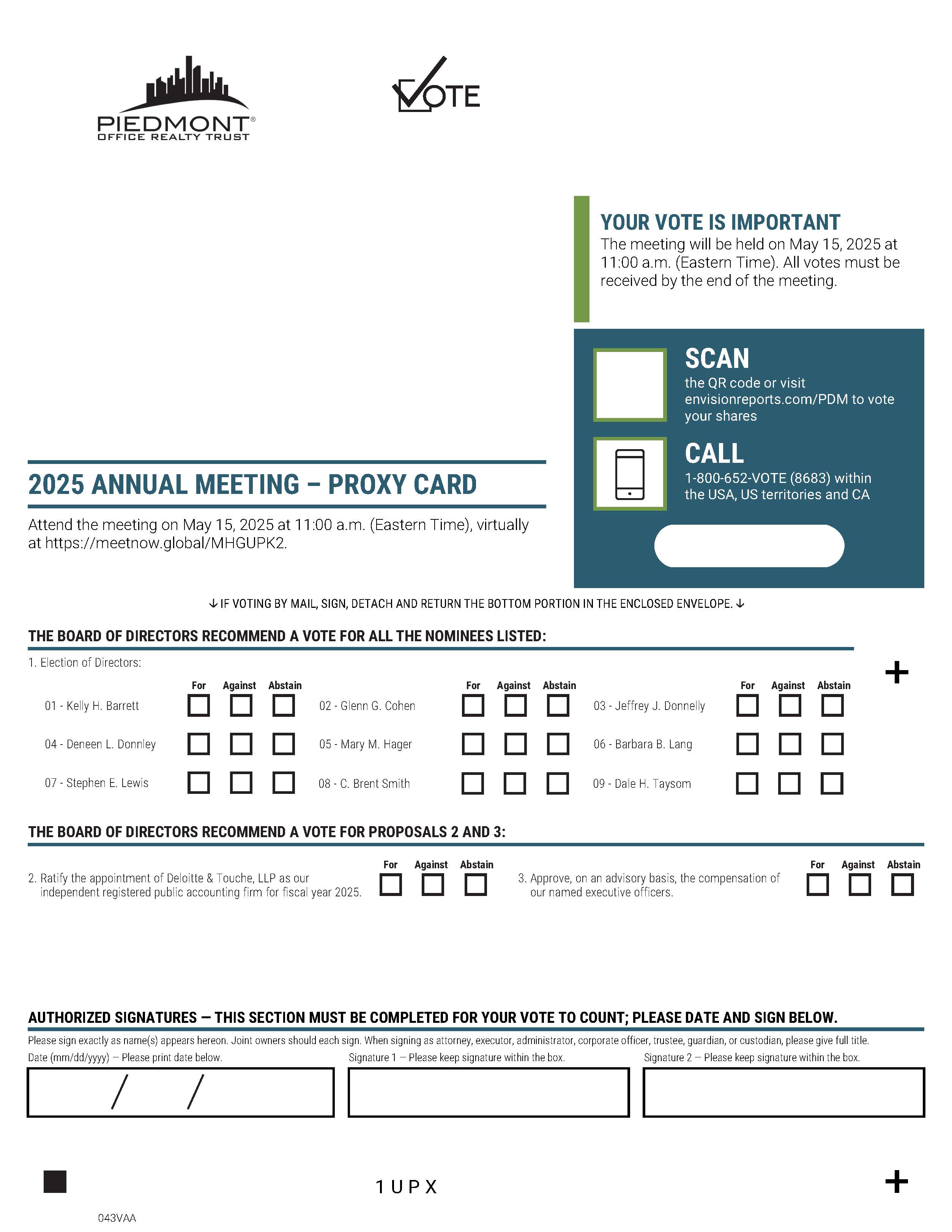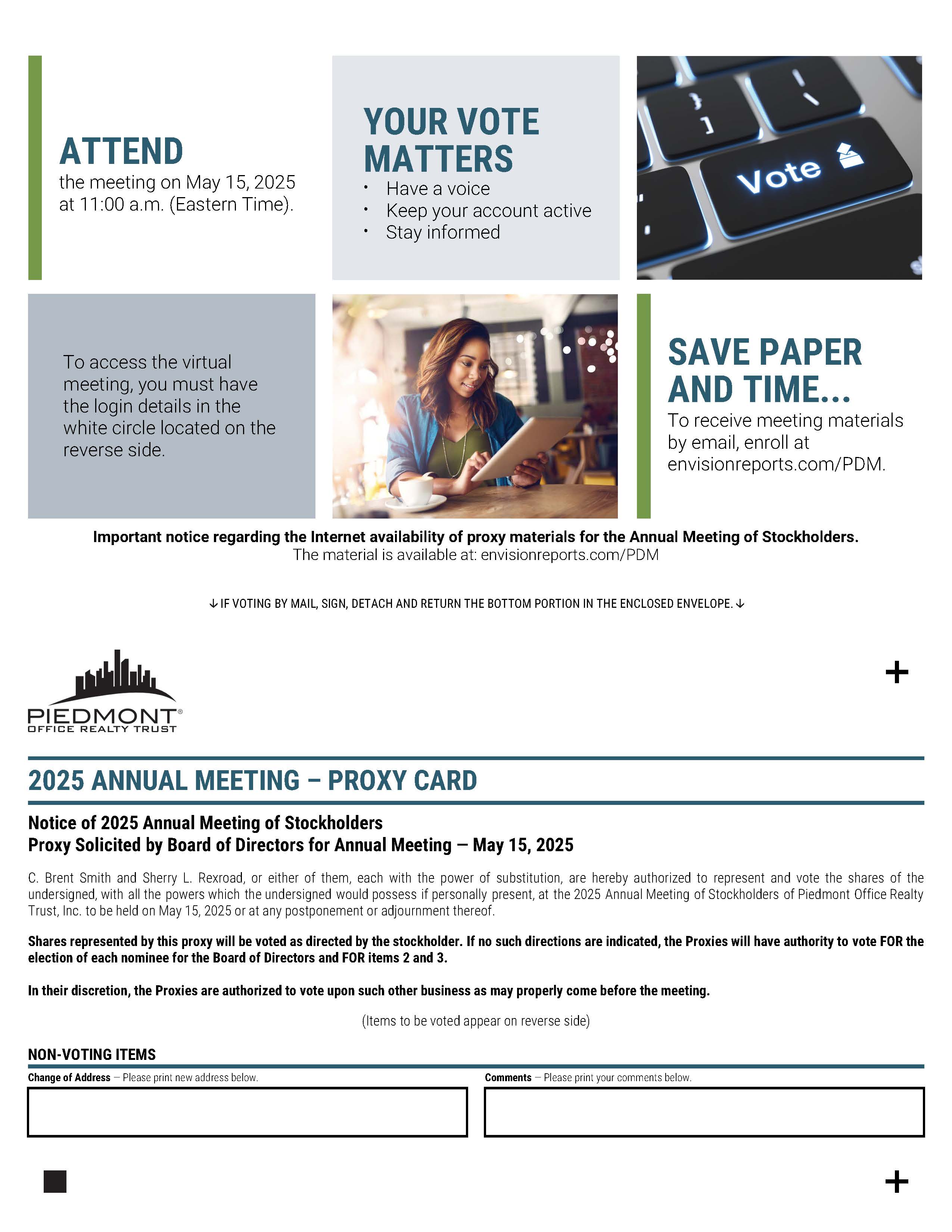ATTEND the meeting on May 15, 2025 at 11:00 a.m. (Eastern Time). YOUR VOTE MATTERS • Have a voice • Keep your account active • Stay informed To access the virtual meeting, you must have the login details in the white circle located on the reverse side. SAVE PAPER AND TIME... To receive meeting materials by email, enroll at envisionreports.com/PDM. Important notice regarding the Internet availability of proxy materials for the Annual Meeting of Stockholders. The material is available at: envisionreports.com/PDM IF VOTING BY MAIL, SIGN, DETACH AND RETURN THE BOTTOM PORTION IN THE ENCLOSED ENVELOPE. 2025 ANNUAL MEETING - PROXY CARD Notice of 2025 Annual Meeting of Stockholders Proxy Solicited by Board of Directors for Annual Meeting - May 15, 2025 C. Brent Smith and Sherry L. Rexroad, or either of them, each with the power of substitution, are hereby authorized to represent and vote the shares of the undersigned, with all the powers which the undersigned would possess if personally present, at the 2025 Annual Meeting of Stockholders of Piedmont Office Realty Trust, Inc. to be held on May 15, 2025 or at any postponement or adjournment thereof. Shares represented by this proxy will be voted as directed by the stockholder. If no such directions are indicated, the Proxies will have authority to vote FOR the election of each nominee for the Board of Directors and FOR items 2 and 3. In their discretion, the Proxies are authorized to vote upon such other business as may properly come before the meeting. (Items to be voted appear on reverse side) NON-VOTING ITEMS Change of Address - Please print new address below. Comments - Please print your comments below.