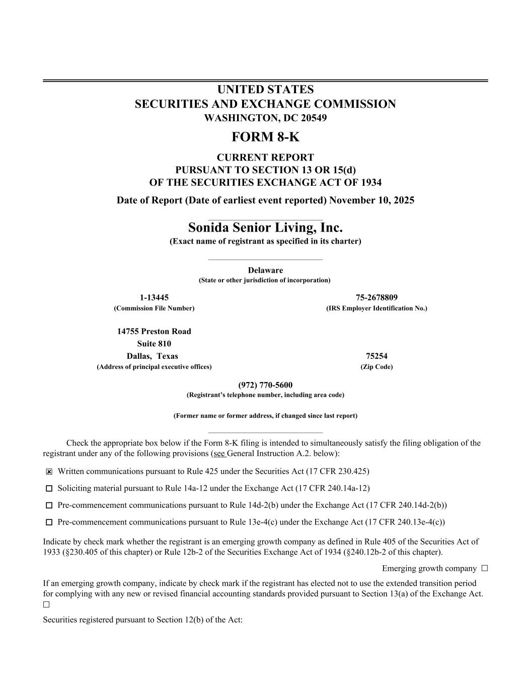 UNITED STATES SECURITIES AND EXCHANGE COMMISSION WASHINGTON, DC 20549 FORM 8-K CURRENT REPORT PURSUANT TO SECTION 13 OR 15(d) OF THE SECURITIES EXCHANGE ACT OF 1934 Date of Report (Date of earliest event reported) November 10, 2025 _________________________________ Sonida Senior Living, Inc. (Exact name of registrant as specified in its charter) _________________________________ Delaware (State or other jurisdiction of incorporation) 1-13445 75-2678809 (Commission File Number) (IRS Employer Identification No.) 14755 Preston Road Suite 810 Dallas, Texas 75254 (Address of principal executive offices) (Zip Code) (972) 770-5600 (Registrant’s telephone number, including area code) (Former name or former address, if changed since last report) _________________________________ Check the appropriate box below if the Form 8-K filing is intended to simultaneously satisfy the filing obligation of the registrant under any of the following provisions (see General Instruction A.2. below): ☒ Written communications pursuant to Rule 425 under the Securities Act (17 CFR 230.425) o Soliciting material pursuant to Rule 14a-12 under the Exchange Act (17 CFR 240.14a-12) o Pre-commencement communications pursuant to Rule 14d-2(b) under the Exchange Act (17 CFR 240.14d-2(b)) o Pre-commencement communications pursuant to Rule 13e-4(c) under the Exchange Act (17 CFR 240.13e-4(c)) Indicate by check mark whether the registrant is an emerging growth company as defined in Rule 405 of the Securities Act of 1933 (§230.405 of this chapter) or Rule 12b-2 of the Securities Exchange Act of 1934 (§240.12b-2 of this chapter). Emerging growth company ☐ If an emerging growth company, indicate by check mark if the registrant has elected not to use the extended transition period for complying with any new or revised financial accounting standards provided pursuant to Section 13(a) of the Exchange Act. ☐ Securities registered pursuant to Section 12(b) of the Act: