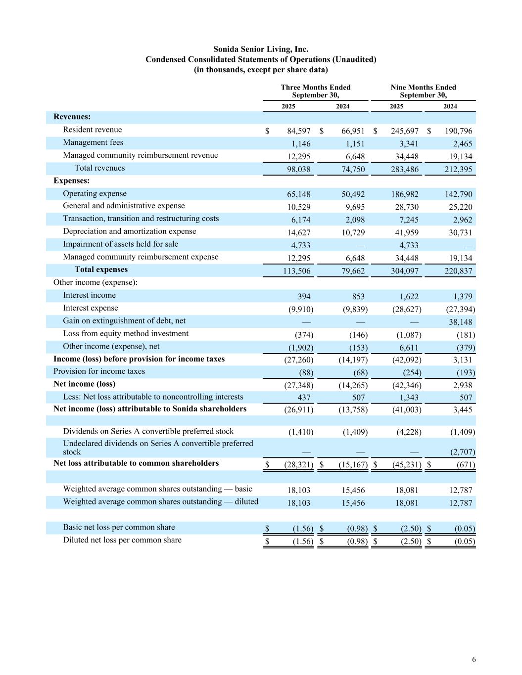 Sonida Senior Living, Inc. Condensed Consolidated Statements of Operations (Unaudited) (in thousands, except per share data) Three Months Ended September 30, Nine Months Ended September 30, 2025 2024 2025 2024 Revenues: Resident revenue $ 84,597 $ 66,951 $ 245,697 $ 190,796 Management fees 1,146 1,151 3,341 2,465 Managed community reimbursement revenue 12,295 6,648 34,448 19,134 Total revenues 98,038 74,750 283,486 212,395 Expenses: Operating expense 65,148 50,492 186,982 142,790 General and administrative expense 10,529 9,695 28,730 25,220 Transaction, transition and restructuring costs 6,174 2,098 7,245 2,962 Depreciation and amortization expense 14,627 10,729 41,959 30,731 Impairment of assets held for sale 4,733 — 4,733 — Managed community reimbursement expense 12,295 6,648 34,448 19,134 Total expenses 113,506 79,662 304,097 220,837 Other income (expense): Interest income 394 853 1,622 1,379 Interest expense (9,910) (9,839) (28,627) (27,394) Gain on extinguishment of debt, net — — — 38,148 Loss from equity method investment (374) (146) (1,087) (181) Other income (expense), net (1,902) (153) 6,611 (379) Income (loss) before provision for income taxes (27,260) (14,197) (42,092) 3,131 Provision for income taxes (88) (68) (254) (193) Net income (loss) (27,348) (14,265) (42,346) 2,938 Less: Net loss attributable to noncontrolling interests 437 507 1,343 507 Net income (loss) attributable to Sonida shareholders (26,911) (13,758) (41,003) 3,445 Dividends on Series A convertible preferred stock (1,410) (1,409) (4,228) (1,409) Undeclared dividends on Series A convertible preferred stock — — — (2,707) Net loss attributable to common shareholders $ (28,321) $ (15,167) $ (45,231) $ (671) Weighted average common shares outstanding — basic 18,103 15,456 18,081 12,787 Weighted average common shares outstanding — diluted 18,103 15,456 18,081 12,787 Basic net loss per common share $ (1.56) $ (0.98) $ (2.50) $ (0.05) Diluted net loss per common share $ (1.56) $ (0.98) $ (2.50) $ (0.05) 6