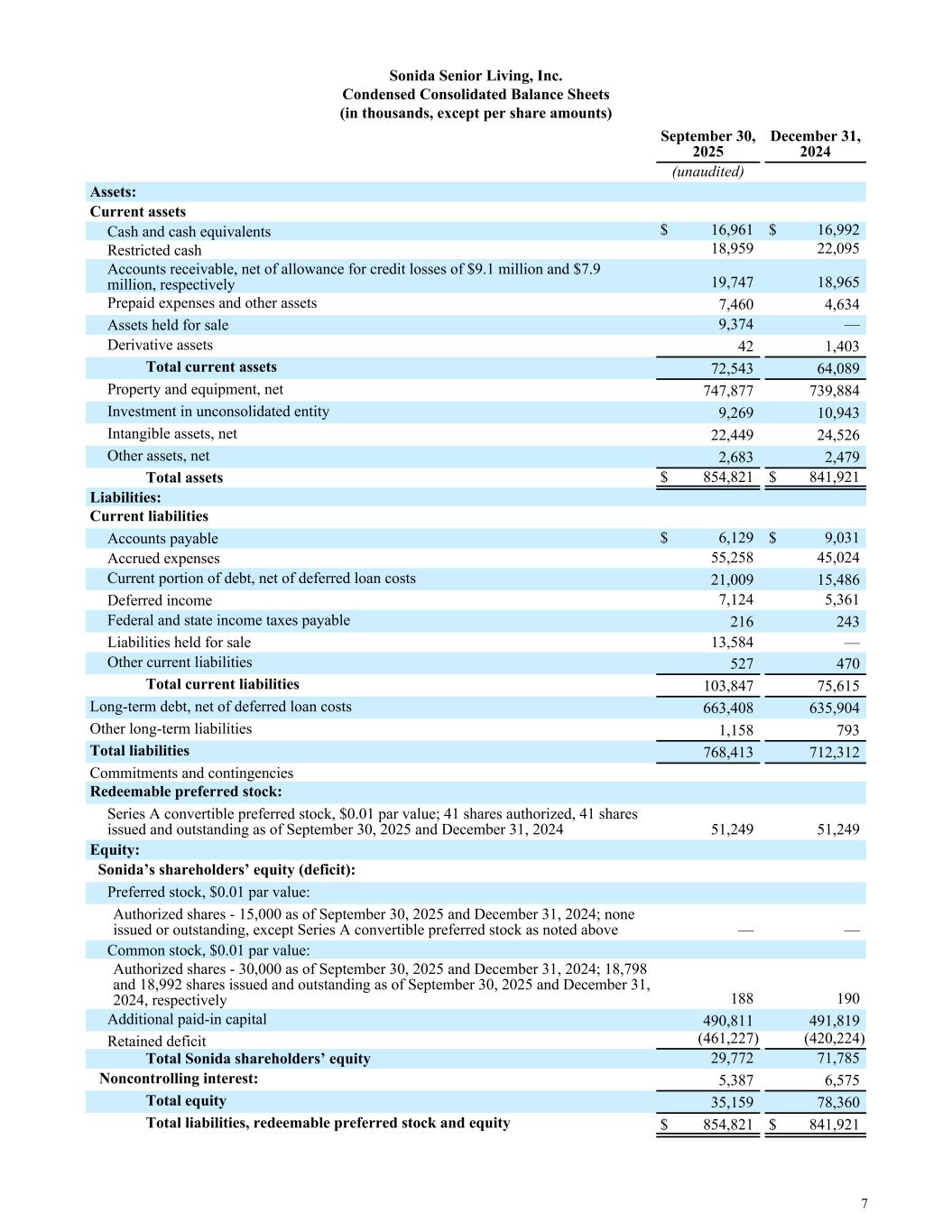 Sonida Senior Living, Inc. Condensed Consolidated Balance Sheets (in thousands, except per share amounts) September 30, 2025 December 31, 2024 (unaudited) Assets: Current assets Cash and cash equivalents $ 16,961 $ 16,992 Restricted cash 18,959 22,095 Accounts receivable, net of allowance for credit losses of $9.1 million and $7.9 million, respectively 19,747 18,965 Prepaid expenses and other assets 7,460 4,634 Assets held for sale 9,374 — Derivative assets 42 1,403 Total current assets 72,543 64,089 Property and equipment, net 747,877 739,884 Investment in unconsolidated entity 9,269 10,943 Intangible assets, net 22,449 24,526 Other assets, net 2,683 2,479 Total assets $ 854,821 $ 841,921 Liabilities: Current liabilities Accounts payable $ 6,129 $ 9,031 Accrued expenses 55,258 45,024 Current portion of debt, net of deferred loan costs 21,009 15,486 Deferred income 7,124 5,361 Federal and state income taxes payable 216 243 Liabilities held for sale 13,584 — Other current liabilities 527 470 Total current liabilities 103,847 75,615 Long-term debt, net of deferred loan costs 663,408 635,904 Other long-term liabilities 1,158 793 Total liabilities 768,413 712,312 Commitments and contingencies Redeemable preferred stock: Series A convertible preferred stock, $0.01 par value; 41 shares authorized, 41 shares issued and outstanding as of September 30, 2025 and December 31, 2024 51,249 51,249 Equity: Sonida’s shareholders’ equity (deficit): Preferred stock, $0.01 par value: Authorized shares - 15,000 as of September 30, 2025 and December 31, 2024; none issued or outstanding, except Series A convertible preferred stock as noted above — — Common stock, $0.01 par value: Authorized shares - 30,000 as of September 30, 2025 and December 31, 2024; 18,798 and 18,992 shares issued and outstanding as of September 30, 2025 and December 31, 2024, respectively 188 190 Additional paid-in capital 490,811 491,819 Retained deficit (461,227) (420,224) Total Sonida shareholders’ equity 29,772 71,785 Noncontrolling interest: 5,387 6,575 Total equity 35,159 78,360 Total liabilities, redeemable preferred stock and equity $ 854,821 $ 841,921 7