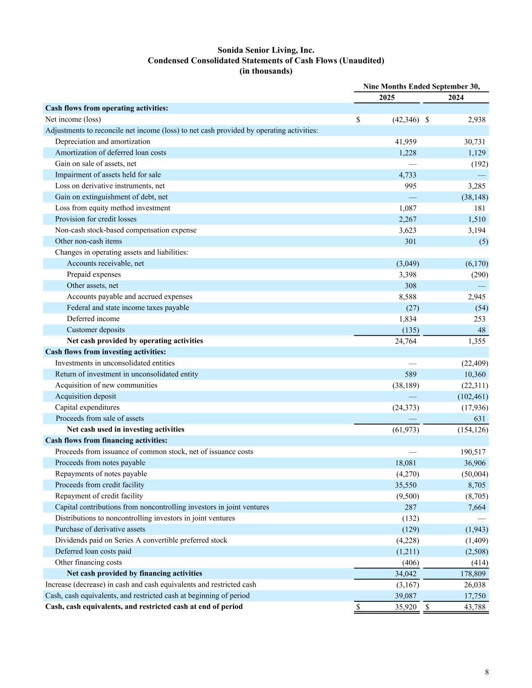 Sonida Senior Living, Inc. Condensed Consolidated Statements of Cash Flows (Unaudited) (in thousands) Nine Months Ended September 30, 2025 2024 Cash flows from operating activities: Net income (loss) $ (42,346) $ 2,938 Adjustments to reconcile net income (loss) to net cash provided by operating activities: Depreciation and amortization 41,959 30,731 Amortization of deferred loan costs 1,228 1,129 Gain on sale of assets, net — (192) Impairment of assets held for sale 4,733 — Loss on derivative instruments, net 995 3,285 Gain on extinguishment of debt, net — (38,148) Loss from equity method investment 1,087 181 Provision for credit losses 2,267 1,510 Non-cash stock-based compensation expense 3,623 3,194 Other non-cash items 301 (5) Changes in operating assets and liabilities: Accounts receivable, net (3,049) (6,170) Prepaid expenses 3,398 (290) Other assets, net 308 — Accounts payable and accrued expenses 8,588 2,945 Federal and state income taxes payable (27) (54) Deferred income 1,834 253 Customer deposits (135) 48 Net cash provided by operating activities 24,764 1,355 Cash flows from investing activities: Investments in unconsolidated entities — (22,409) Return of investment in unconsolidated entity 589 10,360 Acquisition of new communities (38,189) (22,311) Acquisition deposit — (102,461) Capital expenditures (24,373) (17,936) Proceeds from sale of assets — 631 Net cash used in investing activities (61,973) (154,126) Cash flows from financing activities: Proceeds from issuance of common stock, net of issuance costs — 190,517 Proceeds from notes payable 18,081 36,906 Repayments of notes payable (4,270) (50,004) Proceeds from credit facility 35,550 8,705 Repayment of credit facility (9,500) (8,705) Capital contributions from noncontrolling investors in joint ventures 287 7,664 Distributions to noncontrolling investors in joint ventures (132) — Purchase of derivative assets (129) (1,943) Dividends paid on Series A convertible preferred stock (4,228) (1,409) Deferred loan costs paid (1,211) (2,508) Other financing costs (406) (414) Net cash provided by financing activities 34,042 178,809 Increase (decrease) in cash and cash equivalents and restricted cash (3,167) 26,038 Cash, cash equivalents, and restricted cash at beginning of period 39,087 17,750 Cash, cash equivalents, and restricted cash at end of period $ 35,920 $ 43,788 8