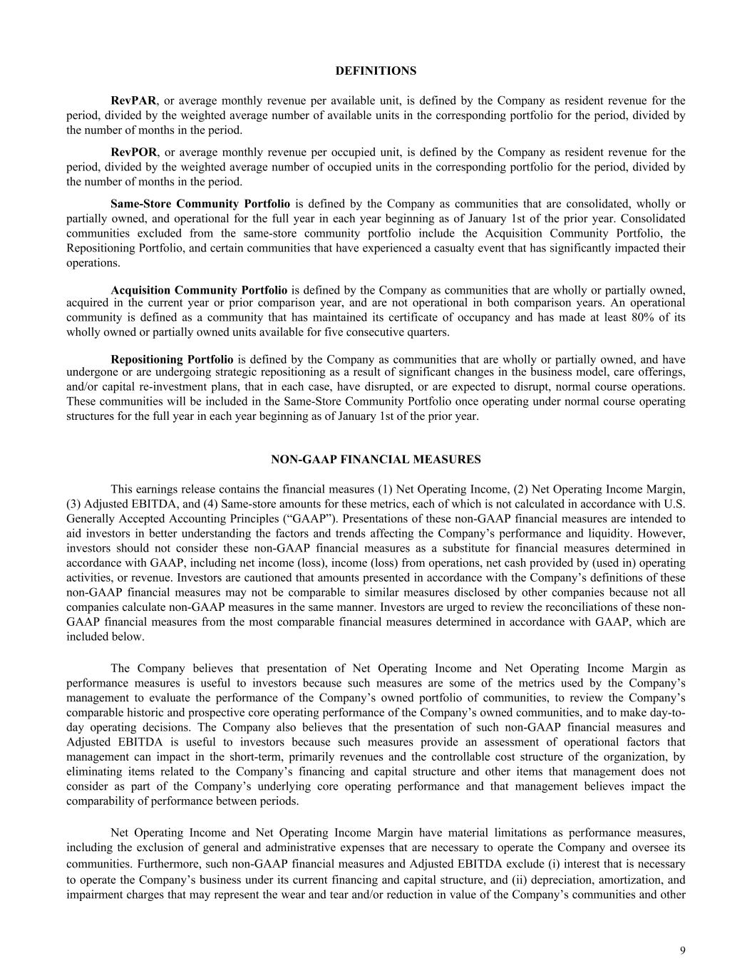 DEFINITIONS RevPAR, or average monthly revenue per available unit, is defined by the Company as resident revenue for the period, divided by the weighted average number of available units in the corresponding portfolio for the period, divided by the number of months in the period. RevPOR, or average monthly revenue per occupied unit, is defined by the Company as resident revenue for the period, divided by the weighted average number of occupied units in the corresponding portfolio for the period, divided by the number of months in the period. Same-Store Community Portfolio is defined by the Company as communities that are consolidated, wholly or partially owned, and operational for the full year in each year beginning as of January 1st of the prior year. Consolidated communities excluded from the same-store community portfolio include the Acquisition Community Portfolio, the Repositioning Portfolio, and certain communities that have experienced a casualty event that has significantly impacted their operations. Acquisition Community Portfolio is defined by the Company as communities that are wholly or partially owned, acquired in the current year or prior comparison year, and are not operational in both comparison years. An operational community is defined as a community that has maintained its certificate of occupancy and has made at least 80% of its wholly owned or partially owned units available for five consecutive quarters. Repositioning Portfolio is defined by the Company as communities that are wholly or partially owned, and have undergone or are undergoing strategic repositioning as a result of significant changes in the business model, care offerings, and/or capital re-investment plans, that in each case, have disrupted, or are expected to disrupt, normal course operations. These communities will be included in the Same-Store Community Portfolio once operating under normal course operating structures for the full year in each year beginning as of January 1st of the prior year. NON-GAAP FINANCIAL MEASURES This earnings release contains the financial measures (1) Net Operating Income, (2) Net Operating Income Margin, (3) Adjusted EBITDA, and (4) Same-store amounts for these metrics, each of which is not calculated in accordance with U.S. Generally Accepted Accounting Principles (“GAAP”). Presentations of these non-GAAP financial measures are intended to aid investors in better understanding the factors and trends affecting the Company’s performance and liquidity. However, investors should not consider these non-GAAP financial measures as a substitute for financial measures determined in accordance with GAAP, including net income (loss), income (loss) from operations, net cash provided by (used in) operating activities, or revenue. Investors are cautioned that amounts presented in accordance with the Company’s definitions of these non-GAAP financial measures may not be comparable to similar measures disclosed by other companies because not all companies calculate non-GAAP measures in the same manner. Investors are urged to review the reconciliations of these non- GAAP financial measures from the most comparable financial measures determined in accordance with GAAP, which are included below. The Company believes that presentation of Net Operating Income and Net Operating Income Margin as performance measures is useful to investors because such measures are some of the metrics used by the Company’s management to evaluate the performance of the Company’s owned portfolio of communities, to review the Company’s comparable historic and prospective core operating performance of the Company’s owned communities, and to make day-to- day operating decisions. The Company also believes that the presentation of such non-GAAP financial measures and Adjusted EBITDA is useful to investors because such measures provide an assessment of operational factors that management can impact in the short-term, primarily revenues and the controllable cost structure of the organization, by eliminating items related to the Company’s financing and capital structure and other items that management does not consider as part of the Company’s underlying core operating performance and that management believes impact the comparability of performance between periods. Net Operating Income and Net Operating Income Margin have material limitations as performance measures, including the exclusion of general and administrative expenses that are necessary to operate the Company and oversee its communities. Furthermore, such non-GAAP financial measures and Adjusted EBITDA exclude (i) interest that is necessary to operate the Company’s business under its current financing and capital structure, and (ii) depreciation, amortization, and impairment charges that may represent the wear and tear and/or reduction in value of the Company’s communities and other 9
