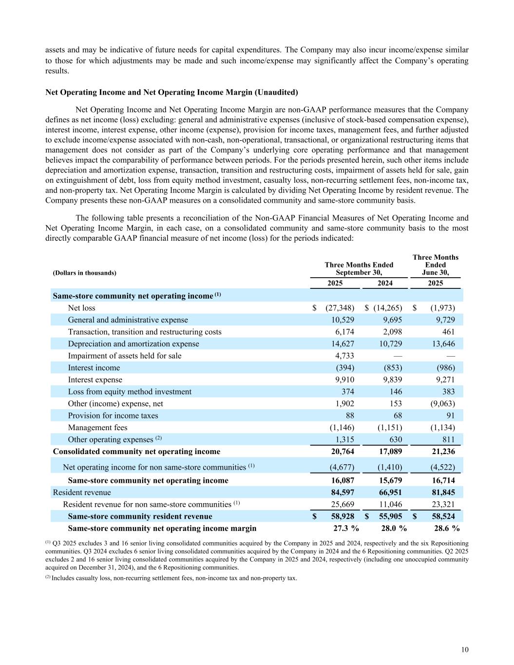 assets and may be indicative of future needs for capital expenditures. The Company may also incur income/expense similar to those for which adjustments may be made and such income/expense may significantly affect the Company’s operating results. Net Operating Income and Net Operating Income Margin (Unaudited) Net Operating Income and Net Operating Income Margin are non-GAAP performance measures that the Company defines as net income (loss) excluding: general and administrative expenses (inclusive of stock-based compensation expense), interest income, interest expense, other income (expense), provision for income taxes, management fees, and further adjusted to exclude income/expense associated with non-cash, non-operational, transactional, or organizational restructuring items that management does not consider as part of the Company’s underlying core operating performance and that management believes impact the comparability of performance between periods. For the periods presented herein, such other items include depreciation and amortization expense, transaction, transition and restructuring costs, impairment of assets held for sale, gain on extinguishment of debt, loss from equity method investment, casualty loss, non-recurring settlement fees, non-income tax, and non-property tax. Net Operating Income Margin is calculated by dividing Net Operating Income by resident revenue. The Company presents these non-GAAP measures on a consolidated community and same-store community basis. The following table presents a reconciliation of the Non-GAAP Financial Measures of Net Operating Income and Net Operating Income Margin, in each case, on a consolidated community and same-store community basis to the most directly comparable GAAP financial measure of net income (loss) for the periods indicated: (Dollars in thousands) Three Months Ended September 30, Three Months Ended June 30, 2025 2024 2025 Same-store community net operating income (1) Net loss $ (27,348) $ (14,265) $ (1,973) General and administrative expense 10,529 9,695 9,729 Transaction, transition and restructuring costs 6,174 2,098 461 Depreciation and amortization expense 14,627 10,729 13,646 Impairment of assets held for sale 4,733 — — Interest income (394) (853) (986) Interest expense 9,910 9,839 9,271 Loss from equity method investment 374 146 383 Other (income) expense, net 1,902 153 (9,063) Provision for income taxes 88 68 91 Management fees (1,146) (1,151) (1,134) Other operating expenses (2) 1,315 630 811 Consolidated community net operating income 20,764 17,089 21,236 Net operating income for non same-store communities (1) (4,677) (1,410) (4,522) Same-store community net operating income 16,087 15,679 16,714 Resident revenue 84,597 66,951 81,845 Resident revenue for non same-store communities (1) 25,669 11,046 23,321 Same-store community resident revenue $ 58,928 $ 55,905 $ 58,524 Same-store community net operating income margin 27.3 % 28.0 % 28.6 % (1) Q3 2025 excludes 3 and 16 senior living consolidated communities acquired by the Company in 2025 and 2024, respectively and the six Repositioning communities. Q3 2024 excludes 6 senior living consolidated communities acquired by the Company in 2024 and the 6 Repositioning communities. Q2 2025 excludes 2 and 16 senior living consolidated communities acquired by the Company in 2025 and 2024, respectively (including one unoccupied community acquired on December 31, 2024), and the 6 Repositioning communities. (2) Includes casualty loss, non-recurring settlement fees, non-income tax and non-property tax. 10