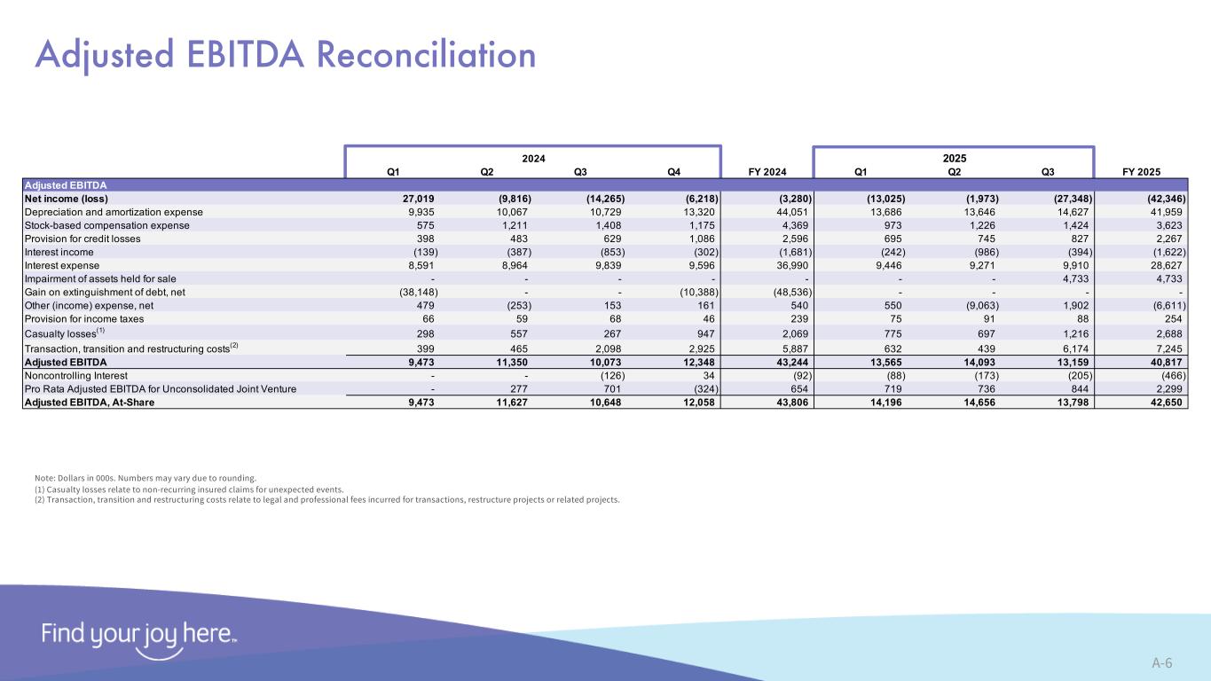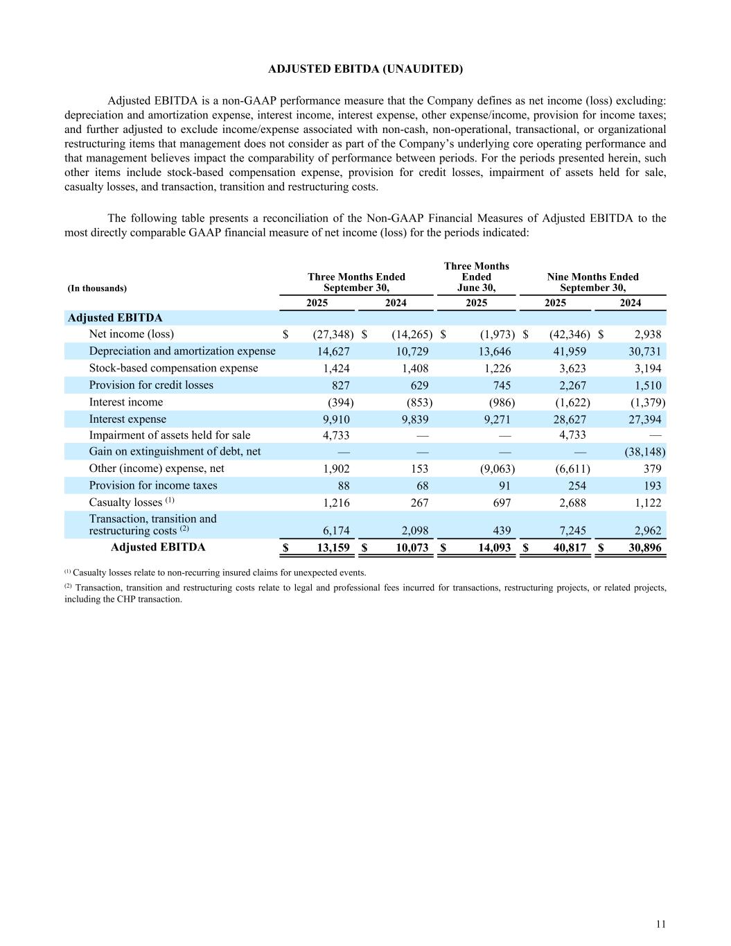 ADJUSTED EBITDA (UNAUDITED) Adjusted EBITDA is a non-GAAP performance measure that the Company defines as net income (loss) excluding: depreciation and amortization expense, interest income, interest expense, other expense/income, provision for income taxes; and further adjusted to exclude income/expense associated with non-cash, non-operational, transactional, or organizational restructuring items that management does not consider as part of the Company’s underlying core operating performance and that management believes impact the comparability of performance between periods. For the periods presented herein, such other items include stock-based compensation expense, provision for credit losses, impairment of assets held for sale, casualty losses, and transaction, transition and restructuring costs. The following table presents a reconciliation of the Non-GAAP Financial Measures of Adjusted EBITDA to the most directly comparable GAAP financial measure of net income (loss) for the periods indicated: (In thousands) Three Months Ended September 30, Three Months Ended June 30, Nine Months Ended September 30, 2025 2024 2025 2025 2024 Adjusted EBITDA Net income (loss) $ (27,348) $ (14,265) $ (1,973) $ (42,346) $ 2,938 Depreciation and amortization expense 14,627 10,729 13,646 41,959 30,731 Stock-based compensation expense 1,424 1,408 1,226 3,623 3,194 Provision for credit losses 827 629 745 2,267 1,510 Interest income (394) (853) (986) (1,622) (1,379) Interest expense 9,910 9,839 9,271 28,627 27,394 Impairment of assets held for sale 4,733 — — 4,733 — Gain on extinguishment of debt, net — — — — (38,148) Other (income) expense, net 1,902 153 (9,063) (6,611) 379 Provision for income taxes 88 68 91 254 193 Casualty losses (1) 1,216 267 697 2,688 1,122 Transaction, transition and restructuring costs (2) 6,174 2,098 439 7,245 2,962 Adjusted EBITDA $ 13,159 $ 10,073 $ 14,093 $ 40,817 $ 30,896 (1) Casualty losses relate to non-recurring insured claims for unexpected events. (2) Transaction, transition and restructuring costs relate to legal and professional fees incurred for transactions, restructuring projects, or related projects, including the CHP transaction. 11