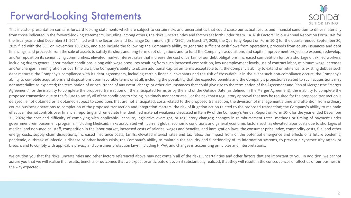 Forward-Looking Statements 2 This investor presentation contains forward-looking statements which are subject to certain risks and uncertainties that could cause our actual results and financial condition to differ materially from those indicated in the forward-looking statements, including, among others, the risks, uncertainties and factors set forth under “Item. 1A. Risk Factors” in our Annual Report on Form 10-K for the fiscal year ended December 31, 2024, filed with the Securities and Exchange Commission (the “SEC”) on March 17, 2025, the Quarterly Report on Form 10-Q for the quarter ended September 30, 2025 filed with the SEC on November 10, 2025, and also include the following: the Company’s ability to generate sufficient cash flows from operations, proceeds from equity issuances and debt financings, and proceeds from the sale of assets to satisfy its short and long-term debt obligations and to fund the Company’s acquisitions and capital improvement projects to expand, redevelop, and/or reposition its senior living communities; elevated market interest rates that increase the cost of certain of our debt obligations; increased competition for, or a shortage of, skilled workers, including due to general labor market conditions, along with wage pressures resulting from such increased competition, low unemployment levels, use of contract labor, minimum wage increases and/or changes in immigration or overtime laws; the Company’s ability to obtain additional capital on terms acceptable to it; the Company’s ability to extend or refinance its existing debt as such debt matures; the Company’s compliance with its debt agreements, including certain financial covenants and the risk of cross-default in the event such non-compliance occurs; the Company’s ability to complete acquisitions and dispositions upon favorable terms or at all, including the possibility that the expected benefits and the Company’s projections related to such acquisitions may not materialize as expected; the termination of or occurrence of any event, change or other circumstances that could give rise to the termination of the Agreement and Plan of Merger (the “Merger Agreement”) or the inability to complete the proposed transaction on the anticipated terms or by the end of the Outside Date (as defined in the Merger Agreement); the inability to complete the proposed transaction due to the failure to satisfy all of the conditions to closing in a timely manner or at all, or the risk that a regulatory approval that may be required for the proposed transaction is delayed, is not obtained or is obtained subject to conditions that are not anticipated; costs related to the proposed transaction; the diversion of management’s time and attention from ordinary course business operations to completion of the proposed transaction and integration matters; the risk of litigation action related to the proposed transaction; the Company’s ability to maintain effective internal controls over financial reporting and remediate the identified material weakness discussed in Item 9A of the Company’s Annual Report on Form 10-K for the year ended December 31, 2024; the cost and difficulty of complying with applicable licensure, legislative oversight, or regulatory changes; changes in reimbursement rates, methods or timing of payment under government reimbursement programs, including Medicaid; risks associated with current global economic conditions and general economic factors such as elevated labor costs due to shortages of medical and non-medical staff, competition in the labor market, increased costs of salaries, wages and benefits, and immigration laws, the consumer price index, commodity costs, fuel and other energy costs, supply chain disruptions, increased insurance costs, tariffs, elevated interest rates and tax rates; the impact from or the potential emergence and effects of a future epidemic, pandemic, outbreak of infectious disease or other health crisis; the Company’s ability to maintain the security and functionality of its information systems, to prevent a cybersecurity attack or breach, and to comply with applicable privacy and consumer protection laws, including HIPAA; and changes in accounting principles and interpretations. We caution you that the risks, uncertainties and other factors referenced above may not contain all of the risks, uncertainties and other factors that are important to you. In addition, we cannot assure you that we will realize the results, benefits or outcomes that we expect or anticipate or, even if substantially realized, that they will result in the consequences or affect us or our business in the way expected.