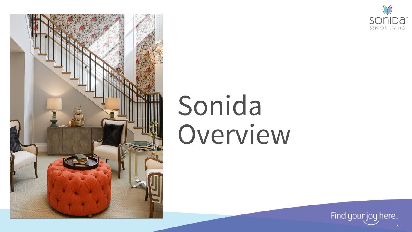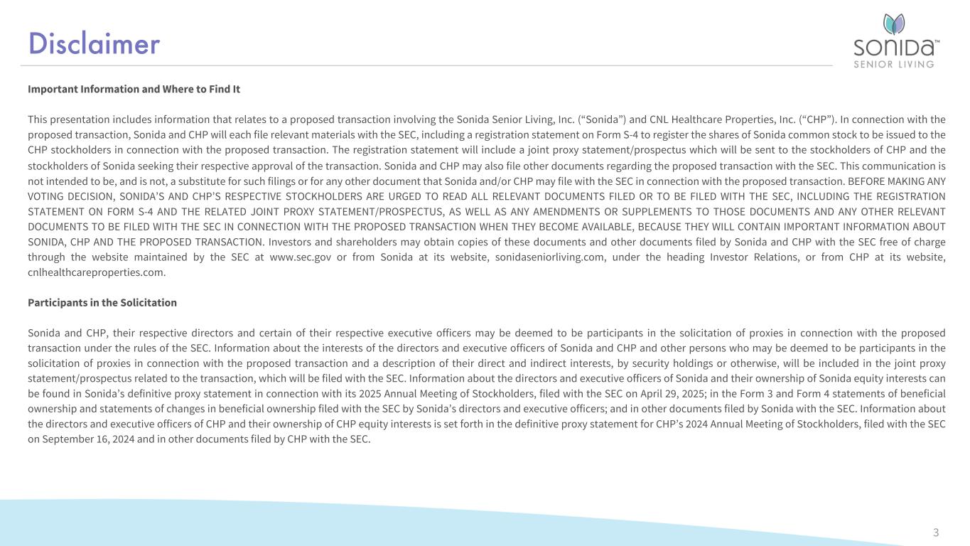 Disclaimer 3 Important Information and Where to Find It This presentation includes information that relates to a proposed transaction involving the Sonida Senior Living, Inc. (“Sonida”) and CNL Healthcare Properties, Inc. (“CHP”). In connection with the proposed transaction, Sonida and CHP will each file relevant materials with the SEC, including a registration statement on Form S-4 to register the shares of Sonida common stock to be issued to the CHP stockholders in connection with the proposed transaction. The registration statement will include a joint proxy statement/prospectus which will be sent to the stockholders of CHP and the stockholders of Sonida seeking their respective approval of the transaction. Sonida and CHP may also file other documents regarding the proposed transaction with the SEC. This communication is not intended to be, and is not, a substitute for such filings or for any other document that Sonida and/or CHP may file with the SEC in connection with the proposed transaction. BEFORE MAKING ANY VOTING DECISION, SONIDA’S AND CHP’S RESPECTIVE STOCKHOLDERS ARE URGED TO READ ALL RELEVANT DOCUMENTS FILED OR TO BE FILED WITH THE SEC, INCLUDING THE REGISTRATION STATEMENT ON FORM S-4 AND THE RELATED JOINT PROXY STATEMENT/PROSPECTUS, AS WELL AS ANY AMENDMENTS OR SUPPLEMENTS TO THOSE DOCUMENTS AND ANY OTHER RELEVANT DOCUMENTS TO BE FILED WITH THE SEC IN CONNECTION WITH THE PROPOSED TRANSACTION WHEN THEY BECOME AVAILABLE, BECAUSE THEY WILL CONTAIN IMPORTANT INFORMATION ABOUT SONIDA, CHP AND THE PROPOSED TRANSACTION. Investors and shareholders may obtain copies of these documents and other documents filed by Sonida and CHP with the SEC free of charge through the website maintained by the SEC at www.sec.gov or from Sonida at its website, sonidaseniorliving.com, under the heading Investor Relations, or from CHP at its website, cnlhealthcareproperties.com. Participants in the Solicitation Sonida and CHP, their respective directors and certain of their respective executive officers may be deemed to be participants in the solicitation of proxies in connection with the proposed transaction under the rules of the SEC. Information about the interests of the directors and executive officers of Sonida and CHP and other persons who may be deemed to be participants in the solicitation of proxies in connection with the proposed transaction and a description of their direct and indirect interests, by security holdings or otherwise, will be included in the joint proxy statement/prospectus related to the transaction, which will be filed with the SEC. Information about the directors and executive officers of Sonida and their ownership of Sonida equity interests can be found in Sonida’s definitive proxy statement in connection with its 2025 Annual Meeting of Stockholders, filed with the SEC on April 29, 2025; in the Form 3 and Form 4 statements of beneficial ownership and statements of changes in beneficial ownership filed with the SEC by Sonida’s directors and executive officers; and in other documents filed by Sonida with the SEC. Information about the directors and executive officers of CHP and their ownership of CHP equity interests is set forth in the definitive proxy statement for CHP’s 2024 Annual Meeting of Stockholders, filed with the SEC on September 16, 2024 and in other documents filed by CHP with the SEC.