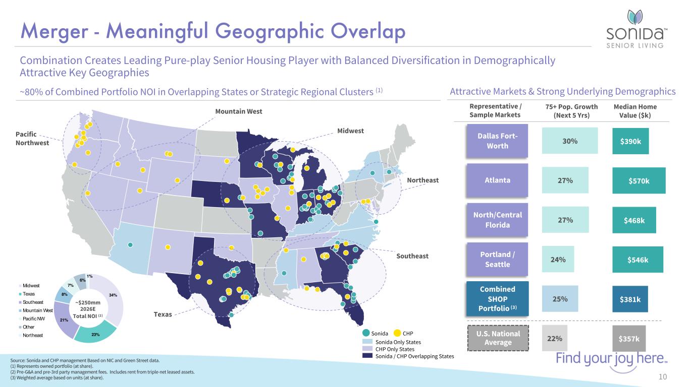 Merger - A New Top 10 U.S. Senior Housing Owner Combination Creates 8th Largest U.S. Senior Housing Owner # Company Properties Units 1 1,067 112,641 2 756 73,570 3 376 32,448 4 180 24,542 5 224 24,173 6 171 17,660 7 146 16,084 8 153 14,696 9 109 14,296 10 18 12,731 9 100% Senior Housing 92% Private Pay $3bn Enterprise Value (3) Source: ASHA Top 50 Owners 2025. Based on pro forma number of units for the combined company. (1) Pro forma unit count based on 84 owned Sonida properties (excludes managed properties) and CHP’s 69 properties (excludes 1 vacant land parcel). (2) Based on Sonida Available Units for 84 owned assets at share (excludes managed properties) plus total CHP units. (3) Includes the Erickson Senior Living CCRCs. (4) Based on Q3’25 YTD NOI. (1) (Private) (Private) (Private) (Private) (% of Pro Forma Company NOI) (4) (2) 85% SHOP NOI