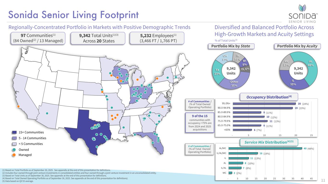 34% 23% 21% 8% 7% 6% 1% !"#$%&' (%)*& +,-'.%*&' !,-/'*"/MN%&' O*P"4"PM5N S'.%T 5,T'.%*&' Merger - Meaningful Geographic Overlap Combination Creates Leading Pure-play Senior Housing Player with Balanced Diversification in Demographically Attractive Key Geographies ~80% of Combined Portfolio NOI in Overlapping States or Strategic Regional Clusters (1) 10 Dallas Fort- Worth Portland / Seattle Atlanta North/Central Florida Attractive Markets & Strong Underlying Demographics Source: Sonida and CHP management Based on NIC and Green Street data. (1) Represents owned portfolio (at share). (2) Pre-G&A and pre-3rd party management fees. Includes rent from triple-net leased assets. (3) Weighted average based on units (at share). 75+ Pop. Growth (Next 5 Yrs) Median Home Value ($k) Representative / Sample Markets U.S. National Average Sonida / CHP Overlapping States Sonida Only States CHP Only States Sonida CHP Southeast Midwest Texas Pacific Northwest Northeast Mountain West Combined SHOP Portfolio (3) ~$250mm 2026E Total NOI (2) 30% 27% 27% 24% 25% 22% $390k $570k $468k $546k $381k $357k