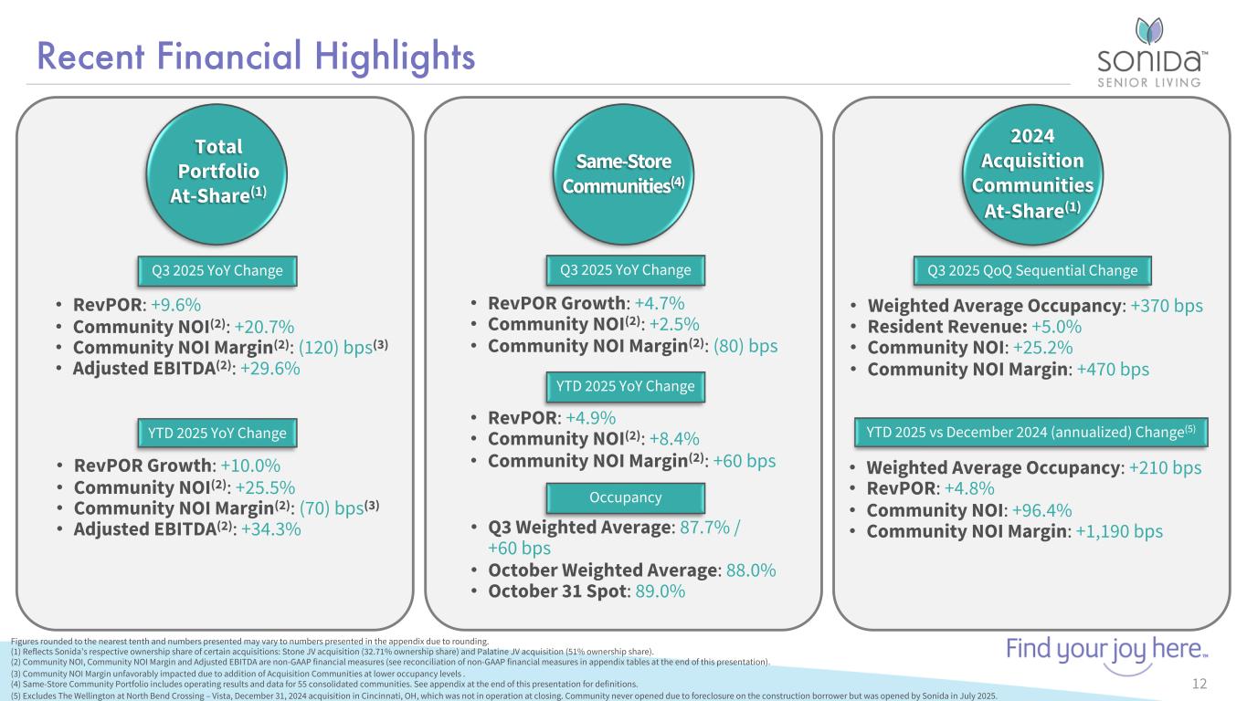 • In September 2025, the Company acquired one senior housing community (98 units) located in Texas. • In August 2025, the Company entered into a senior secured term loan of $137.0 million (“2025 Ally Term Loan”) with Ally Bank which provided an initial term loan advance on the closing date of $122.0 million on 19 communities. Two additional draws of $7.5 million each will become available subject to achieving certain debt yields and debt service coverages ratios. The 2025 Ally Term Loan has a 36-month maturity date (with two one- year extensions) and a variable interest rate of one-month SOFR plus a 2.65% margin (subject to a performance- based stepdown to a 2.45% margin). Subsequent Event Highlights - Strategic Merger Agreement with CNL Healthcare • On November 4, 2025, the Company entered into a definitive agreement and plan of merger (the “Merger Agreement”) with CNL Healthcare Properties, Inc., (“CHP”) and its affiliates, a public non-traded real estate investment trust which owns a national portfolio of 69 high-quality senior housing communities. Under the terms of the Merger Agreement, Sonida will acquire 100% of the outstanding common stock of CHP in a stock and cash transaction valued at approximately $1.8 billion, which equates to $6.90 per share of CHP, with approximately 66% of the consideration expected to be in the form of newly issued Sonida common stock and 34% in cash. Specifically, each share of CHP common stock will be converted into $2.32 in cash and a number of shares of Sonida common stock, determined by dividing (a) $4.58 by (b) the volume weighted average price (“VWAP”) of Sonida common stock during a measurement period prior to closing of the transaction and subject to a collar of 15% below the reference price ($22.73) and 30% above the reference price ($34.76). The merger currently is expected to close late in the first quarter or early in the second quarter of 2026, subject to customary closing conditions, including the approval of both Sonida and CHP shareholders. ______________________________________ 1 Please see “Definitions” on page 9 of this release for the definitions of Same-Store Portfolio, RevPAR, and RevPOR. 2 Please see pages 9-11 of this release for reconciliations of non-GAAP financial measures. 2