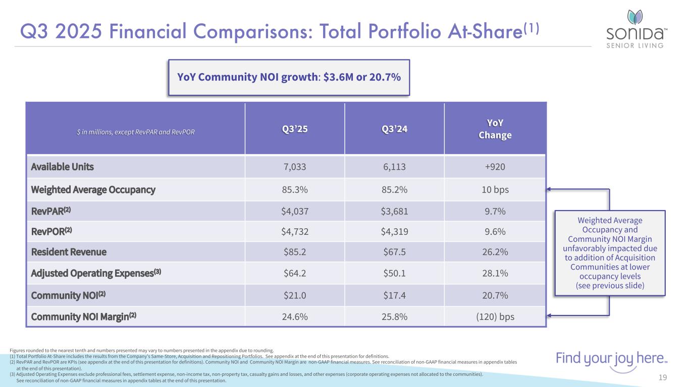 Q3 2025 Financial Comparisons: Acquisition Communities At-Share(1) 18 $ in millions, except RevPAR and RevPOR Q3’25 Q2’25 Sequential Change 79.1% 77.3% 180 bps $4,904 $4,793 2.3% $6,203 $6,205 0.0% $19.8 $17.3 14.5% $14.8 $13.2 12.1% $5.0 $4.1 22.0% 25.3% 23.7% 160 bps Figures rounded to the nearest tenth and numbers presented may vary to numbers presented in the appendix due to rounding. (1) At-Share reflects acquisitions at Sonida’s respective ownership share: Stone JV acquisition (32.71% ownership share) and Palatine JV acquisition (51% ownership share). Acquisition Communities include East Lake, FL (May 30), Alpharetta, GA (June 1) and Mansfield, TX (September 4) as well as The Wellington at North Bend Crossing – Vista, December 31, 2024 acquisition in Cincinnati, OH, which was not in operation at closing. Community never opened due to foreclosure on the construction borrower but was opened by Sonida in July 2025. See appendix at the end of this presentation for definition of Acquisition Communities. (2) Acquisition Communities at-share RevPAR and RevPOR are KPIs (see appendix at the end of this presentation for definitions). Acquisition at-share Community NOI and Community NOI Margin are non-GAAP financial measures. See reconciliation of non-GAAP financial measures in appendix tables at the end of this presentation. (3) Adjusted Operating Expenses exclude professional fees, settlement expense, non-income tax, non-property tax, casualty gains and losses, and other expenses (corporate operating expenses not allocated to the communities). See reconciliation of non-GAAP financial measures in appendix tables at the end of this presentation. Occupancy growth: 180 bps vs Q2’25 Resident Revenue growth: 14.5% vs Q2’25 Community NOI growth: 22.0% vs Q2’25 Q3’25 and Q2’25 include the impact from East Lake, FL (May 30) and Alpharetta, GA (June 1) acquisitions Q3’25 includes the impact from The Wellington at North Bend Crossing – Vista, (opened in July 2025) and Mansfield, TX (September 4) acquisitions