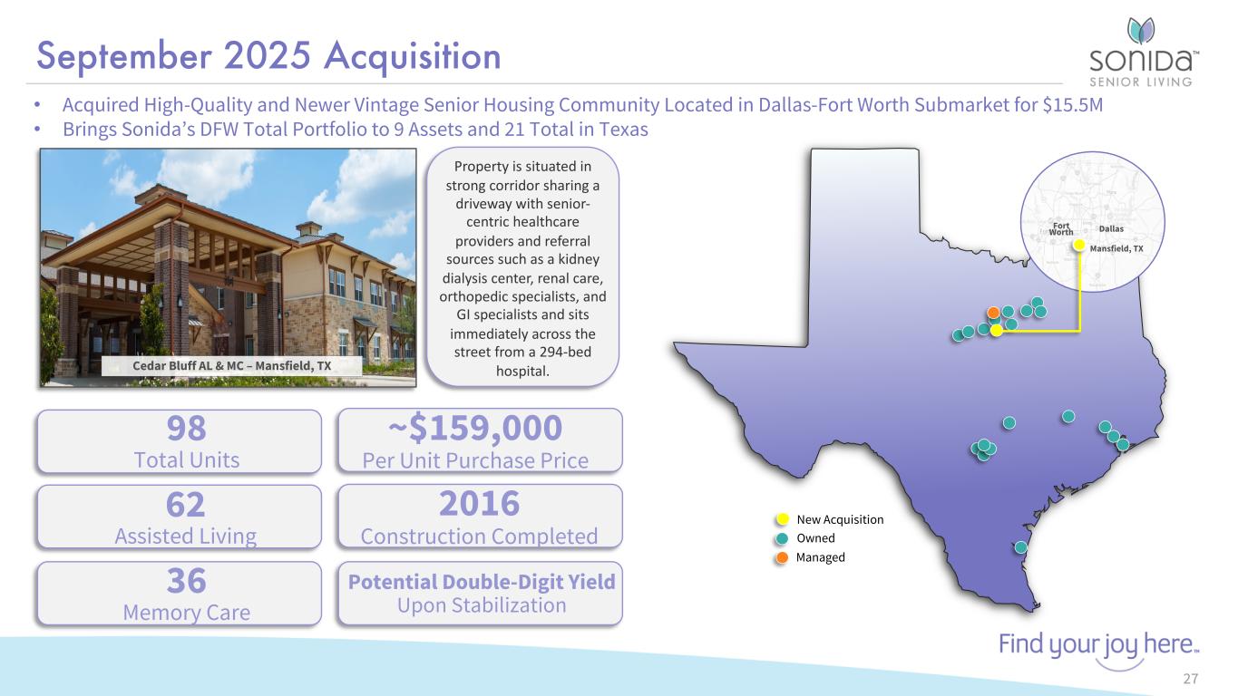 September 2025 Acquisition 27 • Acquired High-Quality and Newer Vintage Senior Housing Community Located in Dallas-Fort Worth Submarket for $15.5M • Brings Sonida’s DFW Total Portfolio to 9 Assets and 21 Total in Texas 62 Assisted Living Managed Owned 98 Total Units 36 Memory Care ~$159,000 Per Unit Purchase Price 2016 Construction Completed Potential Double-Digit Yield Upon Stabilization Cedar Bluff AL & MC – Mansfield, TX Property is situated in strong corridor sharing a driveway with senior- centric healthcare providers and referral sources such as a kidney dialysis center, renal care, orthopedic specialists, and GI specialists and sits immediately across the street from a 294-bed hospital. Mansfield, TX DallasFort Worth New Acquisition