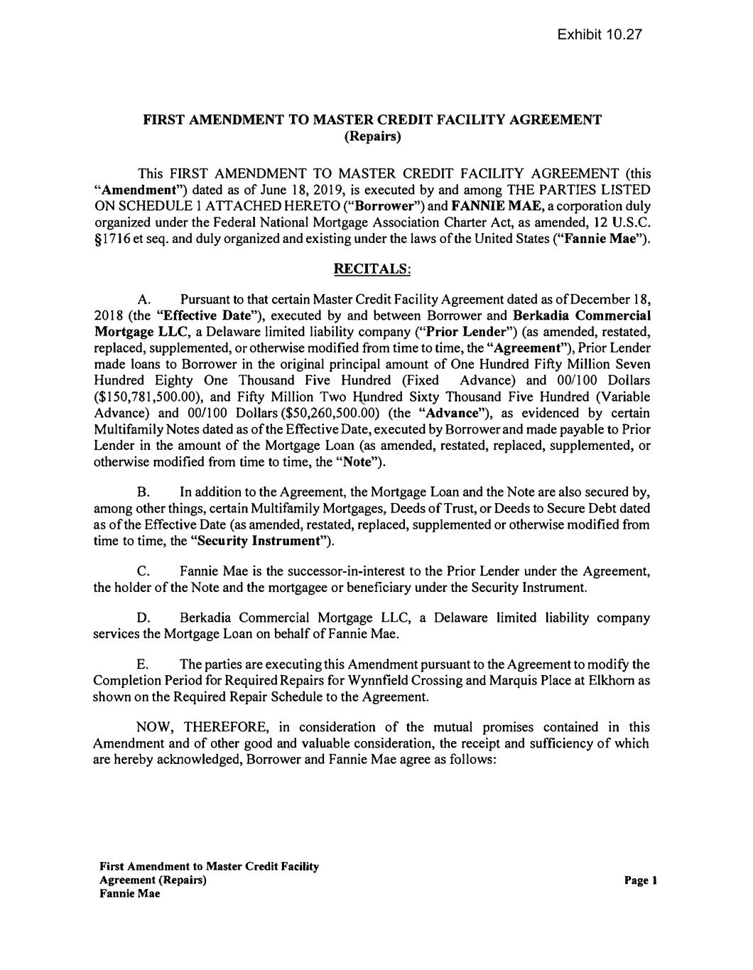 FIRST AMENDMENT TO MASTER CREDIT FACILITY AGREEMENT (Repairs) This FIRST AMENDMENT TO MASTER CREDIT FACILITY AGREEMENT (this "Amendment") dated as of June 18, 2019, is executed by and among THE PARTIES LISTED ON SCHEDULE I A TT ACHED HERETO ("Borrower") and FANNIE MAE, a corporation duly organized under the Federal National Mortgage Association Charter Act, as amended, 12 U.S.C. §1716 et seq. and duly organized and existing under the laws of the United States ("Fannie Mae"). RECITALS: A. Pursuant to that certain Master Credit Facility Agreement dated as of December 18, 2018 (the "Effective Date"), executed by and between Borrower and Berkadia Commercial Mortgage LLC, a Delaware limited liability company ("Prior Lender") (as amended, restated, replaced, supplemented, or otherwise modified from time to time, the "Agreement"), Prior Lender made loans to Borrower in the original principal amount of One Hundred Fifty Million Seven Hundred Eighty One Thousand Five Hundred (Fixed Advance) and 00/100 Dollars ($150,781,500.00), and Fifty Million Two J-lundred Sixty Thousand Five Hundred (Variable Advance) and 00/100 Dollars ($50,260,500.00) (the "Advance"), as evidenced by certain Multifamily Notes dated as of the Effective Date, executed by Borrower and made payable to Prior Lender in the amount of the Mortgage Loan (as amended, restated, replaced, supplemented, or otherwise modified from time to time, the "Note"). B. In addition to the Agreement, the Mortgage Loan and the Note are also secured by, among other things, certain Multifamily Mortgages, Deeds of Trust, or Deeds to Secure Debt dated as of the Effective Date (as amended, restated, replaced, supplemented or otherwise modified from time to time, the "Security Instrument"). C. Fannie Mae is the successor-in-interest to the Prior Lender under the Agreement, the holder of the Note and the mortgagee or beneficiary under the Security Instrument. D. Berkadia Commercial Mortgage LLC, a Delaware limited liability company services the Mortgage Loan on behalf of Fannie Mae. E. The parties are executing this Amendment pursuant to the Agreement to modify the Completion Period for Required Repairs for Wynnfield Crossing and Marquis Place at Elkhorn as shown on the Required Repair Schedule to the Agreement. NOW, THEREFORE, in consideration of the mutual promises contained in this Amendment and of other good and valuable consideration, the receipt and sufficiency of which are hereby acknowledged, Borrower and Fannie Mae agree as follows: First Amendment to Master Credit Facility Agreement (Repairs) Fannie Mae Page I Exhibit 10.27