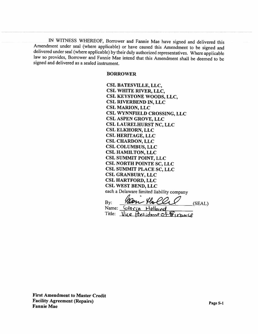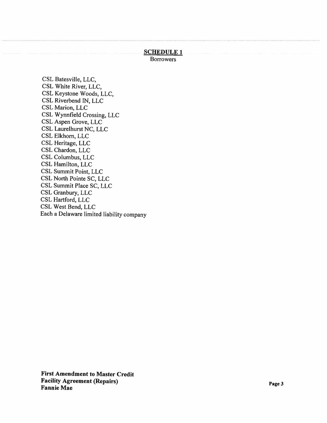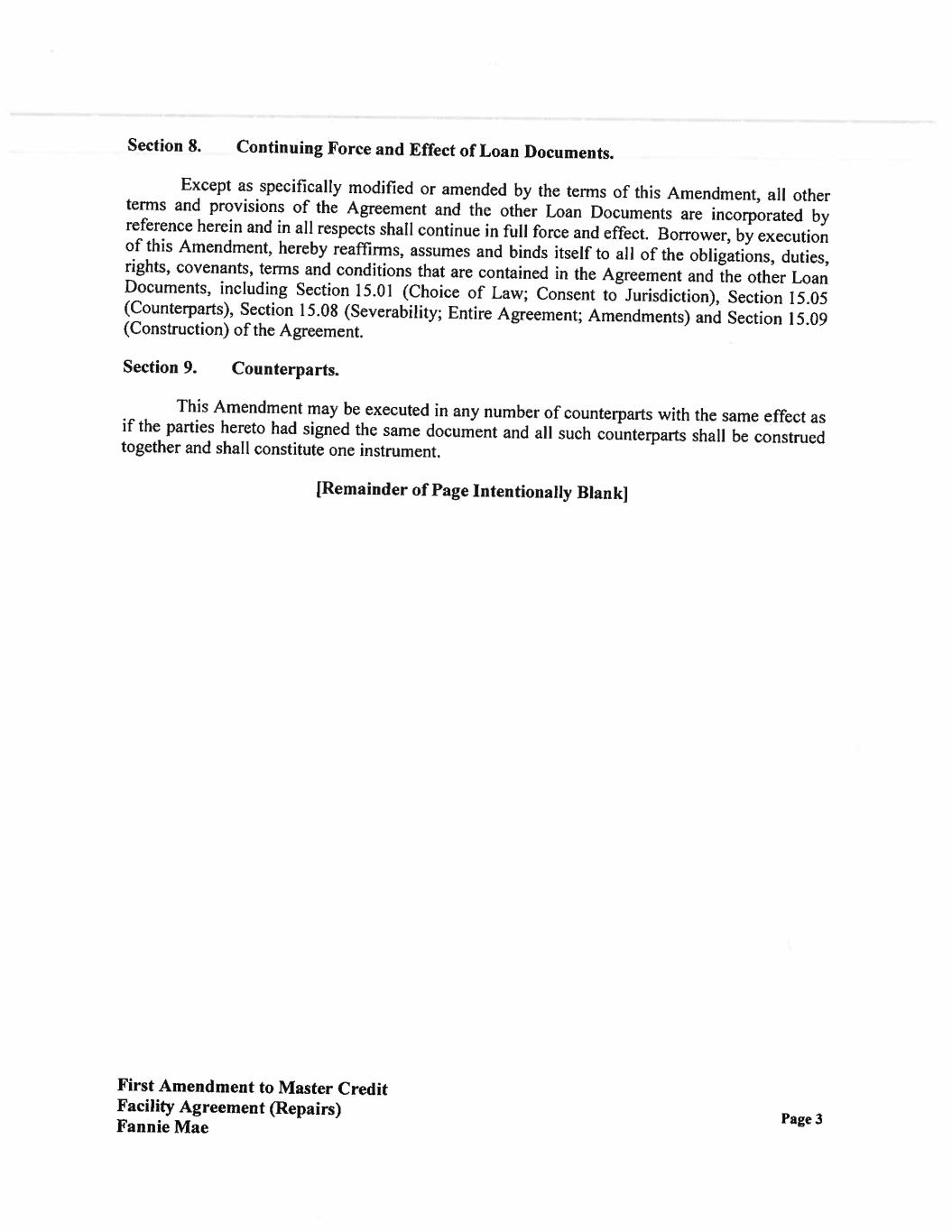 AGREEMENTS: Section 1. Recitals. The recitals set forth above are incorporated herein by reference as if fully set forth in the body of this Amendment. Section 2. Defined Terms. Capitalized terms used and not specifically defined herein shall have the meanings given to such terms in the Agreement. Section 3. Restatement of Required Repair Schedule. The Required Repair Schedule is hereby amended only as to the section that refers to Wynnfield Crossing and Marquis Place at Elkhorn and replaced with the attached language on the attached Supplemental Schedule 6. All other language in the Required Repair Schedule remains unchanged. Section 4. Authorization. Borrower represents and warrants to Fannie Mae that Borrower is duly authorized to execute and deliver this Amendment and is and will continue to be duly authorized to perform its obligations under the Agreement, as amended hereby. Section 5. Compliance with Loan Documents. The representations and warranties set forth in the Loan Documents, as amended hereby, are true and correct with the same effect as if such representations and warranties had been made on the date hereof, except for such changes as are specifically permitted under the Loan Documents. In addition, Borrower has complied with and is in compliance with all of the covenants set forth in the Loan Documents, as amended hereby. Section 6. No Event of Default. Borrower represents and warrants that, as of the date hereof, no Event of Default under the Loan Documents, as amended hereby, or event or condition which, with the giving of notice or the passage of time, or both, would constitute an Event of Default, has occurred and is continuing. Section 7. Costs. Borrower agrees to pay all fees and costs (including attorneys' fees) incurred by Fannie Mae and any Loan Servicer in connection with this Amendment. First Amendment to Master Credit Facility Agreement (Repairs) Fannie Mae Page 2