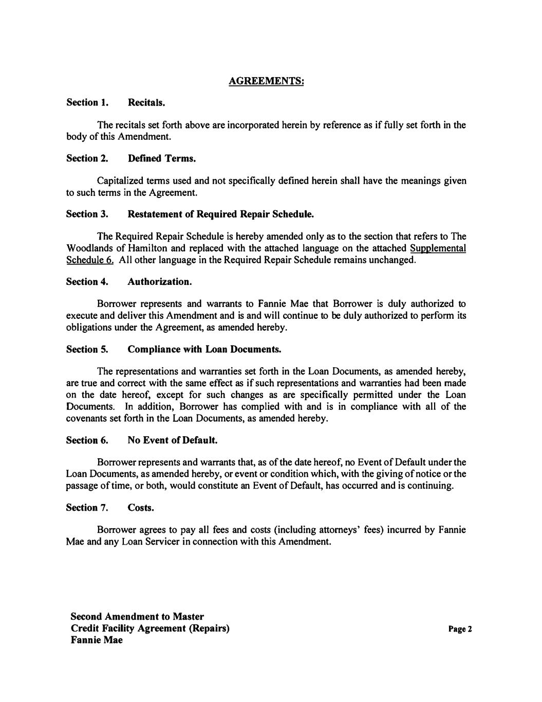 AGREEMENTS: Section 1. Recitals. The recitals set forth above are incorporated herein by reference as if fully set forth in the body of this Amendment. Section 2. Defined Terms. Capitalized terms used and not specifically defined herein shall have the meanings given to such terms in the Agreement. Section 3. Restatement of Required Repair Schedule. The Required Repair Schedule is hereby amended only as to the section that refers to The Woodlands of Hamilton and replaced with the attached language on the attached Supplemental Schedule 6. All other language in the Required Repair Schedule remains unchanged. Section 4. Authorization. Borrower represents and warrants to Fannie Mae that Borrower is duly authorized to execute and deliver this Amendment and is and will continue to be duly authorized to perform its obligations under the Agreement, as amended hereby. Section 5. Compliance with Loan Documents. The representations and warranties set forth in the Loan Documents, as amended hereby, are true and correct with the same effect as if such representations and warranties had been made on the date hereof, except for such changes as are specifically permitted under the Loan Documents. In addition, Borrower has complied with and is in compliance with all of the covenants set forth in the Loan Documents, as amended hereby. Section 6. No Event of Default. Borrower represents and warrants that, as of the date hereof, no Event of Default under the Loan Documents, as amended hereby, or event or condition which, with the giving of notice or the passage of time, or both, would constitute an Event of Default, has occurred and is continuing. Section 7. Costs. Borrower agrees to pay all fees and costs (including attorneys' fees) incurred by Fannie Mae and any Loan Servicer in connection with this Amendment. Second Amendment to Master Credit Facility Agreement (Repairs) Fannie Mae Page2