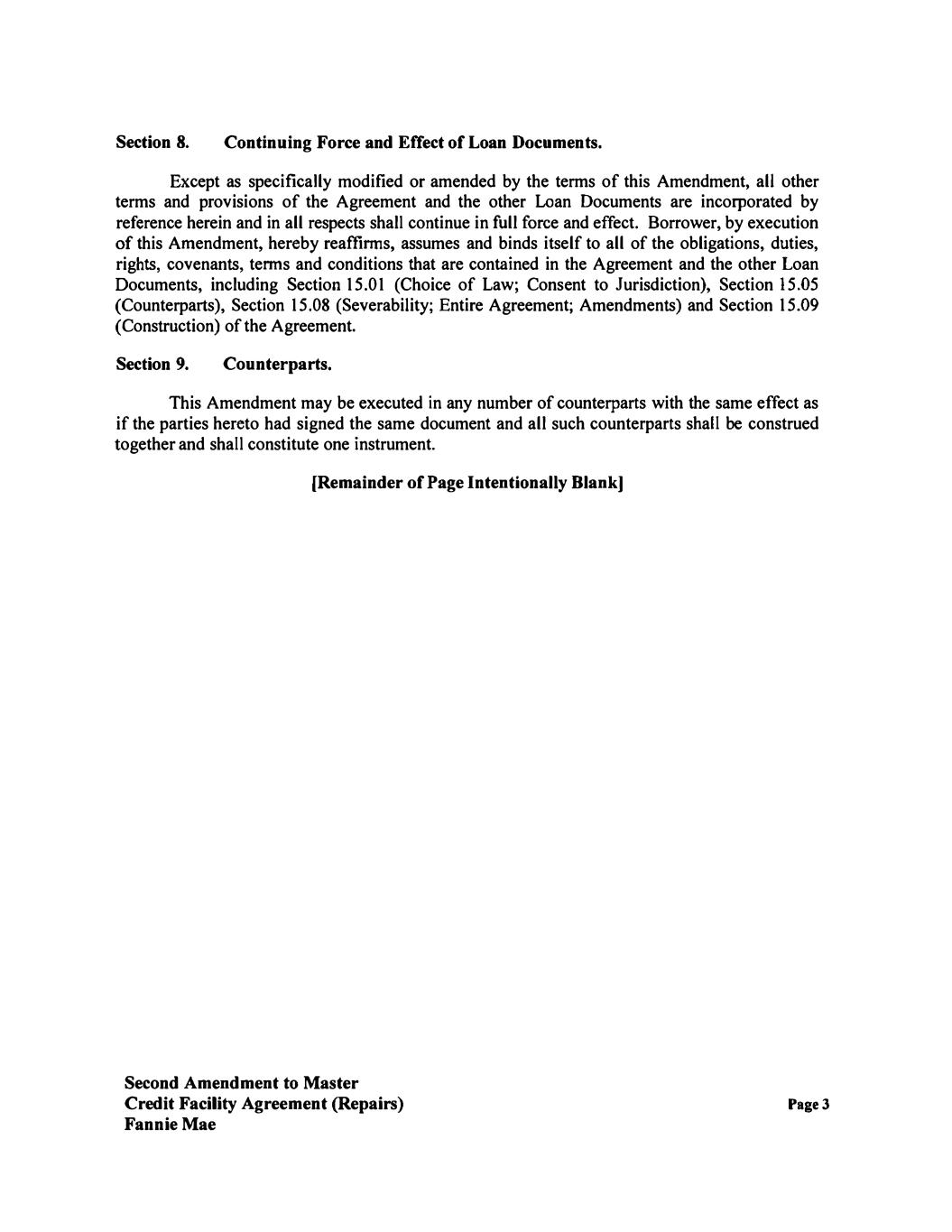 Section 8. Continuing Force and Effect of Loan Documents. Except as specifically modified or amended by the terms of this Amendment, all other terms and provisions of the Agreement and the other Loan Documents are incorporated by reference herein and in all respects shall continue in full force and effect. Borrower, by execution of this Amendment, hereby reaffirms, assumes and binds itself to all of the obligations, duties, rights, covenants, terms and conditions that are contained in the Agreement and the other Loan Documents, including Section 15.01 (Choice of Law; Consent to Jurisdiction), Section 15.05 (Counterparts), Section 15.08 (Severability; Entire Agreement; Amendments) and Section 15.09 (Construction) of the Agreement. Section 9. Counterparts. This Amendment may be executed in any number of counterparts with the same effect as if the parties hereto had signed the same document and all such counterparts shall be construed together and shall constitute one instrument. (Remainder of Page Intentionally Blank] Second Amendment to Master Credit Facility Agreement (Repairs) Fannie Mae Page3