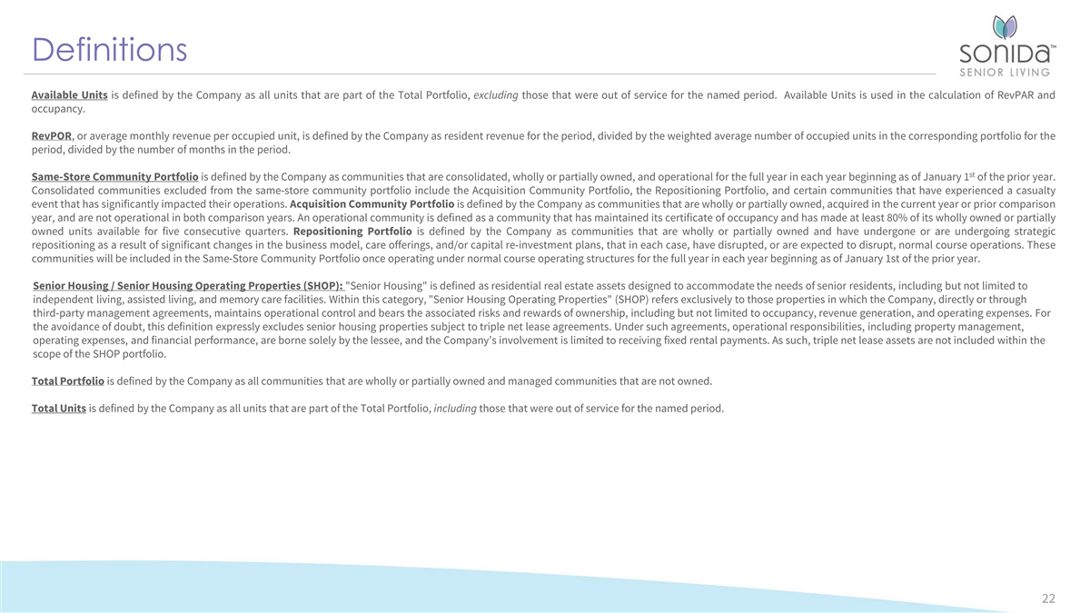Definitions Available Units is defined by the Company as all units that are part of the Total Portfolio, excluding those that were out of service for the named period. Available Units is used in the calculation of RevPAR and occupancy. RevPOR, or average monthly revenue per occupied unit, is defined by the Company as resident revenue for the period, divided by the weighted average number of occupied units in the corresponding portfolio for the period, divided by the number of months in the period. st Same-Store Community Portfolio is defined by the Company as communities that are consolidated, wholly or partially owned, and operational for the full year in each year beginning as of January 1 of the prior year. Consolidated communities excluded from the same-store community portfolio include the Acquisition Community Portfolio, the Repositioning Portfolio, and certain communities that have experienced a casualty event that has significantly impacted their operations. Acquisition Community Portfolio is defined by the Company as communities that are wholly or partially owned, acquired in the current year or prior comparison year, and are not operational in both comparison years. An operational community is defined as a community that has maintained its certificate of occupancy and has made at least 80% of its wholly owned or partially owned units available for five consecutive quarters. Repositioning Portfolio is defined by the Company as communities that are wholly or partially owned and have undergone or are undergoing strategic repositioning as a result of significant changes in the business model, care offerings, and/or capital re-investment plans, that in each case, have disrupted, or are expected to disrupt, normal course operations. These communities will be included in the Same-Store Community Portfolio once operating under normal course operating structures for the full year in each year beginning as of January 1st of the prior year. Senior Housing / Senior Housing Operating Properties (SHOP): Senior Housing is defined as residential real estate assets designed to accommodate the needs of senior residents, including but not limited to independent living, assisted living, and memory care facilities. Within this category, Senior Housing Operating Properties (SHOP) refers exclusively to those properties in which the Company, directly or through third-party management agreements, maintains operational control and bears the associated risks and rewards of ownership, including but not limited to occupancy, revenue generation, and operating expenses. For the avoidance of doubt, this definition expressly excludes senior housing properties subject to triple net lease agreements. Under such agreements, operational responsibilities, including property management, operating expenses, and financial performance, are borne solely by the lessee, and the Company’s involvement is limited to receiving fixed rental payments. As such, triple net lease assets are not included within the scope of the SHOP portfolio. Total Portfolio is defined by the Company as all communities that are wholly or partially owned and managed communities that are not owned. Total Units is defined by the Company as all units that are part of the Total Portfolio, including those that were out of service for the named period. 22